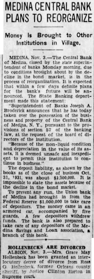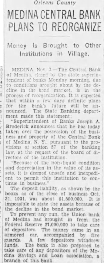 Liability of $1,500,000 The deposit liability, as shown by the books as of the close of business October 31, 1931, is about $1 000. Because of the depreciation in bonds, it is difficult to estimate the bank's assets. is the reorgan ization within of the bank will take place a few days The officers of the Central Bank of Medina are: President F. secretary E. Roland Clark; cashier and assistant cashier, Raymond Fellers. The directors of the bank are the officers and William L. Bennett and Leroy Skinner. Mr Skinner is also the The oldest Union Bank of Medina, one of the banking institutions the country, was also examined by in the state inspectors and found to be in excellent condition. they report This same prevails in the Medina vings & Loan Association, a branch of the Union bank Because fear there might be run on the Union when the news spread about the financial condition of the Central bank an armored car with five arrived in Medina this noon and $1,000,000 was deposited in the Union bank. This was due to the foresight of the Union bank's officers. There were very few withdrawals from the Union bank. Provision has also been made to take care of any from the Medina Savings & Loan Association, officials report.