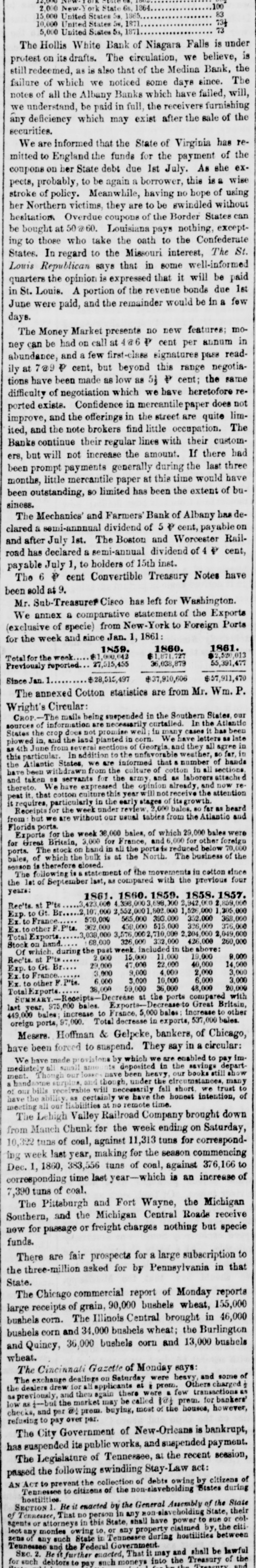 New TOTA 100 2.000 New. ork State 6s. 1364 83 15,000 United States 5a. 1865. 73 10,000 United States 5s, 1871 73 5,000 United States 53, 1871 The Hollis White Bank of Niagara Falls is under protest on its drafts. The circulation, we believe, is still redeemed, as is also that of the Medina Bank, the failure of which we noticed some days since. The notes of all the Albany Banks which have failed, will, we understand, be paid in full, the receivers furnishing any deficiency which may exist after the sale of the securities. We are informed that the State of Virginia has remitted to England the funds for the payment of the coupons on her State debt due 1st July. As she expects, probably, to be again a borrower, this is a wise stroke of policy. Meanwhile, having no hope of using her Northern victims, they are to be swindled without hesitation Overdue coupons of the Border States can be bought at 50@60. Louisiana pays nothing, excepting to those who take the oath to the Confederate States. In regard to the Missouri interest, The St. Louis Republican says that in some well-informed quarters the opinion is expressed that it will be paid in St. Louis. A portion of the revenue bonds due 1st June were paid, and the remainder would be in a few days. The Money Market presente no new features; mo- in can be had on call at 4@6 P cent per annum abundance, ney and a few first-class signatures pass readily at 7@9 P cent, but beyond this range negotiations have been made as low as 51 ₽ cent; the same difficulty of negotiation which we have heretofore reported exists. Confidence in mercantile paper does not improve, and the offerings in the street are quite limited, and the note brokers find little occupation. The Banks continue their regular lines with their customers, but will not increase the amount. If there had been prompt payments generally during the last three months, little mercantile paper at this time would have been outstanding, so limited has been the extent of business. The Mechanics' and Farmers' Bank of Albany bas declared a semi-annuual dividend of 5 & cent, payable on and after July 1st. The Boston and Worcester Railroad has declared a semi-annual dividend of 4 & cent, payable July 1, to holders of 15th inst. The 6 ₽ cent Convertible Treasury Notes have been sold at 9. Mr. Sub-Treasurer Cisco has left for Washington. We annex a comparative statement of the Exports (exclusive of specie) from New-York to Foreign Ports for the week and since Jan. 1, 1861 1861. 1860. 1859. $2,520,013 $ $1,000,042 Total for the week. 55,391,477 36,038,879 Previously reported 27,515,455 $57,911,470 $28,515,497 $37,910,606 Since Jan. 1 The annexed Cotton statistics are from Mr. Wm. P. Wright's Circular: CROP. The mails being suspended in the Southern In the States Atlantic our sources of information are necessarily curtailed. in many cases it has been States the crop does not planted promise in weil; corn. have letters late plowed in, and the several land sections of Georgia. and they all agree far, in in mt 4th June from addition to the unfavorable weather, so this particular. In we are informed that number of hands the Atlantic hdrawn States, from the culture of cotton in all sections, have been and taken as servants for the army and as laborers and attached now re We have expressed the opinion already thereto. that cotton culture this year will not receive the attention it peat requires, it. par particularly in under the early review stages 2,000 of bales. its growth. so far as heard from:but we Receipts for are the without week our usual tables from the Atlantic and Florida ports. for the week 38,000 bales, of which 29,000 bales were Exports Britain, 3,000 for France, and 6,000 for other foreign 70,000 for Great hand in all the ports to reduced below bales, ports. of The which stock the bulk on is at the North. The business of the SERSON is therefore is closed. statement of the movements in cotton since the The lat following of September last, as compared with the previous four years: 1861. 1860. 1859. 1858. 1857. Rec'ts. at P'ts 3,423,000 4.398.0003,698,X 2,942,000 2,107,000 2,552,0001,802.00 1,526 000 1,305,000 368,000 Exp. Gt. Br 570,000 565,000 393.000 352.000 Ex. to France. 515,000 326,000 459,000 376,000 362,000 Ex. to other Pita. 3,039,000 3,576,0002,710,000 2,204,000 2,049,000 Total Exports. 68,000 326.00 332,000 426,000 260,000 Stock on hand week included: the above: Rec'ts P'ts Of which during the past 2,000 15,000 11,000 19,000 9,000 40,000 47,000 22,000 14,000 Ex.to France Exp. to Gt. Br 29,000 3,000 9,000 4,000 2,000 3,000 6,000 3.000 3,000 10,000 6,000 Ex. to other F Pite. 38,000 59,000 36,000 48,000 20,000 TotalExports. Receipts-Decrease at the ports compared Britain, with SUMMARY Exporte- Decrease Great last year, 975,000 increase bales. to France, 5 000 bales increase to other 449,000 ports, bales 97,000. Total decrease in exports, 537,00 bales. oreign Messre. Hoffman & Gelpeke, bankers, of Chicago, have been forced to suspend. They say in a circular: have made provisions by which we are enabled to pay depart- imWe deposited in the books savings still show mediately Though all small have been heavy our many ment. and though under the cumstances, to handsome surplus. will earily fall short we trust of our bills ability receivable as certainly we have the honest intention, of have the all our liabilities no remote time. meeting The Lehigh Valley Railroad Company brought down Manch Chunk for the week ending on Saturday, 10,322 from tuns of coal, against 11,313 tuns for corresponding week last year, making for the season commencing Dec. 1, 1860, 383,556 tuns of coal, against 376,166 to corresponding time last year-which is an increase of 7,390 tuns of coal. The Pittsburgh and Fort Wayne, the Michigan Southern, and the Michigan Central Roads receive now for passage or freight charges nothing but specie funds. There are fair prospects for a large subscription to the three-million asked for by P