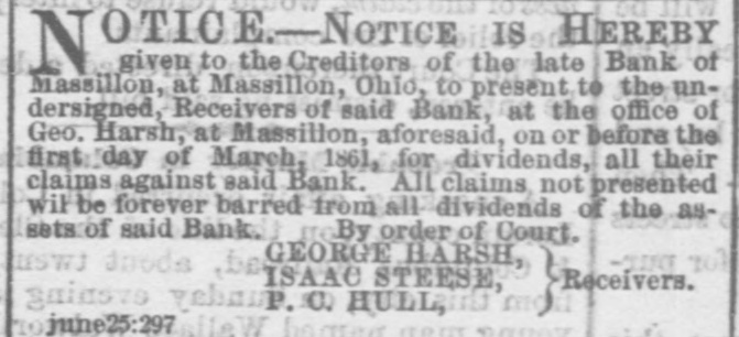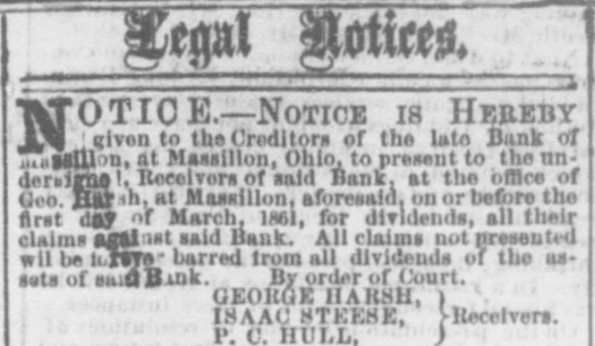 Legal Notices. ASTER COMMISSIONER'S SALE. Pursuant to the command of an alias M decretal order of sale from the Court of Common Pleas of Cuyahoga county at the suit of Edgar Huidekoper against Belden Seymour and others, to me directed, I shall expose for sale at public auction at the door of the Court House, in the city of Oleveland on the 27th day of August, 1860, at 2 'clock P. M., the following described lands and tenements, to wit: Situate in the city of Cleveland and known as th at part of said city of Cleveland which was formerly of the city of Ohio, and being city lots Nos. 3 and in Hiram Stone's subdivision of part of original lot No. 70 in Ohio City, and are situated on Pearl street and being fifty feet front each on said Pearl street. Also two other lots of land known as city lots Nos. 2 and 3 in Hiram Stone's subdivision of the Ward Orchard in the City of Ohio and being each fifty feet, and one hundred and twenty-eight feet deep, and situated upon said Pearl street-reference being had to the map of said allotment 8.8 made by Alhaz Merchant, and recorded in Cuyahoga county for a full description. Lots 3 and 4 appraised at $4,600. Lots 2 and apGEO. H. WYMAN, praised at $3000. Master Com. Carter & Thayer, Att'y for pit july26:298 8. B. & F. J. Prentiss vs. Before M. Miller, J. P. of Charles F. Spang and Cleveland Township, CounJames ulley ty of Cuyahoga, Ohio. partners under the name of Spang & Co. N THE TWENTY-FIRST DAY 0 of July, 1860, said Justice issued an order of attachment in the above action for the sum of twentyfour and dollars, which action will be for hearing September 1, 1860, 2 P. M. S. B.&F. PRENTISS. jy24:296-3w Cleveland, July 23, 1860. HERIFFS SALE-PURSUANT to the command of a writ of venditioni exponas issued from the Court of Common Pleas at the suit of Lloyd & Kaneen, plaintiffs, against the City of Cleveland, defendants, to me directed, I shall offer for sale at public auction, at the Brewery of said plaintiffs, on Pittsburgh street (fronting Jackson street) in the City of Cleveland, in said county, on the 31st day of July, 1860, at 2 o'clock P, M., one onehorse beer wagon, and one malt mill and apparatuse belonging thereunto. D. L. WIGHTMAN, Sheriff. G. L. Ingersoll, Agent. july20:295 Gilbert & Goodwin, plaintiffs, Before S. Foljambe, J.P. of Cleveland against twp., Cuyhoga Hartley Smith, defendant. TTACHMENT.-ON THE 10TH day of July, 1860, said Justice issued an order A of attachmer in the above action for the sum of six dollars and fifty-three cents, and the time set for the trial of said case is August 27th, 1860, at 1 o'clock P. GILBERT & GOODWIN. M. Cleveland, July 16, 1860:295 Perry Prenties, plaintiff Before E. Hessenmuelagainst ler,J. P. of Cleveland Joseph Bowry, township, Cuyahoga Lewis J. Bowry, and Edward A. Bowry, deCounty, Ohio. fendants. N THE NINTH DAY OF JULY 1860, said Justice issued an order of attach0 ment in the above action for the sum of twenty-four and 72-100 dollars. Said cause will be heard August 22d, 1860, at 9 clock A. M. P. PRENTISS. july13:d1taw3t294 JOTICE.-NOTICE IS HEREBY given to the Creditors of the late Bank of Massillon, at Massillon, Ohio, to present to the undersigned, Receivers of said Bank, at the office of Geo. Harsh, at Massillon, aforesaid, on or before the first day of March, 1861, for dividends, all their claims against said Bank. All claims not presented will be forever barred from all dividends of the asBy order of Court. sets of said Bank. GEORGE HARSH, Receivers. ISAAC STEESE, P. C. HULL, june25:297 HERIFF'S SALE.-By VIRTUE of & writ of Fieri Facias issued from the Court of Common Pieas of Cuyahoga county, at the suit of Henry D. Kendall, et. al. plaintiffs, against Hyppolyte Mole, et, defendants, I have levied upón and shall offer for sale, at public auction, at the store lately occupied by 3aid Mole, on Lorain street, (near city limits) in the Township of Brooklyn, in said county, on the 5th day of July, 1860, at 2 o'clock P. M., the stock of goods now in said store, consisting of Dry Goods, Groceries, Millinery, Ready-Made Clothing, Hats, Caps, Crockery, Hardware, Yankee Notions, Scales, weights, Measures,s &c. Said sale to continue from day to day until comD. L. WIGHTMAN, pleted. Sheriff. C. W. Palmer, Pitff's Att'y. june23 W Henry Rebert