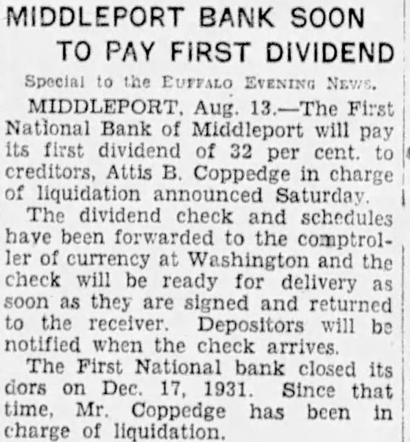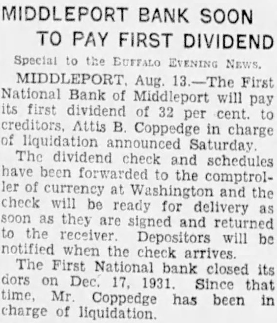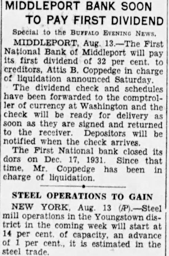 Special to the EVENING MIDDLEPORT Aug. First National will pay its first of 32 per cent. creditors, Coppedge in charge liquidation Saturday The dividend check and schedules have been forwarded the comptroller of currency at and the check will ready for delivery as soon they are signed and returned to the will be notified when the The bank its on Dec 1931 Since that time, Mr Coppedge has been in charge liquidation
