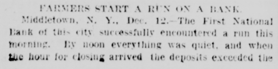 FARMERS START A RUN ON A BANK Middletown, N. Y., Dec. 12.-The First National Bank of this city successfully encountered a run this morning. By noon everything was quiet, and when the hour for closing arrived the deposits exceeded the