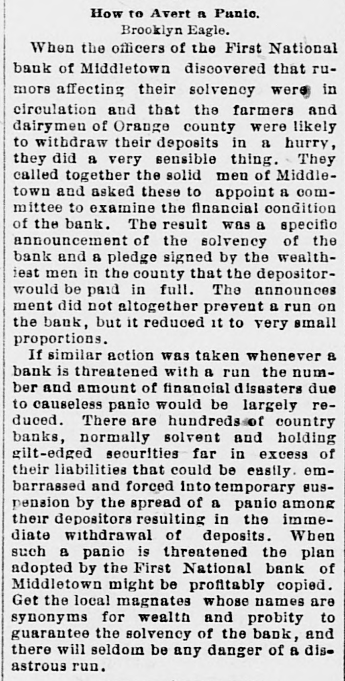 How to Avert a Panic. Brooklyn Eagle. When the officers of the First National bank of Middletown discovered that rumors affecting their solvency were in circulation and that the farmers and dairymen of Orange county were likely to withdraw their deposits in a hurry, they did a very sensible thing. They called together the solid men of Middletown and asked these to appoint a committee to examine the financial condition of the bank. The result was a specific announcement of the solvency of the bank and a pledge signed by the wealthiest men in the county that the depositorwould be paid in full. The announces ment did not altogether prevent a run on the bank, but it reduced it to very small proportions. If similar action was taken whenever a bank is threatened with a run the number and amount of financial disasters due to causeless panic would be largely reduced. There are hundreds of country banks, normally solvent and holding gilt-edged securities far in excess of their liabilities that could be easily. embarrassed and forced into temporary suspension by the spread of a panio among their depositors resulting in the immediate withdrawal of deposits. When such a panic is threatened the plan adopted by the First National bank of Middletown might be profitably copied. Get the local magnates whose names are synonyms for wealth and probity to guarantee the solvency of the bank, and there will seldom be any danger of a disastrous run.