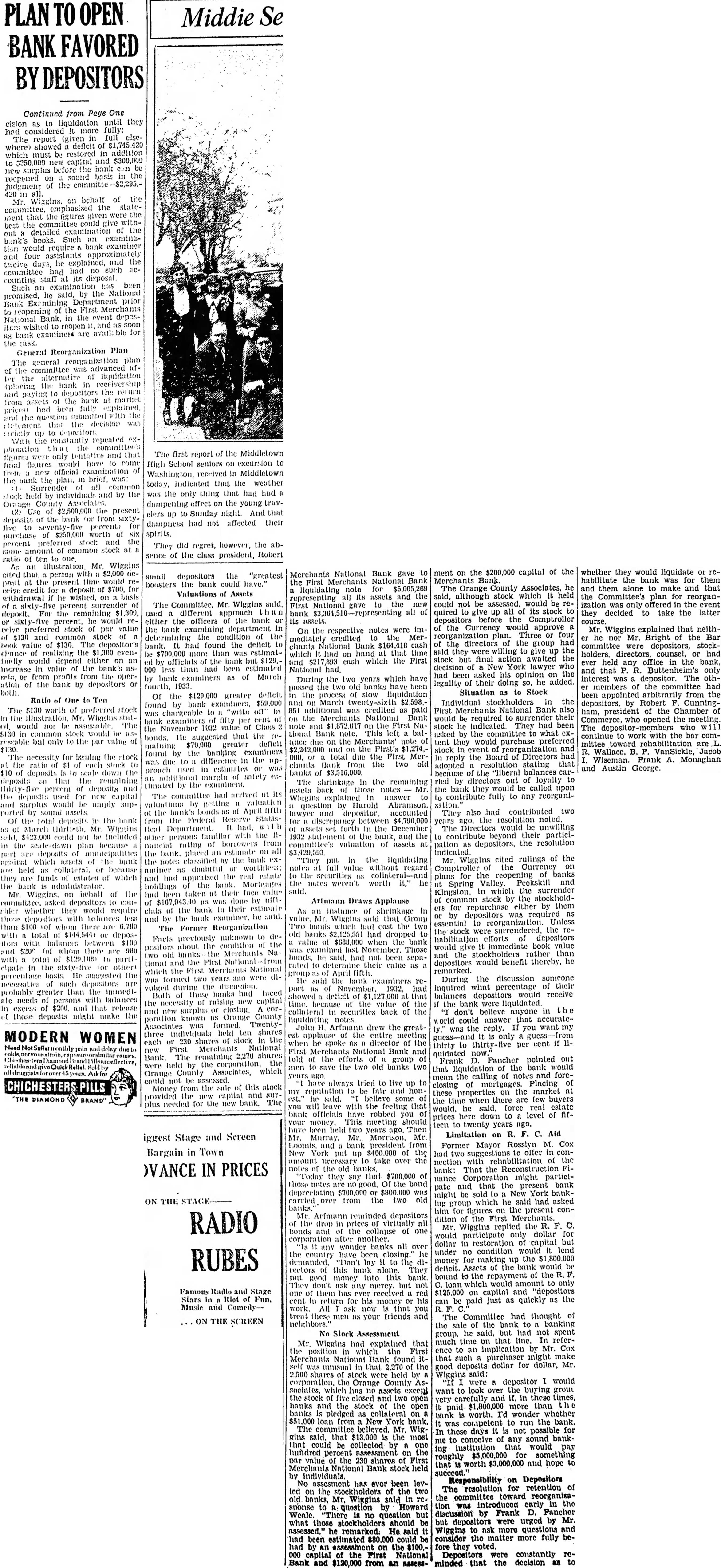 PLAN BANK FAVORED Continued from Page One cision as to liquidation until they had considered more fully: in full elseThe report (given where) showed deficit which must restored in addition to $250.000 capital and $300,000 surplus before bank recpened sound basis in the judgment of the Mr. Wiggins. on behalf of the the statecommittee. emphasized ment that figures given were the could give withbest the committee examination of the detailed books. Such examinabank's tion would require bank examiner four assistants approximately and tweive days. he explained, and the committee had had no such accounting staff at its disposal. Such an examination has been promised. he said. by the National Bank Department prior reopening the First Merchants National Bank. the event deposwished reopen soon bank examiners are available for the task. General Reorganization Plan The general reorganization plan the committee WAS advanced afalternative of liquidation the (placing the bank in receivership and to depositors the return assets the bank at market had been fully the question submitted the that the decision was up depositors With the constantly repeated excommittee's planation figures only and that final Deures would have to come from official of the bank the plan, in brief, Surrender all common stock held and by the Orange County Associates. Use $2,500,000 the present deposits of the bank from sixtyfor five of $250,000 worth of six percent stock and the amount of common stock at of As illustration Mr. Wiggins that person $2,000 posit at the time would for deposit of $700, for withdrawal if he wished. on basis percent deposit. For the $1,300, percent. he would preferred stock of par value $130 and common stock of book value of $130. The depositor's chance realizing the evenwould depend either on increase In value the bank's nsor from pronts from the operation of the bank by depositors or Ratio of One to Ten The $130 worth of preferred stock would not assessable The $130 in common stock would be reseable but only to the par value of The necessity for Issuing the tock the ratto of each stock to $10 of deposits scale down the rieposits that the remaining percent of deposits deposits used for capital surplus would amply supby sound of total deposits In the bank of March thirtieth. Mr. Wiggins the seale-down plan because part are deposits against assets of the bank held or because they are funds estates of which bank administrator Mr Wiggins. behalf of the committee. depositors to conwhether they would require depositors with balances less than $100 of whom there 6.780 with total of $144,544) or deposHors balances between $100 $200 (of there are 980 total of $129,188 to partielpate in for other) percentage basis He suggested the necessities of such depositors are probably grenter than the immedineeds of persons with balances excess of $200 and that release of those deposits might make the small depositors the boosters the bank could have.' Valuations of Assets The Committee. Mr. Wiggins sald. used different approach either the officers the bank or the bank examining department in determining the condition of the bank. had found the deficit to be $700,000 more than was estimatby officials of the bank but $129.000 less than had been estimated bank examiners as of March by fourth, 1933. or the $129,000 greater deficit found by bank examiners, $59,000 was chargeable to "write off by examiners of fifty per cent the 1932 Class He suggested that the bonds. maining $70,000 greater deficit found by the banking examiners was due to difference In the "ppronch in estimates or was timated by the examiners. The committee had arrived Its by getting valuatic of the bonds of from the Federal Reserve Statisother fumiliar with the nancial ruting of borrowers from the bank. placed estimate all the notes classified by the bank doubtful the real estate and had appraised holdings of the bank. Morteages had taken their face value of was by offi clais of the bank in their estimate and by the bank examiner. he said. The Former Reorganization Facts previously unknown to dethe condition of the positors about banks the Merchants two old tional and the First National from which the First Merchants National were formed two vulged during the banks had faced Both of those the necessity raising new capital corsurplus closing and new poration known Orange County was formed. TwentyAssociates three individuals held ten shares shares of stock the each 230 Merchants National new First remaining 2.270 shares Bank. The the were held by County which Orange could not be Money from the of this stock provided the enpital and surfor the new bank. The needed Merchants National Bank gave to Merchants National Bank the First liquidating note $5,005,269 representing all its assets and the First National gave the new bank all of On the respective notes were imcredited the Mermediately chants National Bank cash which had hand at that on and $217,893 cash which the First National During the two years which have passed two old banks have been in the process slow liquidation and on March 851 additional credited as paid the Merchants National Bank note and $1,872,617 on the First NaLional Bank note. This left ance due on the Merchants' note of and on the First's 000, or total due the First MerBank the two old banks $3,516,000. The shrinkage In the remaining assets back those notes Mr. Wiggins explained answer to question by Harold lawyer depositor. accounted for discrepancy between $4,790,000 of forth In the December 1932 statement the bank, and the valuation of assets at "They put In the liquidating notes full value without regard to the securities the notes weren't worth it," he Arfmann Draws Applause As Instance of shrinkage In Mr. Wiggins sald that Group Two bonds which had cost the two old banks had dropped to value of $688,000 when the bank was last November. Those bonds. he said, had not been separated their value as April He said the bank examiners report N