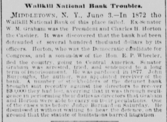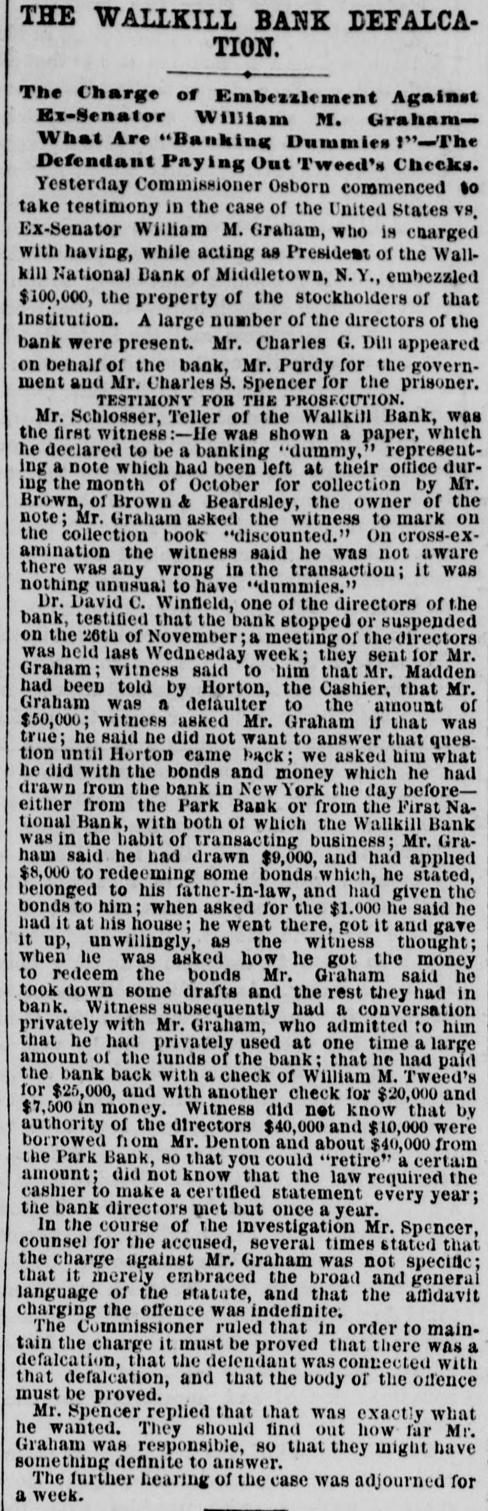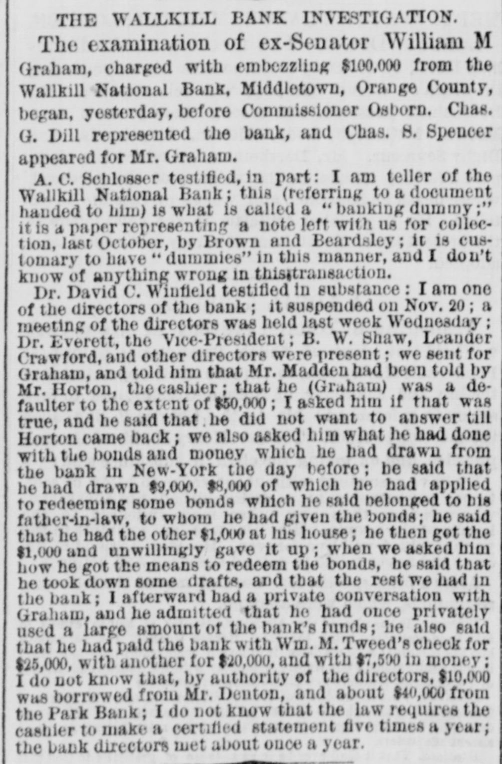 Judge Benedict here suggested that, as conviction on any one count of the indictment would be sufficient, it would be better for the Government not to go into all of the counts at first. Acting upon the Judge's suggestion, Mr. Purdy said that he would for the present take up the count charging Graham with paying to the Market Savings Bank $11,917 25 of the funds of the Wallkill National Bank, and the following witnesses testified in behalf of the prosecution: