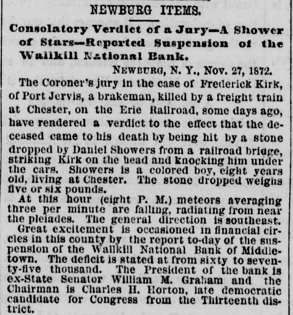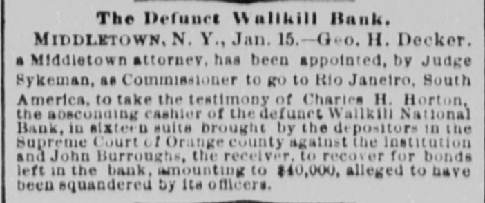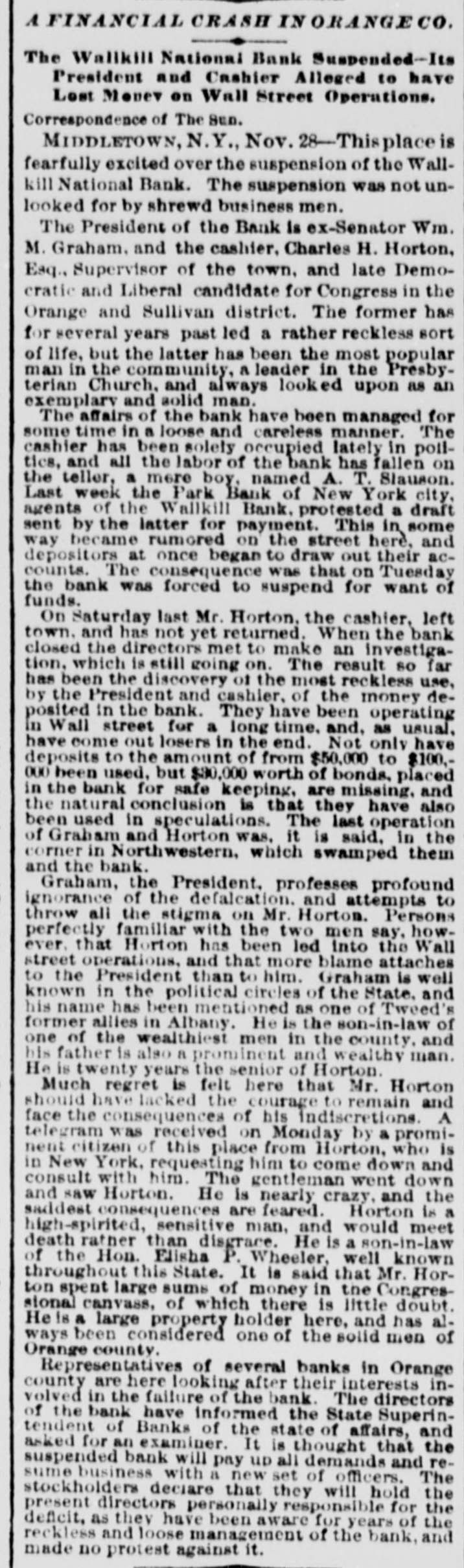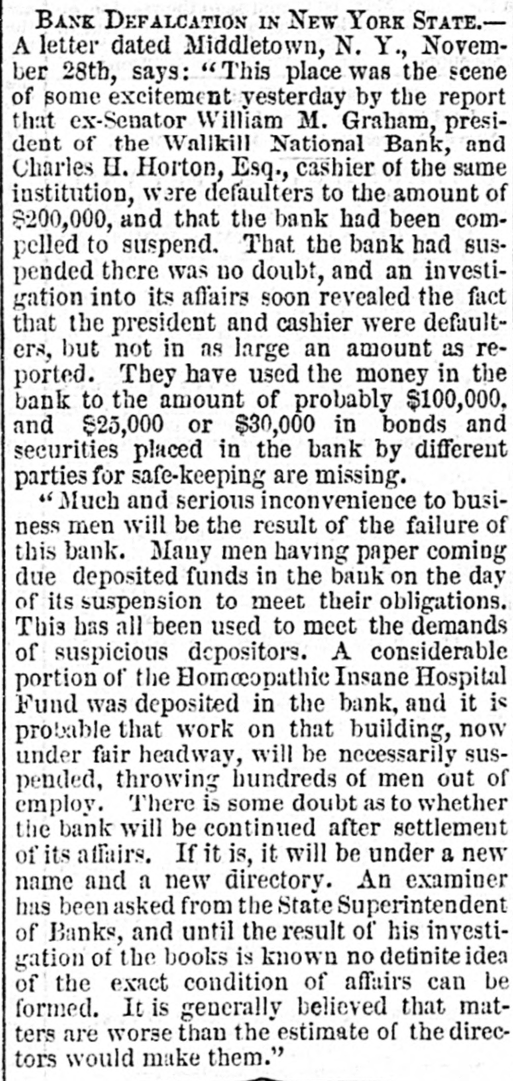 Judge Benedict here suggested that, as conviction on any one count of the indictment would be sufficient, it would be better for the Government not to go into all of the counts at first. Acting upon the Judge's suggestion, Mr. Purdy said that he would for the present take up the count charging Graham with paying to the Market Savings Bank $11,917 25 of the funds of the Wallkill National Bank, and the following witnesses testified in behalf of the prosecution: