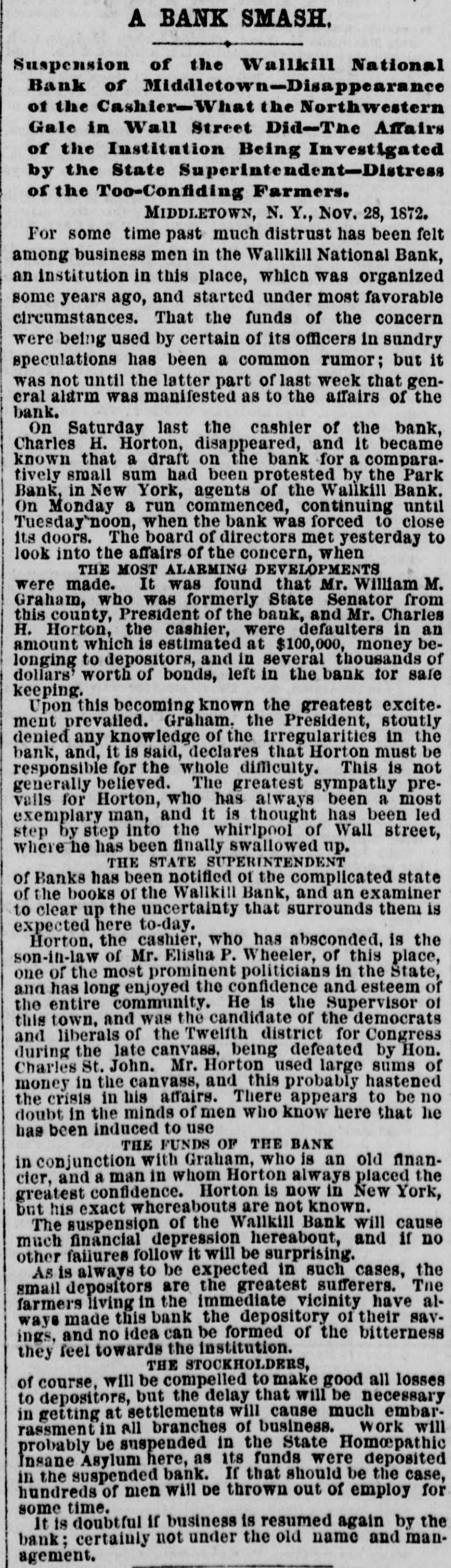 The prisoner is indicted under Section 55 of the Na- tional Bank act, which says "that every President, director, cashier, teller, or agent, of any association who shall embezzle, abstract, or willfully misapply any of the moneys, funds, or credits of the association, or shall, without authority from the directors, issue or put in cir- culation any of the notes of the association shall be deemed guilty of a misdemeanor, and upon convic- tion thereof shall be punished by imprisonment not less than five nor more than 10 years." The prisoner is in- dicted for converting and misapplying the funds of the Wallkill National Bank. It is always difficult to prove such charges except by surrounding circumstances; but the circumstances of this case point so clearly to the guilt of the prisoner that it does not seem possible for him to escape conviction. We shall show you that when the bank suspended the directors made an examination of its affairs, and found that its entire capital, amounting to $123,000, and $25,000 in deposits, had dis- appeared, with the exception of about $600. On that day, Nov. 23, 1872, the directors also discovered that Horton, the cashier, had absconded, that Graham was absent, and that the bank was in charge of a boy. It will also appear that, in the first instance, Graham embezzled the securities of the Wallkill National Bank for the purpose of negotiating a call loan from the Market Savings Bank, and that he afterward illegally withdrew from the First National Bank money deposited to the credit of the Wallkill National Bank, to take up the securities left in the Market Savings Bank for the call loan referred to. The investigation of the affairs of the bank shows, going back as it does through a series of years, that Graham was as guilty as the cashier. In February, 1871, the bank was in an in- solvent condition, and the Controller of the Currency wrote to Mr. Graham saying that the affairs of the bank were almost bad enough to justify its suspension, and that, for the future, they must be properly attended to. I propose to select a few of the many transactions of the Wallkill National Bank and submit them to the jury, so that they may perfectly understand this case. I shall show by the evidence that Graham and the cashier kept a stock account with Jay Cooke & Co., and that checks were drawn on the funds of the Wallkill National Bank to the amount of $10,000, and were applied on that account. Now the books of that bank show no such account, and yet it appears from them that the money was paid to Jay Cooke & Co. It will further appear that Graham indorsed a large num- ber of notes left at the bank for collection, sold them to a Mr. Gallaudet, and put the proceeds in his own pocket: that Mr. Conklin of the Market Savings Bank, Mr. Gra- ham, and Mr. Horton, the cashier of the Wallkill Na- tional Bank, engaged in stock speculations; that their accounts were kept in the former bank; that Graham's account was kept in his own name, and that he took certain securities left in the Wallkill National Bank and deposited them in the Market Savings Bank as securities for his call loans. After Conklin had left that bank, Graham took from it his securities to the amount of $11,917 25. On Jan. 26, 1872, Graham drew a check for that amount and paid it to the Market Savings Bank; but it was not credited to that bank until almost a month after.