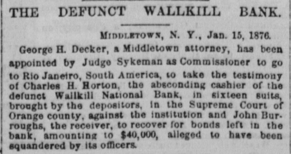 B. A. McDonald testified-I am an accountant expert, and I have examined the affairs of the Wallkill National Bank; on Feb. 19, 1872, I found a check in that bank for $11,917 25: it was charged to no one, but was credited to the First National Bank; in the books of the Wallkill National Bank I found no account with the Market Savings Bank.