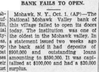 BANK FAILS TO OPEN. Mohawk, N. Oct. National Mohawk Valley bank of this failed to open its doors today. The was one the oldest in the valley. issued two weeks ago the bank had deposits $900,000 and loans amounting $590,000. capitalized $100,000 and had $20,000 surplus.