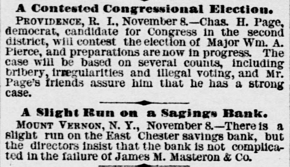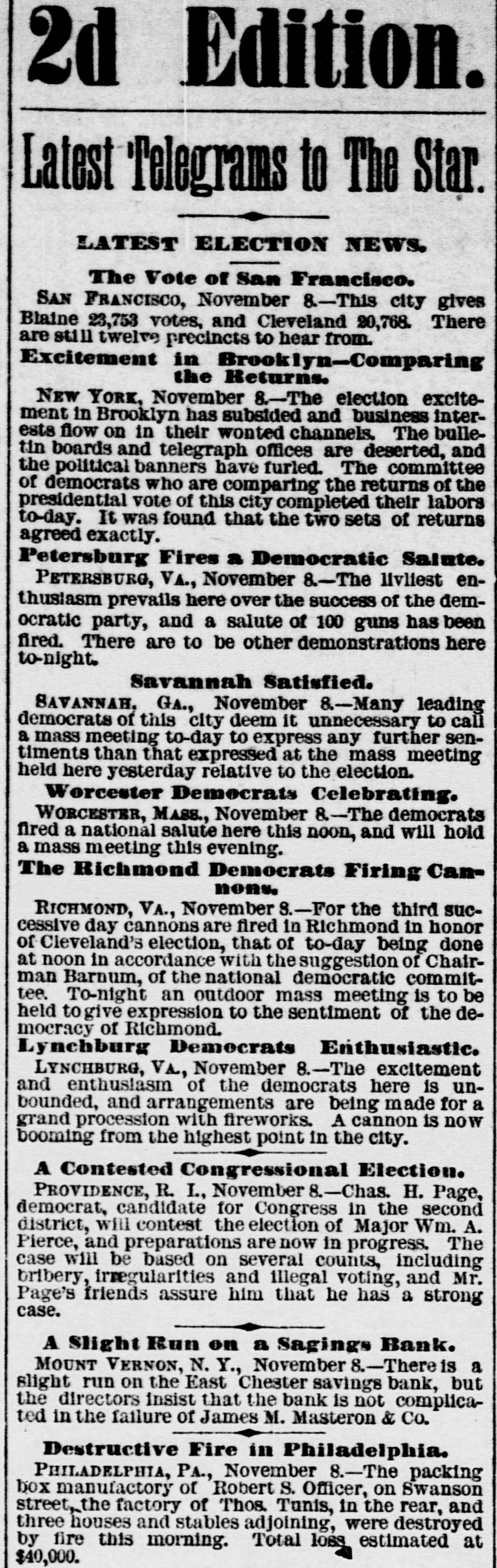 2d Edition. Latest Telegrams to The Star. LATEST ELECTION NEWS. The Vote of San Francisco. SAN FRANCISCO, November 8.-This city gives Blaine 23,753 votes, and Cleveland 20,768. There are still twelve precincts to hear from. Excitement in Brooklyn-Comparing the Returns. NEW YORK, November 8.-The election excitement in Brooklyn has subsided and business interests flow on in their wonted channels. The bulletin boards and telegraph offices are deserted, and the political banners have furled. The committee of democrats who are comparing the returns of the presidential vote of this city completed their labors to-day. It was found that the two sets of returns agreed exactly. Petersburg Fires a Democratic Salute. PETERSBURG, va., November 8.-The livliest enthusiasm prevails here over the success of the democratic party, and a salute of 100 guns has been fired. There are to be other demonstrations here to-night. Savannah Satisfied. SAVANNAH, GA., November 8.-Many leading democrats of this city deem it unnecessary to call a mass meeting to-day to express any further sentiments than that expressed at the mass meeting held here yesterday relative to the election. Worcester Democrats Celebrating. WORCESTER, Mass., November 8.-The democrats fired a national salute here this noon, and will hold a mass meeting this evening. The Richmond Democrats Firing Cannons. RICHMOND, VA., November 8.-For the third successive day cannons are fired in Richmond in honor of Cleveland's election, that of to-day being done at noon in accordance with the suggestion of Chairman Barnum, of the national democratic committee. To-night an outdoor mass meeting is to be held togive expression to the sentiment of the democracy of Richmond. Lynchburg Democrats Enthusiastic. LYNCHBURG, va., November 8.-The excitement and enthuslasm of the democrats here is unbounded, and arrangements are being made for a grand procession with fireworks. A cannon is now booming from the highest point in the city. A Contested Congressional Election. PROVIDENCE, R. I., November 8.-Chas. H. Page, democrat, candidate for Congress in the second district, will contest the election of Major Wm. A. Pierce, and preparations are now in progress. The case will be based on several counts, including bribery, irregularities and illegal voting, and Mr. Page's friends assure him that he has a strong case. A Slight Run on a Sagings Bank. MOUNT VERNON, N. Y., November 8.-There is a slight run on the East Chester savings bank, but the directors insist that the bank is not complicated in the failure of James M. Masteron & Co. Destructive Fire in Philadelphia. Philadelphia, PA., November 8.-The packing box manufactory of Robert S. Officer, on Swanson street, the factory of Thos. Tunis, in the rear, and three houses and stables adjoining, were destroyed by fire this morning. Total loss estimated at $40,000.