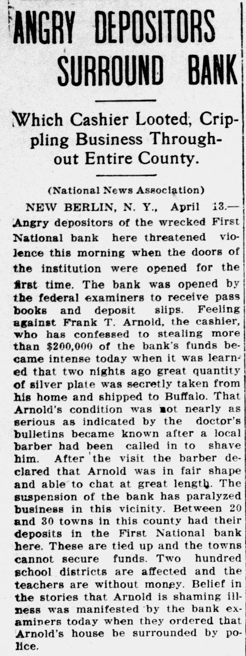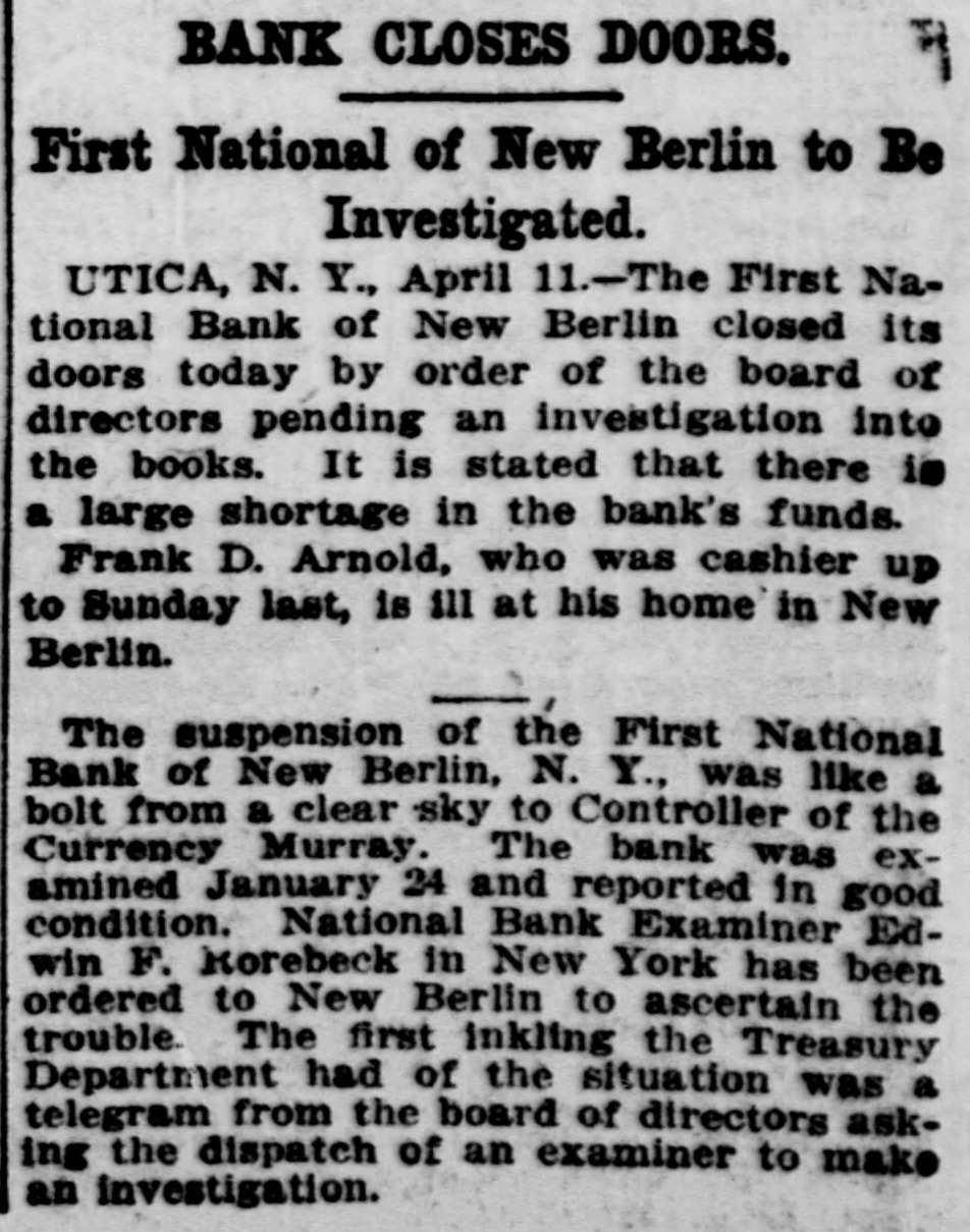 BANK CLOSES DOORS. First National of New Berlin to Be Investigated. UTICA, N. Y., April 11.-The First National Bank of New Berlin closed its doors today by order of the board of directors pending an investigation into the books. It is stated that there is a large shortage in the bank's funds. Frank D. Arnold, who was cashier up to Sunday last, is ill at his home in New Berlin. The suspension of the First National Bank of New Berlin, N. Y., was like a bolt from a clear sky to Controller of the Currency Murray. The bank was examined January 24 and reported in good condition. National Bank Examiner Edwin F. Rorebeck in New York has been ordered to New Berlin to ascertain the trouble. The first inkling the Treasury Department had of the situation was a telegram from the board of directors asking the dispatch of an examiner to make an investigation.