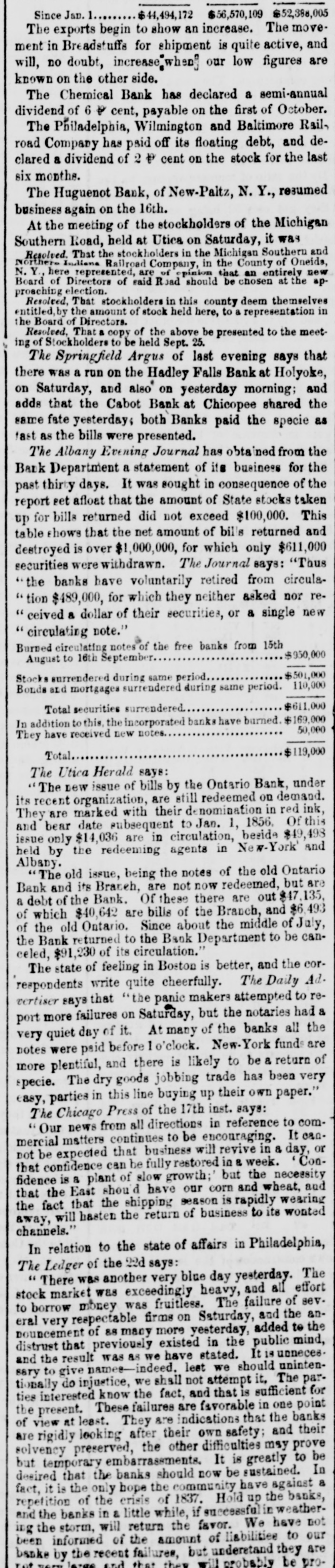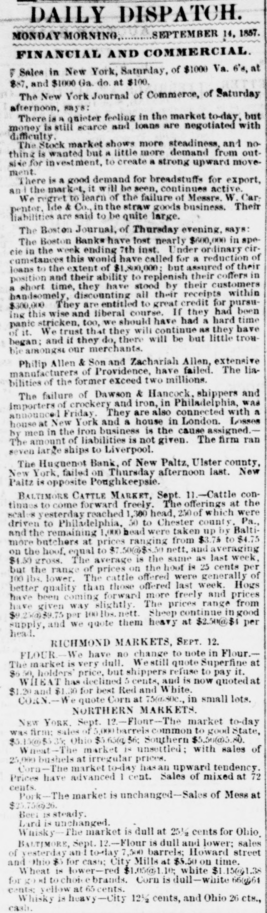 daily dispatch. SEPTEMBER 14, 1857. MONDAY MORNING, FINANCIAL AND COMMERCIAL in Sales in New York, Saturday, of $1000 Va. 6's, at 887, and $1000 Ga. do. at $100. The New York Journal of Commerce, of Saturday afternoon, says: There is A quieter feeling in the market to-day, but money is still scarce and loans are negotiated with difficulty. The Stock market shows more steadiness, and nothinz is wanted but a little more demand from outside for investment, to create a strong upward movement. There is a good demand for breadstuffs for export, and the market, it will be seen, continues active. We regret to learn of the failure of Messrs. W. Car: penter, Ide & Co., in the straw goods business. Their liabilities are said to be quite large. The Boston Journal, of Thursday evening, says: The Boston Bank* have lost nearly $600,000 in specie in the week ending 7th inst. Under ordinary circumstances this would have called for a reduction of loans to the extent of $1,800,000; but assured of their position and their ability to replenish their coffers in a short time, they have stood by their customers handsomely, discounting all their receipts within $300,000 They are entitled to great credit for pursuing this wise and liberal course. If they had been panic stricken, too, we should have had a hard time of it. We trust that they will continue as they have began; and if they do, there will be but little troubie amongst our merchants. Philip Allen & Son and Zachariah Allen, extensive manufacturers of Providence, have failed. The liabilities of the former exceed two millions. The failure of Dawson & Hancock, shippers and importers of crockery and iron, in Philadelphia, was announced Friday, They are also connected with a house at New York and a house in London. Losses by men in the iron business is the cause assigned.The amount of liabilities is not given. The firm ran seven large ships to Liverpool. The Huguenot Bank, of New Paltz, Ulster county, New York, failed on Thursday afternoon last. New Paltz is opposite Poughkeepsie. BALTIMORE CATTLE MARKET, Sept. 11.-Cattle continues to come forward freely. The offerings at the scales yesterday reached 1,300 head, 250 of which were driven to Philadelphia, 50 to Chester county. Pa., and the remaining 1,000 head were taken up by Baltimore butchers at prices ranging from $3.75 to $4.75 on the hoof. equal to $7.50@$8.50 nett. and averaging $1.50 gross. The average is the same as last week, but the range of prices on the hoof is 25 cents per 100 lbs. lower. The cattle offered were generally of better quality than those offered last week. Hogs have been coming forward more freely and prices have given way slightly. The prices range from $9.25@39.75 per 100lbs. nett. Sheep continue in good supply, and we quote them heavy at $2.50@$4 per head. RICHMOND MARKETS, SEPT. 12. FLOUR.-We have no change to note in Flour.The market is very dull. Westill quote Superfine at $6.50, holders' price, but shippers refuse to pay it. WHEAT has declined 5 cents, and is now quoted at $1.20 and $1.30 for best Red and White. CORN.-We quote Corn at 75@soc., in small lots. NORTHERN MARKETS. Ngw YORK. Sept. 12-Flonr-The market to-day was firm: sales of 5.000 barrels common to good State, $5.15@$53% Ohio $5.65(@56; Southern $5.50@5.80. Wheat-The market IS unsettled; with sales of 25,000 bushels at irregular prices. Corn-The market to-day has an upward tendency. Prices have advanced 1 cent. Sales of mixed at 72 cents. Pork-The market is unchanged-Sales of Mess at $23.75@26. Beer IS steady. Lard is unchanged. Whisky-The market is dull at 25½ cents for Ohio. BALTIMORE, Sept. 12-Flour is dull and lower; sales of yesterday and to-day 7,500 barrels; Howard street and Ohio $5 for cash; City Mills at $5.50 on time. Wheat is lower-red $1.05@1.10; white $1.15@1.38 for good go tochoic brands. Corn is dull-white 66(@)61 cents: yellow at 65 cents. Whisky is heavy-City 12½ cents, and Ohio 26 cts., cash.