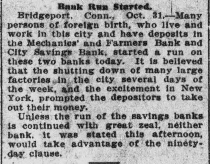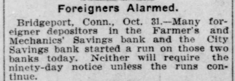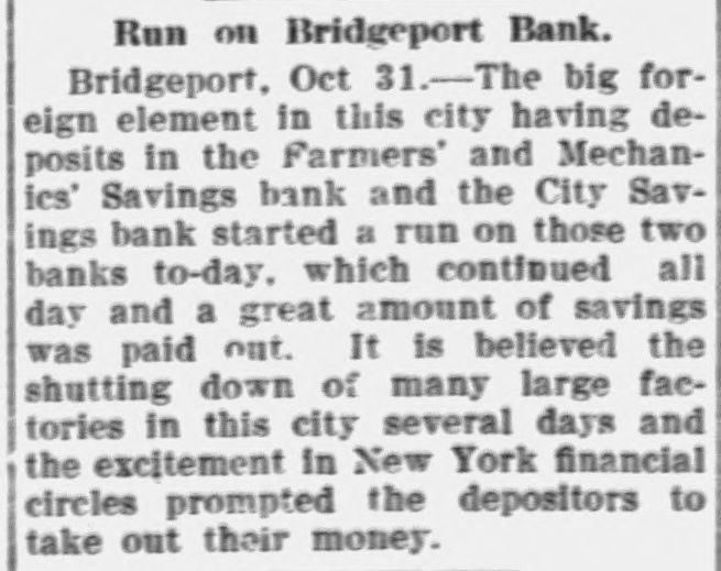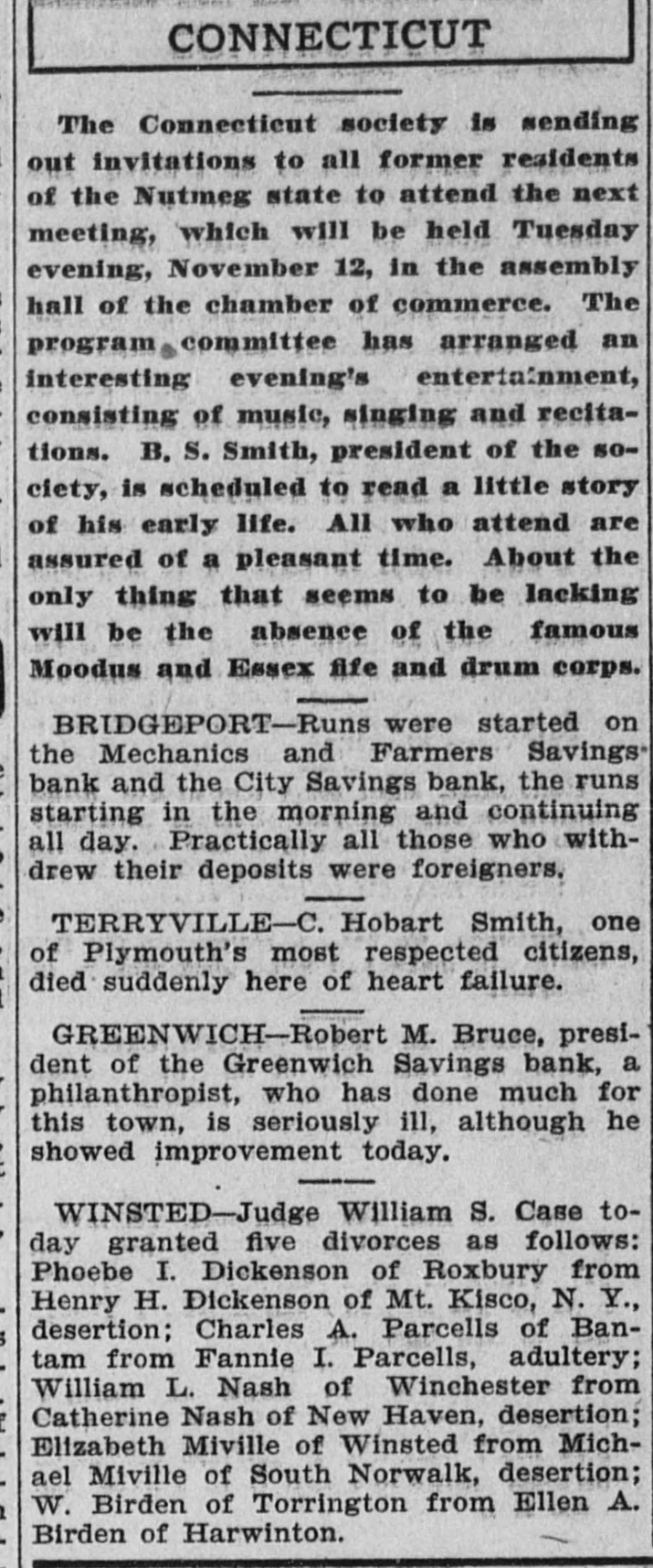 CONNECTICUT The Connecticut society is sending out invitations to all former residents of the Nutmeg state to attend the next meeting, which will be held Tuesday evening, November 12, in the assembly hall of the chamber of commerce. The program committee has arranged an interesting evening's entertainment, consisting of music, singing and recitations. B. S. Smith, president of the society, is scheduled to read a little story of his early life. All who attend are assured of a pleasant time. About the only thing that seems to be lacking will be the absence of the famous Moodus and Essex fife and drum corps. BRIDGEPORT-Runs were started on the Mechanics and Farmers Savings bank and the City Savings bank, the runs starting in the morning and continuing all day. Practically all those who withdrew their deposits were foreigners. TERRYVILLE-C. Hobart Smith, one of Plymouth's most respected citizens, died suddenly here of heart failure. GREENWICH-Robert M. Bruce, president of the Greenwich Savings bank, a philanthropist, who has done much for this town, is seriously ill, although he showed improvement today. WINSTED-Judge William S. Case today granted five divorces as follows: Phoebe I. Dickenson of Roxbury from Henry H. Dickenson of Mt. Kisco, N. Y., desertion; Charles A. Parcells of Bantam from Fannie I. Parcells, adultery; William L. Nash of Winchester from Catherine Nash of New Haven, desertion; Elizabeth Miville of Winsted from Michael Miville of South Norwalk, desertion; W. Birden of Torrington from Ellen A. Birden of Harwinton.