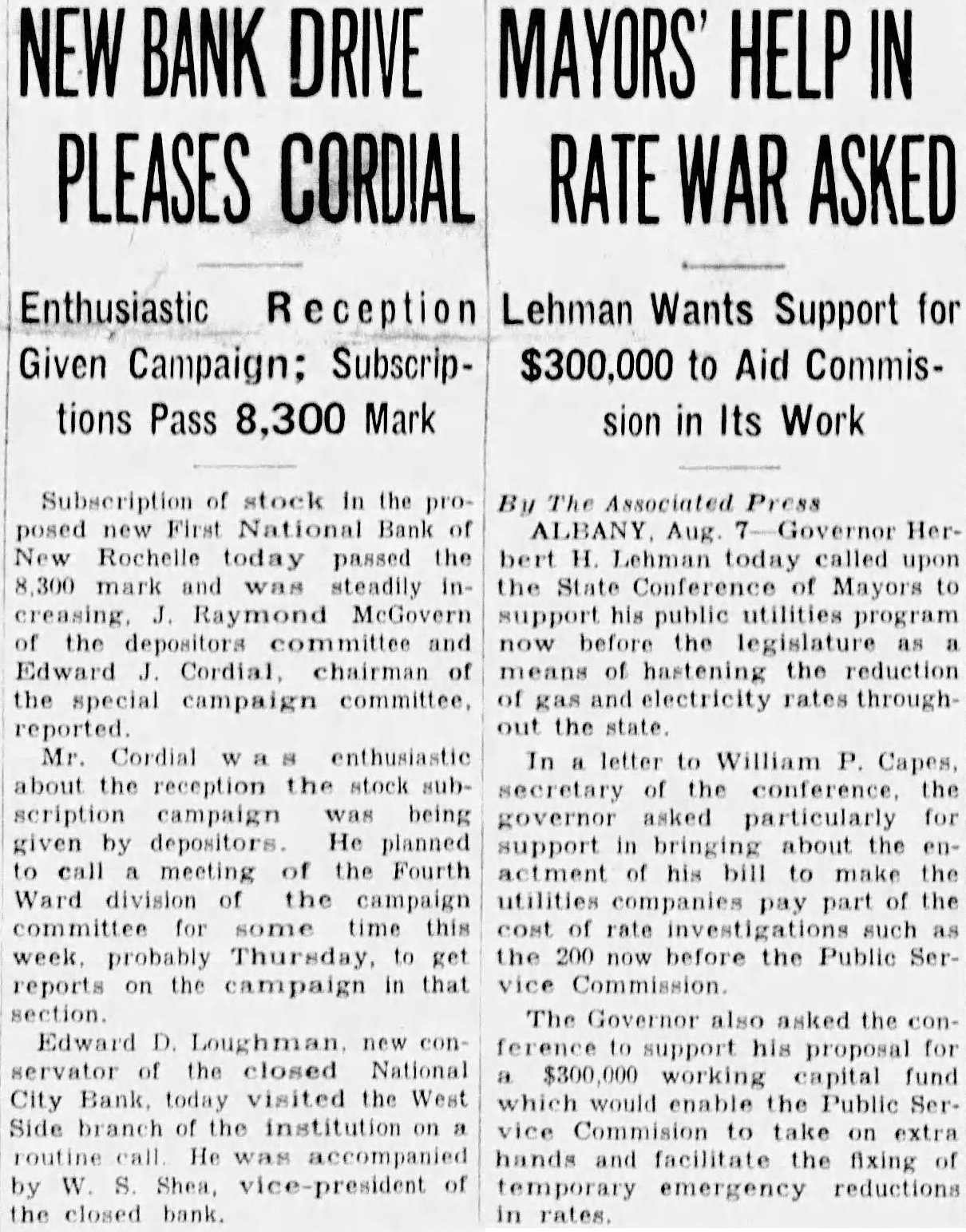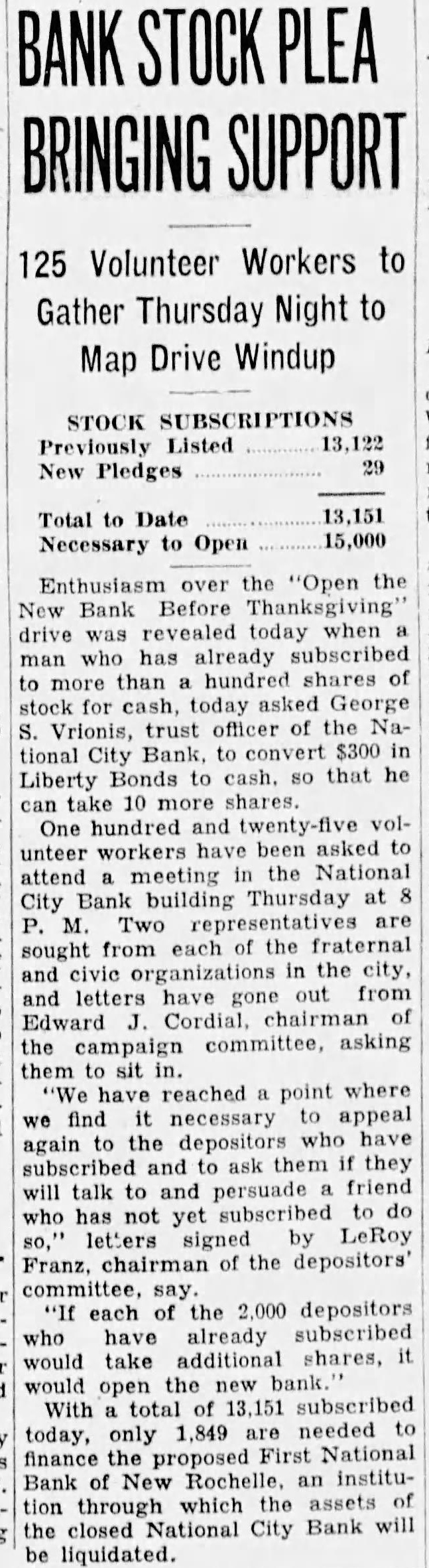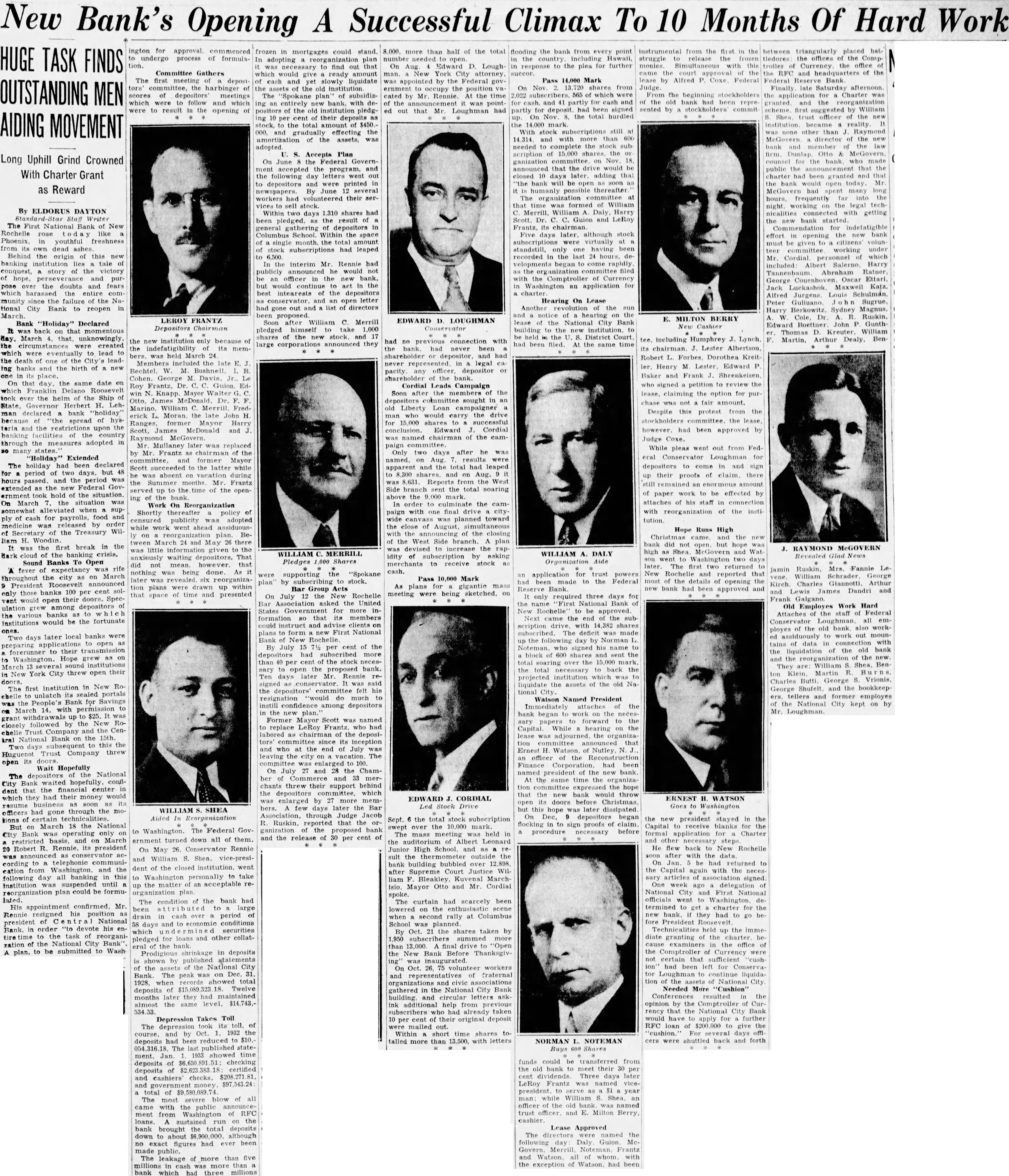 By ELDORUS DAYTON Writer The First National Bank of New Rochelle rose like Phoenix, youthful freshness own dead ashes. Behind origin of this new banking institution tale conquest, story of the victory hope, perseverance and purpose the doubts and fears which harassed the munity since the failure the National City Bank to reopen in March. Bank "Holiday" Declared It was back on that momentous day, March that, unknowingly. circumstances were created which were eventually lead the death one of City's leading banks and the birth of new one in place. that the same date on which Franklin Delano Roosevelt took over the helm of the Ship State, Governor Herbert H. Lehdeclared bank because "the spread of hysand the restrictions upon the banking of the country through the measures adopted in many states. "Holiday" Extended The holiday had been declared for period of two days. but 48 hours and the period was extended the new Federal Government took hold the situation On March situation was somewhat alleviated when supply cash for payrolls, food and medicine released by order the Treasury WilSecretary H. first break in the was the Mark cloud the banking crisis. Sound Banks Open rife fever of expectancy as on March throughout the city Roosevelt announced President 100 cent solonly those banks per would open their doors. Speculation among depositors of the various banks institutions would be the fortunate ones. Two days later local banks were preparing applications open forerunner their transmission Hope grew on Washington. March sound institutions in New York City threw open their doors. institution in New The first unlatch sealed portals chelle Bank for Savings the People's with permission to March $25. It was grant up the New Roclosely followed by and the Cenchelle Trust Company National Bank the 15th. Two days this the Huguenot Trust Company threw open its Wait Hopefully The depositors National City Bank waited confithat the financial center in dent had their would which they money resume business soon officers had gone through the mosions of certain technicalities. But March 18 the National City Bank was operating only on restricted basis, and on March 20 Robert R. Rennie, its president conservator according telephonic communifrom Washington, and the following day all banking this Institution suspended until plan could be formuHis appointment confirmed, Mr. Rennie resigned his position president of National Bank, order "to devote his ento task of reorganization of the National City Bank". to be submitted to plan, ington for commenced undergo process of formulation.