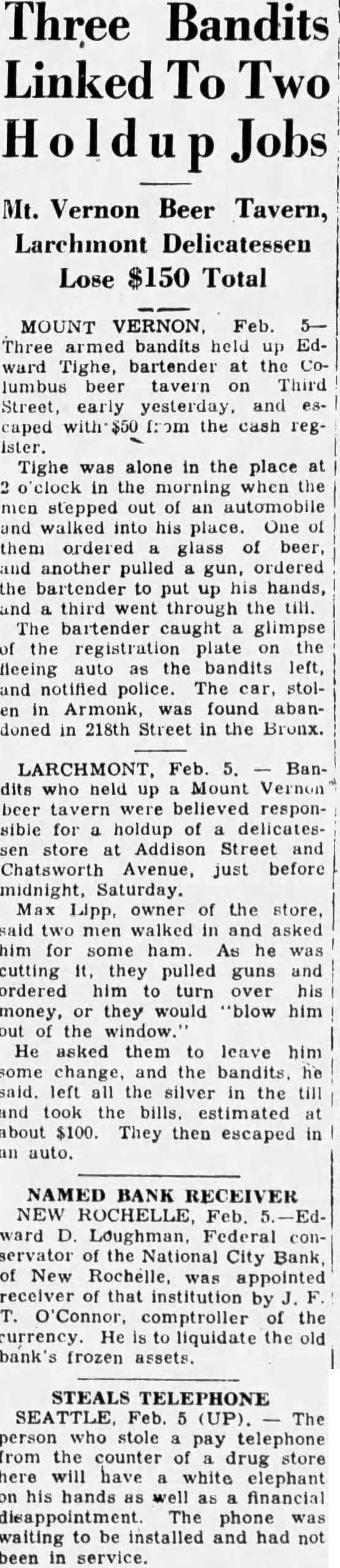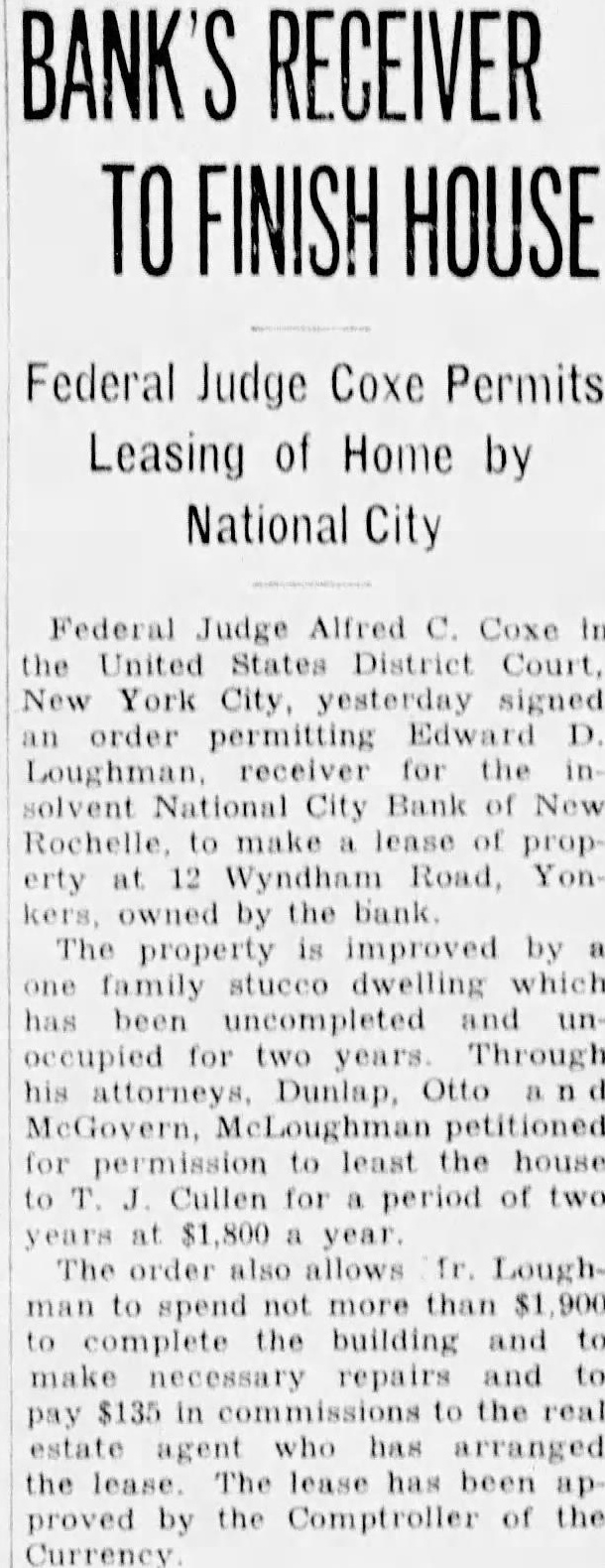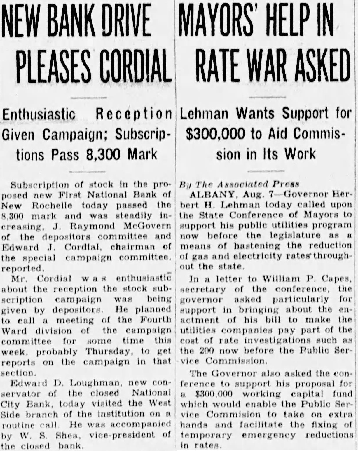 By ELDORUS DAYTON Writer The First National Bank of New Rochelle rose like Phoenix, youthful freshness own dead ashes. Behind origin of this new banking institution tale conquest, story of the victory hope, perseverance and purpose the doubts and fears which harassed the munity since the failure the National City Bank to reopen in March. Bank "Holiday" Declared It was back on that momentous day, March that, unknowingly. circumstances were created which were eventually lead the death one of City's leading banks and the birth of new one in place. that the same date on which Franklin Delano Roosevelt took over the helm of the Ship State, Governor Herbert H. Lehdeclared bank because "the spread of hysand the restrictions upon the banking of the country through the measures adopted in many states. "Holiday" Extended The holiday had been declared for period of two days. but 48 hours and the period was extended the new Federal Government took hold the situation On March situation was somewhat alleviated when supply cash for payrolls, food and medicine released by order the Treasury WilSecretary H. first break in the was the Mark cloud the banking crisis. Sound Banks Open rife fever of expectancy as on March throughout the city Roosevelt announced President 100 cent solonly those banks per would open their doors. Speculation among depositors of the various banks institutions would be the fortunate ones. Two days later local banks were preparing applications open forerunner their transmission Hope grew on Washington. March sound institutions in New York City threw open their doors. institution in New The first unlatch sealed portals chelle Bank for Savings the People's with permission to March $25. It was grant up the New Roclosely followed by and the Cenchelle Trust Company National Bank the 15th. Two days this the Huguenot Trust Company threw open its Wait Hopefully The depositors National City Bank waited confithat the financial center in dent had their would which they money resume business soon officers had gone through the mosions of certain technicalities. But March 18 the National City Bank was operating only on restricted basis, and on March 20 Robert R. Rennie, its president conservator according telephonic communifrom Washington, and the following day all banking this Institution suspended until plan could be formuHis appointment confirmed, Mr. Rennie resigned his position president of National Bank, order "to devote his ento task of reorganization of the National City Bank". to be submitted to plan, ington for commenced undergo process of formulation.