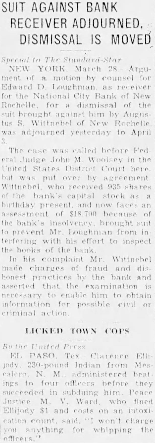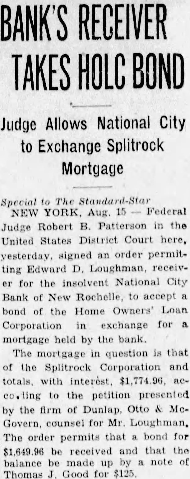 Christmas and the bank did not open, but hope high as Shea McGovern and Watto Washington two later. The returned New Rochelle reported that details of opening the bank had approved and the new president stayed in the Capital receive blanks for formal application for Charter and other necessary He flew back New Rochelle soon after with the data On Jan. had returned the Capital again with the necesarticles signed. One National First National officials went termined to charter for the they had to go fore President Technicalities held the immediate granting the cause the office of the Comptroller of were certain sufficient had been left for Loughman liquidation of assets National City Needed More "Cushion" Conferences resulted the opinion by the Comptroller Currency that the National City Bank have apply for further RFC loan of to give the For several days were shuttled back and forth