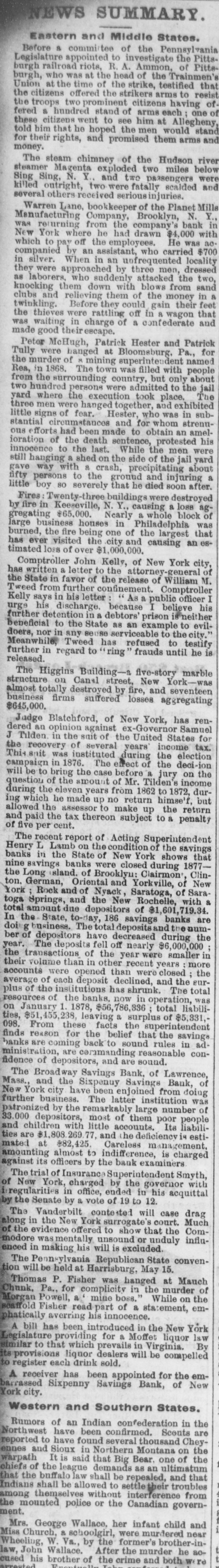 NEWS SUMMARY. Eastern and Middle States. Before & commistee of the Pennsylvania Legislature appointed to investigate the Pittsburgh railroad riots, R. A. Ammon, of Pitteburgh, who was at the head of the Trainmen's Union at the time of the strike, testified that the citizens offered the strikers arms to resist the troops two prominent citizens having of fered a hundred stand of arms each one of these citizens went to see him at Allegheny told him that he hoped the men would stand for their rights, and promised them arms and money. The steam chimney of the Hudson river steamer Magenta exploded two miles below Sing Sing, N. Y., and two passengers were killed outright, two were fatally scalded and several others received seriousinjuries. Warren Lane, bookkeeper of the Planet Mills Manufacturing Company, Brooklyn, N. Y., was returning from the company's bank in New York where he had drawn $4,000 with which to pay off the employees. He was ao companied by an assistant, who carried $700 in silver. When in an unfrequented locality they were approached by three men, dressed as laborers, who suddenly attacked the two, knocking them down with blows from sand clubs and relieving them of the money in a twinkling. Before they could gain their feet the thieves were rattling off in a wagon that was waiting in charge of a confederate and made good their escape. Peter McHugh, Patrick Hester and Patrick Tully were hanged at Bloomsburg. Pa., for the murder of mining superinteudent named Rea, in 1868. The town was filled with people from the surrounding country, but only about two hundred persons were admitted to the jail The yard where the execution took place, three men were hanged together, and exhibited little signs of fear. Hester, who was in substantial circumstances and for whom strenuous efforts had been made to obtain an amelioration of the death sentence, protested his innocence to the last. While the men were still hanging a shed on the side of the jail yard gave way with a crash, precipitating about fifty persons to the ground and injuring a little boy 80 severely that he died soon after. Fires Twenty-three buildings were destroyed by fire in Keeseville, N Y., causing a loss aggregating $65,000. Nearly a whole block of large business houses in Philadelphia was burned, the fire being one of the largest that has ever visited the city and causing an estimated loss of over $1,000,000. Comptroller John Kelly, of New York city, has written a letter to the attorney general of the State in favor of the release of William M. Tweed from further confinement. Comptroller Kelly says in his letter " As a public officer I urge his discharge, because I believe his further detention in a debtors' prison is neither beneficial to the State as an example to evildoers, nor in any sense serviceable to the Meanwhile. Tweed has refused to testify further in regard to ring frauds until he is released. The Higgins Building five-story marble structure on Canal street, New York-was almost totally destroyed by fire, and seventeen business firms suffered losses aggregating $645,000. Judge Blatchford, of New York, has rendered an opinion against ex-Governor Samuel J Tilden. in the suit of the United States for the recovery of several years income tax. This snit was instituted during the election campaign in 1876. The effect of the deci-ion will be to bring the case before a jury on the question of the amount of Mr. Tilden's income during the eleven years from 1862 to 1872, during which he made up no return himse'f, but allowed the assessor to make up the return and paid the tax thereon subject to a penalty of five per cent. The recent report of Acting Superintendent Henry L Lamb on the condition of the savings banks in the State of New York shows that nine savings banks were closed during 1877the Long sland. of Brooklyn: Clairmont, Clinton. German, Oriental and Yorkville, of New York Rock and of Nyack, Saratoga, of Saratoga Springs, and the New Rochelle, with a total amount due depositors of $1,601,719.34. In the State, to-day, 186 savings banks are doing business. The total deposits and the number of depositors have decreased during the year. The deposits fell off nearly $6,000,000 the transactions of the year were smaller in their volume than in other recent years more accounts were opened than were closed the average of each deposit declined, and the surplus of the institutions has shrunk. The total resources of the banks. now in operation, was on January 1. 1878, $56,786,336 total liabilities, $51,455,238, leaving a surplus of $5,331,098. From these facts the superintendent finds reason for the belief that the savings banks are coming back to sound rules in administration, are commanding reasonable confidence of depositors, and are sound. The Broadway Savings Bank, of Lawrence, Mass., and the Sixpenuy Savings Bank, of New York city have been enjoined from doing further business. The latter institution was patronized by the remarkably large number of 33.000 depositors, most of them poor people and children with little accounts. Its liabilities are $1,808 269 77, and the deficiency is estimated at #82, 425. Careless management. amounting almost to indifference, is charged against its officers by the bank examiners The trial of Insurance Superintendent Smyth, of New York, charged by the governor with regularities in office, ended in his acquittal by the Senate by & vote of 19 to 12. The Vanderbilt contested will case drag along in the New York surrogate's court. Much of the evidence offered to show that the Commodore wasmentally unsound or unduly influenced in making his will is excluded. The Pennsylvania Republican State convention will be held at Harrisburg, May 15. Thomas P. Fisher was hanged at Mauch Chunk, Pa., for complicity in the murder of Morgan Powell, a mine boss." While on the scaffold Fisher read part of a statement, emphatically averring his innocence. A bill has been introduced in the New York Legislature provi