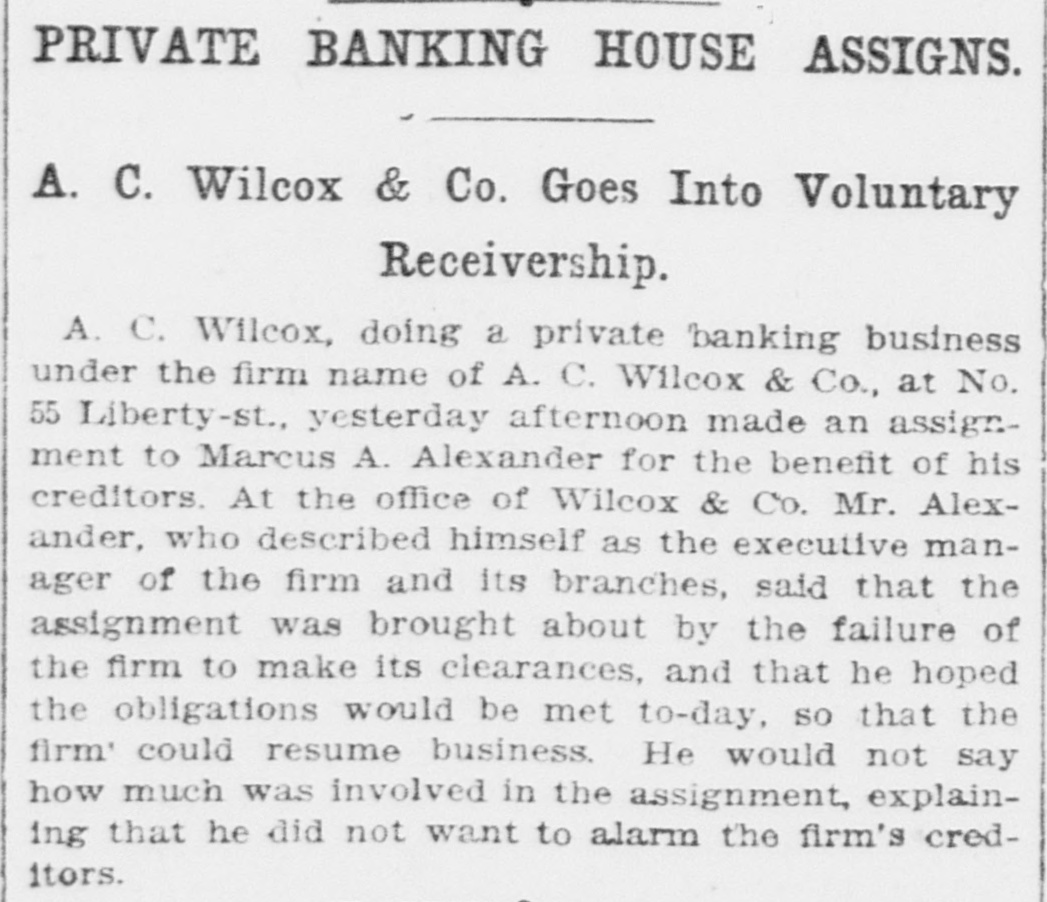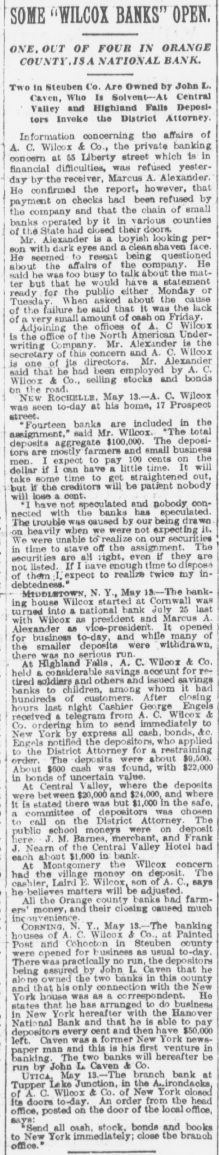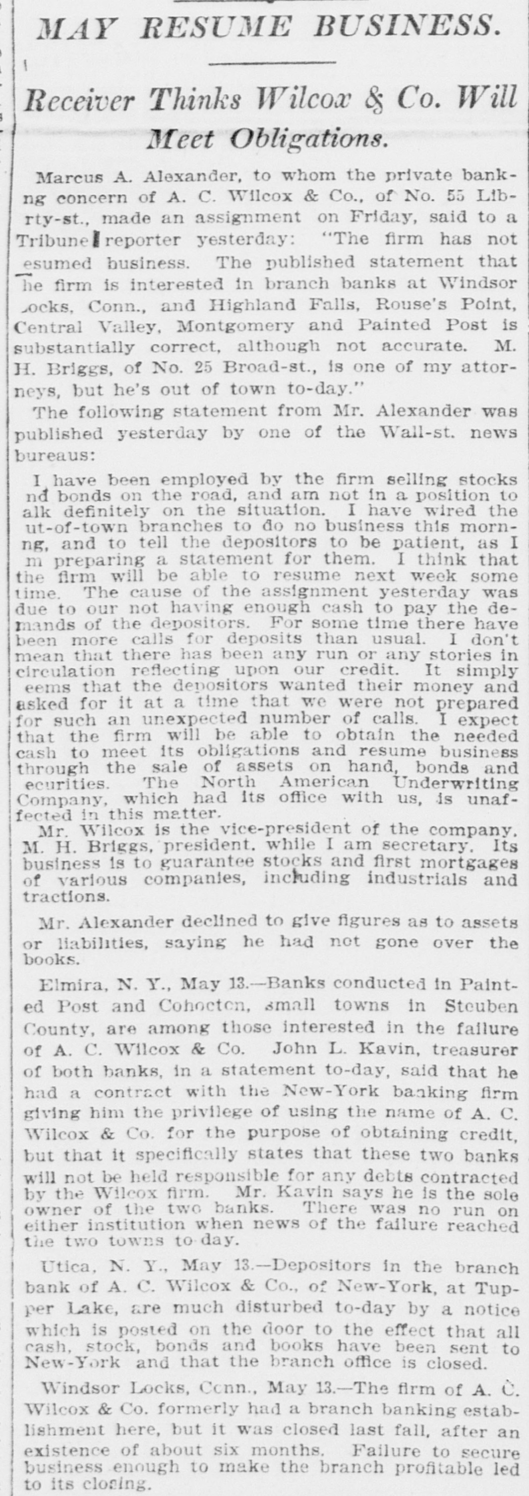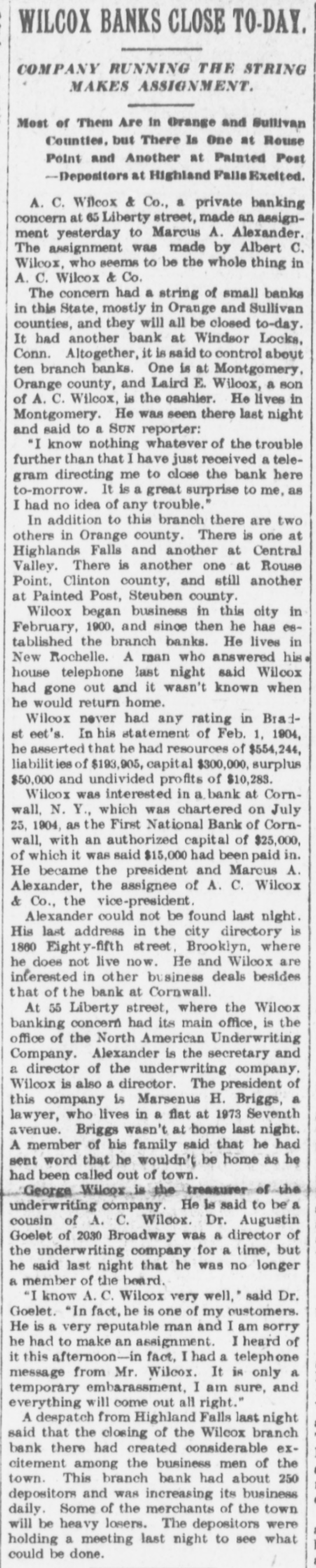 WILCOX BANKS CLOSE TO-DAY. COMPANY RUNNING THE STRING MAKES ASSIGNMENT. Most of Them Are in Orange and Sullivan Counties, but There Is One at Rouse Point and Another at Painted Post -Depositors at Highland Falls Excited. A. C. Wilcox & Co., a private banking concern at 65 Liberty street, made an assignment yesterday to Marcus A. Alexander. The assignment was made by Albert C. Wilcox, who seems to be the whole thing in A. C. Wilcox & Co. The concern had a string of small banks in this State, mostly in Orange and Sullivan counties, and they will all be closed to-day. It had another bank at Windsor Locks, Conn. Altogether, it is said to control about ten branch banks. One is at Montgomery, Orange county, and Laird E. Wilcox, a son of A. C. Wilcox, is the cashier. He lives in Montgomery. He was seen there last night and said to a SUN reporter: "I know nothing whatever of the trouble further than that I have just received a telegram directing me to close the bank here to-morrow. It is a great surprise to me, as I had no idea of any trouble." In addition to this branch there are two others in Orange county. There is one at Highlands Falls and another at Central Valley. There is another one at Rouse Point, Clinton county, and still another at Painted Post, Steuben county. Wiloox began business in this city in February, 1900, and since then he has established the branch banks. He lives in New Rochelle. A man who answered his house telephone last night said Wilcox had gone out and it wasn't known when he would return home. Wilcox never had any rating in Bradst eet's. In his statement of Feb. 1, 1904, he asserted that he had resources of $554,244, liabilities of $193,905, capital $300,000, surplus $50,000 and undivided profits of $10,283. Wilcox was interested in a. bank at Cornwall, N. Y., which was chartered on July 25, 1904, as the First National Bank of Cornwall, with an authorized capital of $25,000, of which it was said $15,000 had been paid in. He became the president and Marcus A. Alexander, the assignee of A. C. Wilcox & Co., the vice-president. Alexander could not be found last night. His last address in the city directory is 1860 Eighty-fifth street, Brooklyn, where he does not live now. He and Wilcox are inferested in other business deals besides that of the bank at Cornwall. At 55 Liberty street, where the Wilcox banking concern had its main office, is the office of the North American Underwriting Company. Alexander is the secretary and a director of the underwriting company. Wilcox is also a director. The president of this company is Marsenus H. Briggs, a lawyer, who lives in a flat at 1973 Seventh avenue. Briggs wasn't at home last night. A member of his family said that he had sent word that he wouldn't be home as he had been called out of town. George Wilcox is the treasurer of the underwriting company. He is said to be a cousin of A. C. Wilcox. Dr. Augustin Goelet of 2030 Broadway was a director of the underwriting company for a time, but he said last night that he was no longer a member of the board. "I know A. C. Wilcox very well," said Dr. Goelet. "In fact, he is one of my customers. He is a very reputable man and I am sorry he had to make an assignment. I heard of it this afternoon-in fact, I had a telephone message from Mr. Wilcox. It is only a temporary embarassment, I am sure, and everything will come out all right." A despatch from Highland Falls last night said that the closing of the Wilcox branch bank there had created considerable excitement among the business men of the town. This branch bank had about 250 depositors and was increasing its business daily. Some of the merchants of the town will be heavy losers. The depositors were holding a meeting last night to see what could be done.