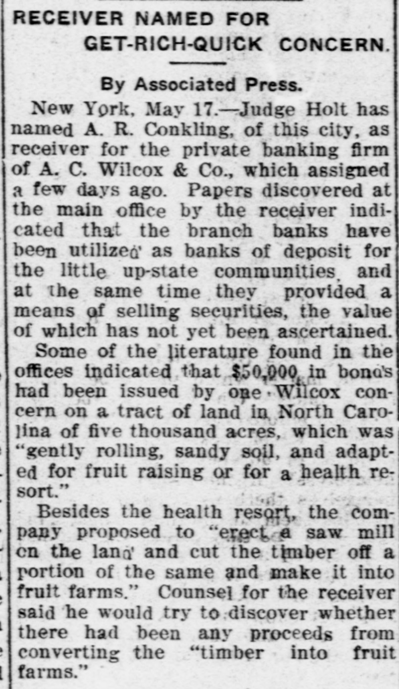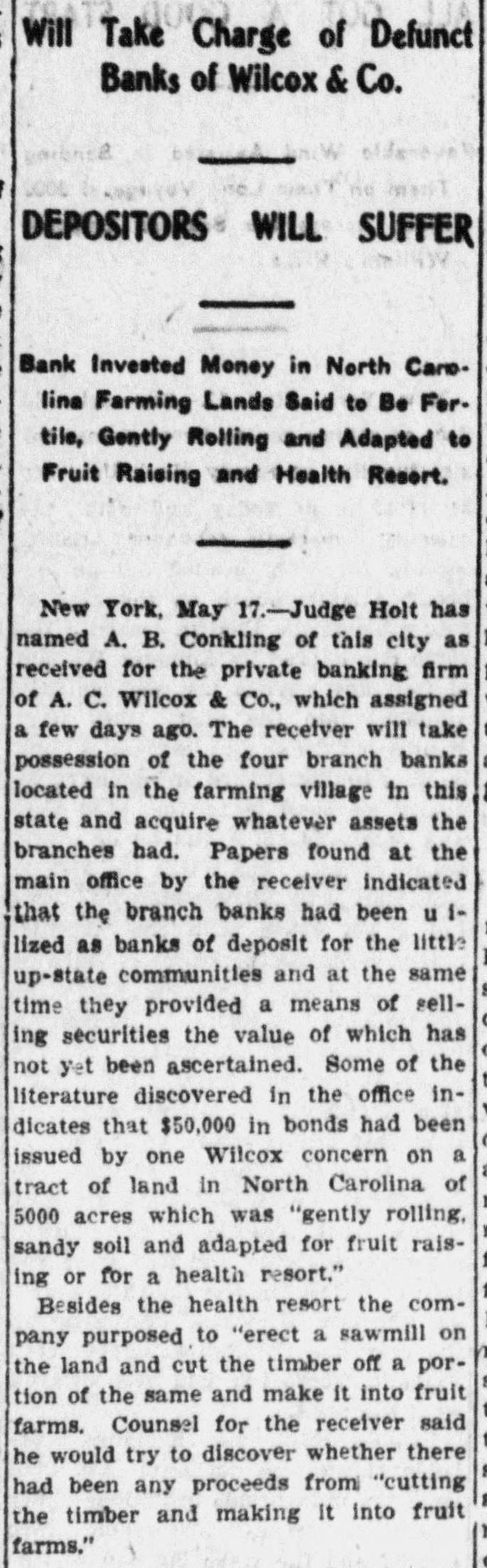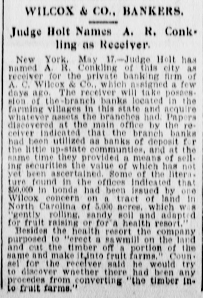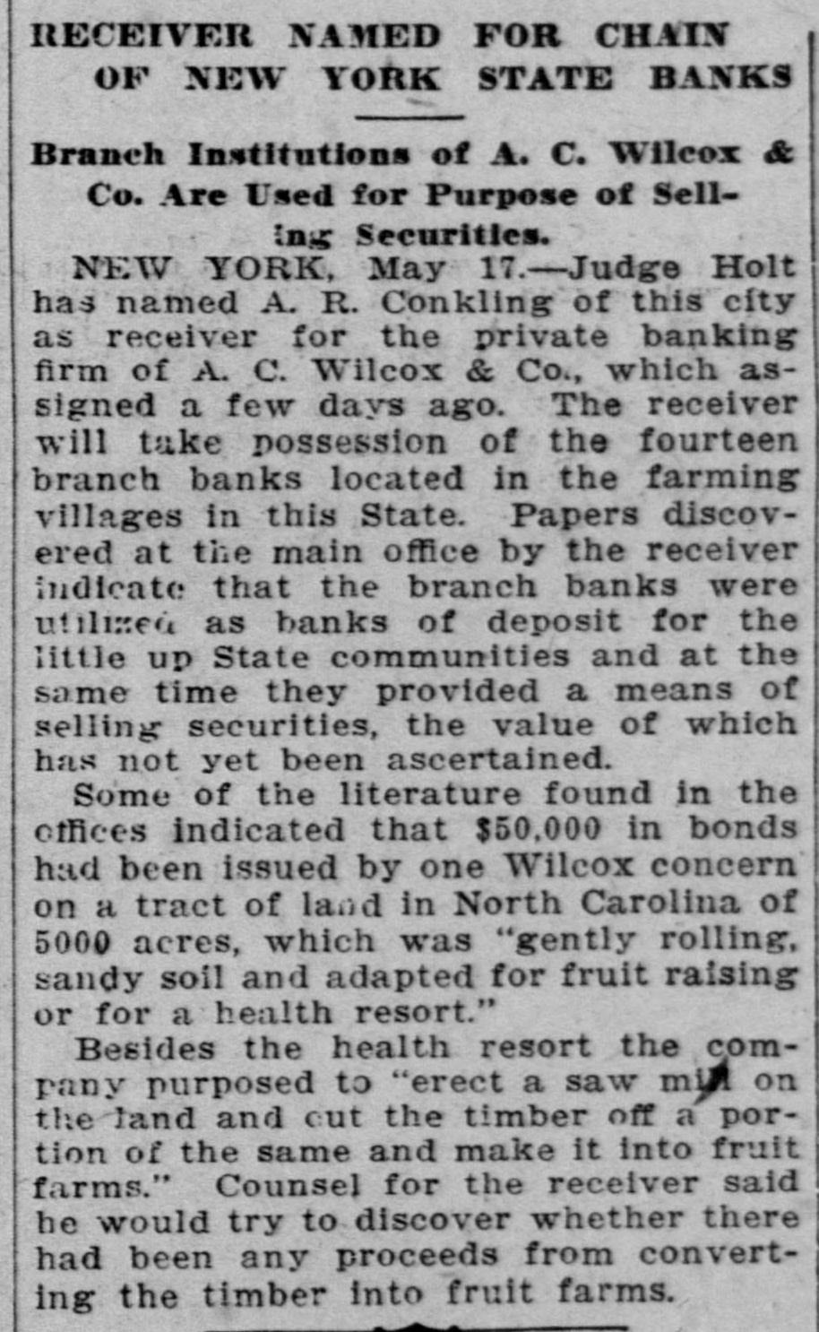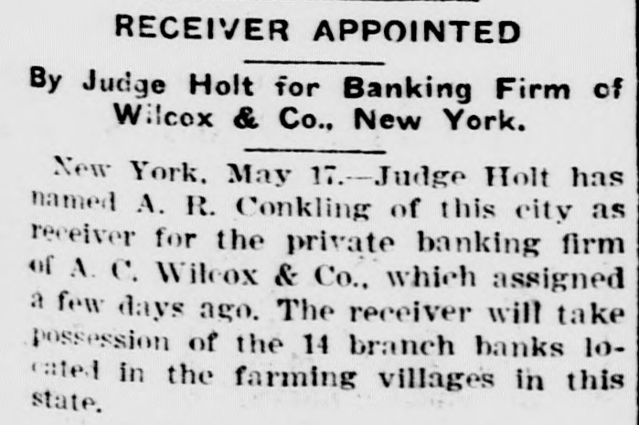 WILCOX BANKS CLOSE TO-DAY. COMPANY RUNNING THE STRING MAKES ASSIGNMENT. Most of Them Are in Orange and Sullivan Counties, but There Is One at Rouse Point and Another at Painted Post -Depositors at Highland Falls Excited. A. C. Wilcox & Co., a private banking concern at 65 Liberty street, made an assignment yesterday to Marcus A. Alexander. The assignment was made by Albert C. Wilcox, who seems to be the whole thing in A. C. Wilcox & Co. The concern had a string of small banks in this State, mostly in Orange and Sullivan counties, and they will all be closed to-day. It had another bank at Windsor Locks, Conn. Altogether, it is said to control about ten branch banks. One is at Montgomery, Orange county, and Laird E. Wilcox, a son of A. C. Wilcox, is the cashier. He lives in Montgomery. He was seen there last night and said to a SUN reporter: "I know nothing whatever of the trouble further than that I have just received a telegram directing me to close the bank here to-morrow. It is a great surprise to me, as I had no idea of any trouble." In addition to this branch there are two others in Orange county. There is one at Highlands Falls and another at Central Valley. There is another one at Rouse Point, Clinton county, and still another at Painted Post, Steuben county. Wiloox began business in this city in February, 1900, and since then he has established the branch banks. He lives in New Rochelle. A man who answered his house telephone last night said Wilcox had gone out and it wasn't known when he would return home. Wilcox never had any rating in Bradst eet's. In his statement of Feb. 1, 1904, he asserted that he had resources of $554,244, liabilities of $193,905, capital $300,000, surplus $50,000 and undivided profits of $10,283. Wilcox was interested in a. bank at Cornwall, N. Y., which was chartered on July 25, 1904, as the First National Bank of Cornwall, with an authorized capital of $25,000, of which it was said $15,000 had been paid in. He became the president and Marcus A. Alexander, the assignee of A. C. Wilcox & Co., the vice-president. Alexander could not be found last night. His last address in the city directory is 1860 Eighty-fifth street, Brooklyn, where he does not live now. He and Wilcox are inferested in other business deals besides that of the bank at Cornwall. At 55 Liberty street, where the Wilcox banking concern had its main office, is the office of the North American Underwriting Company. Alexander is the secretary and a director of the underwriting company. Wilcox is also a director. The president of this company is Marsenus H. Briggs, a lawyer, who lives in a flat at 1973 Seventh avenue. Briggs wasn't at home last night. A member of his family said that he had sent word that he wouldn't be home as he had been called out of town. George Wilcox is the treasurer of the underwriting company. He is said to be a cousin of A. C. Wilcox. Dr. Augustin Goelet of 2030 Broadway was a director of the underwriting company for a time, but he said last night that he was no longer a member of the board. "I know A. C. Wilcox very well," said Dr. Goelet. "In fact, he is one of my customers. He is a very reputable man and I am sorry he had to make an assignment. I heard of it this afternoon-in fact, I had a telephone message from Mr. Wilcox. It is only a temporary embarassment, I am sure, and everything will come out all right." A despatch from Highland Falls last night said that the closing of the Wilcox branch bank there had created considerable excitement among the business men of the town. This branch bank had about 250 depositors and was increasing its business daily. Some of the merchants of the town will be heavy losers. The depositors were holding a meeting last night to see what could be done.