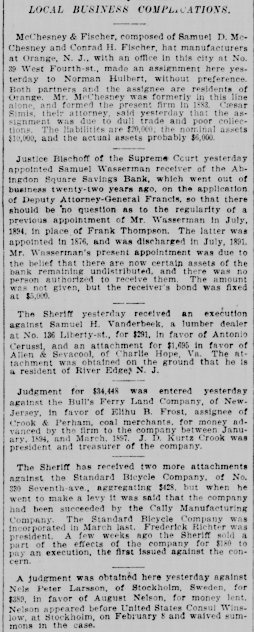 LOCAL BUSINESS COMPLIUATIONS. McChesney & Fischer, composed of Samuel D. McChesney and Conrad H. Fischer. hat manufacturers at Orange, N. J., with an office in this city at No. 39 West Fourth-st., made an assignment here yesterday to Norman Hulbert, without preference. Both partners and the assignee are residents of Orange. Mr. McChesney was formerly in this line alone, and formed the present firm in 1883. Casar Simis, their attorney, said yesterday that the assignment was due to dull trade and poor collections. The liabilities are $20,000. the nominal assets $10,000. and the actual assets probably $6,000. Justice Bischoff of the Supreme Court yesterday appointed Samuel Wasserman receiver of the Abingdon Square Savings Bank, which went out of business twenty-two years ago, on the application of Deputy Attorney-General Francis, so that there should be no question as to the regularity of a previous appointment of Mr. Wasserman in July, 1894, in place of Frank Thompson. The latter was appointed in 1876, and was discharged in July, 1891. Mr. Wasserman's present appointment was due to the belief that there are now certain assets of the bank remaining undistributed, and there was no person authorized to receive them. The amount was not given, but the receiver's bond was fixed at $5,000. The Sheriff yesterday received an execution against Samuel H. Vanderbeek, a lumber dealer at No. 136 Liberty-st., for $291. in favor of Antonio Cerussi, and an attachment for $1,695 in favor of Allen & Sevacool, of Charlie Hope, Va. The attachment was obtained on the ground that he is a resident of River Edge, N. J. Judgment for $34,448 was entered yesterday against the Bull's Ferry Land Company, of NewJersey, in favor of Elihu B. Frost, assignee of Crook & Perham, coal merchants, for money advanced by the firm to the company between January, 1894, and March, 1897. J. D. Kurtz Crook was president and treasurer of the company. The Sheriff has received two more attachments against the Standard Bicycle Company, of No. 330 Seventh-ave, aggregating $428. but when he went to make a levy it was said that the company had been succeeded by the Cally Manufacturing Company. The Standard Blcycle Company was incorporated in March last. Frederick Richter was president. A few weeks ago the Sheriff sold a part of the effects of the company for $180 to pay an execution, the first issued against the concern. A judgment was obtained here yesterday against Nels Peter Larsson, of Stockholm, Sweden, for $389, in favor of August Nelson, for money lent. Nelson appeared before United States Consul Winslow, at Stockholm, on February 8 and waived summons in the case.