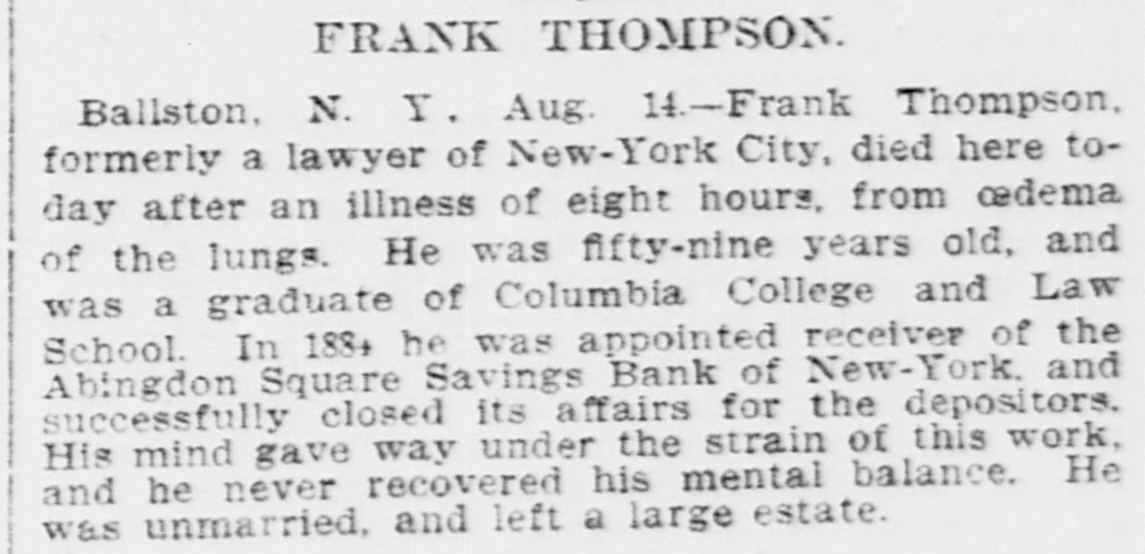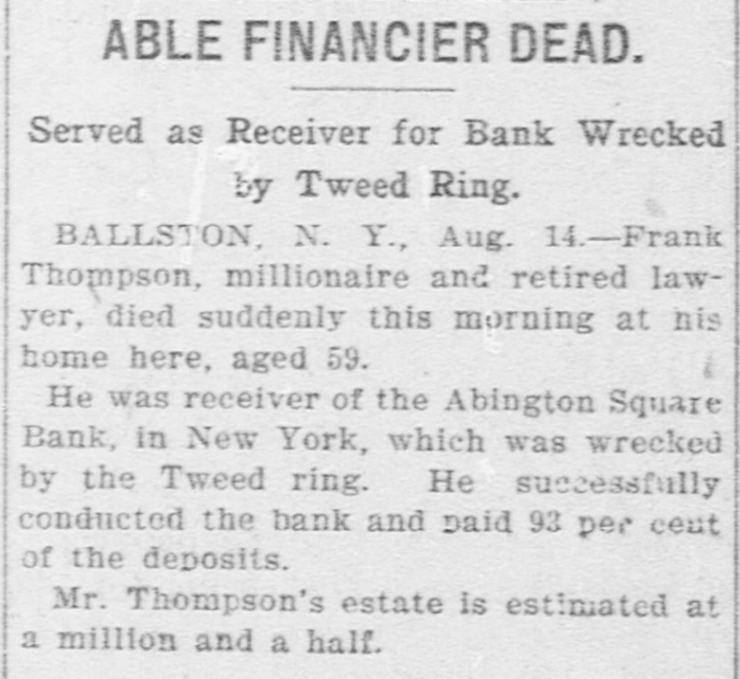 # ABLE FINANCIER DEAD. Served as Receiver for Bank Wrecked by Tweed Ring. BALLSTON, N. Y., Aug. 14.-Frank Thompson, millionaire and retired lawyer, died suddenly this morning at his home here, aged 59. He was receiver of the Abington Square Bank, in New York, which was wrecked by the Tweed ring. He successfully conducted the bank and paid 93 per cent of the deposits. Mr. Thompson's estate is estimated at a million and a half.