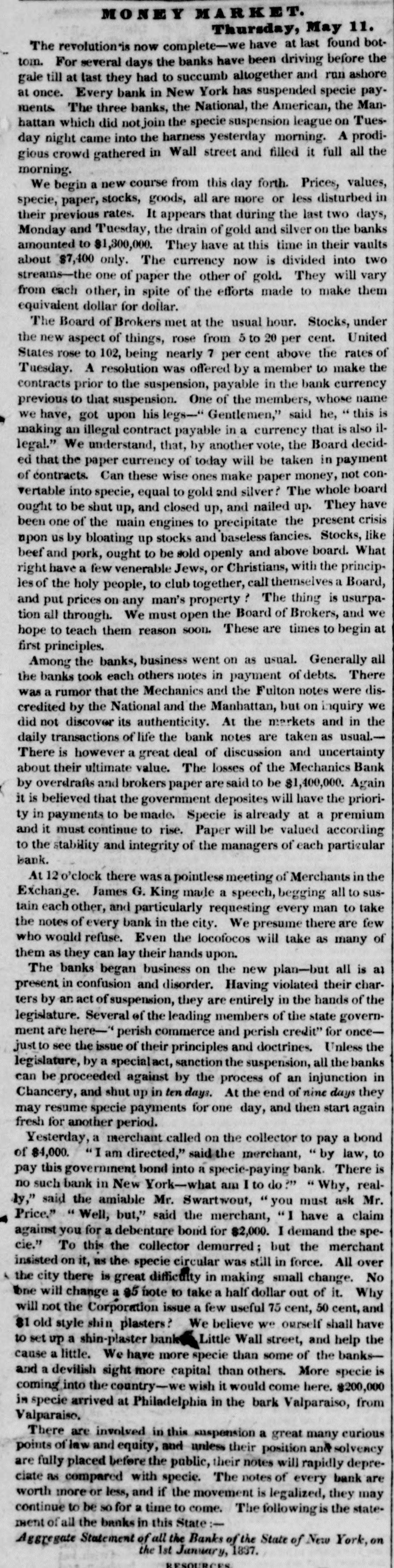 MONEY K Thursday, May 11. The revolution's now complete-we have at last found bottom. For several days the banks have been driving before the gale till at last they had to succumb altogether and run ashore at once. Every bank in New York has suspended specie payments The three banks, the National, the American, the Manhattan which did not join the specie suspension league on Tuesday night came into the harness yesterday morning. A prodigious crowd gathered in Wall street and filled it full all the morning. We begin a new course from this day forth. Prices, values, specie, paper, stocks, goods, all are more or less disturbed in their previous rates. It appears that during the last two days, Monday and Tuesday, the drain of gold and silver on the banks amounted to $1,300,000. They have at this time in their vaults about $7,400 only. The currency now is divided into two streams-the one of paper the other of gold. They will vary from each other, in spite of the efforts made to make them equivalent dollar for dollar. The Board of Brokers met at the usual hour. Stocks, under the new aspect of things, rose from 5 to 20 per cent. United States rose to 102, being nearly 7 per cent above the rates of Tuesday. A resolution was offered by a member to make the contracts prior to the suspension, payable in the bank currency previous to that suspension. One of the members, whose name we have, got upon his legs-" Gentlemen," said he, " this is making an illegal contract payable in a currency that is also illegal." We understand, that, by another vote, the Board decided that the paper currency of today will be taken in payment of contracts. Can these wise ones make paper money, not convertable into specie, equal to gold and silver? The whole board ought to be shut up, and closed up, and nailed up. They have been one of the main engines to precipitate the present crisis upon us by bloating up stocks and baseless fancies. Stocks, like beef and pork, ought to be sold openly and above board. What right have a few venerable Jews, or Christians, with the principles of the holy people, to club together, call themselves a Board, and put prices on any man's property The thing is usurpation all through. We must open the Board of Brokers, and we hope to teach them reason soon. These are times to begin at first principles. Among the banks, business went on as usual. Generally all the banks took each others notes in payment of debts. There was a rumor that the Mechanics and the Fulton notes were discredited by the National and the Manhattan, but on inquiry we did not discover its authenticity. At the markets and in the daily transactions of life the bank notes are taken as usual.There is however a great deal of discussion and uncertainty about their ultimate value. The losses of the Mechanics Bank by overdrafts and brokers paper are said to be $1,400,000. Again it is believed that the government deposites will have the priority in payments to be made. Specie is already at a premium and it must continue to rise. Paper will be valued according to the stability and integrity of the managers of each particular bank. o'clock there was a pointless meeting of Merchants in the Exchange. James G. King made a speech, begging all to sustain each other, and particularly requesting every man to take the notes of every bank in the city. We presume there are few who would refuse. Even the locofocos will take as many of them as they can lay their hands upon. The banks began business on the new plan-but all is al present in confusion and disorder. Having violated their charters by an act of suspension, they are entirely in the hands of the legislature. Several of the leading members of the state government are here perish commerce and perish credit" for oncejust to see the issue of their principles and doctrines. Unless the legislature, by a specialact, sanction the suspension, all the banks can be proceeded against by the process of an injunction in Chancery, and shut up in ten days. At the end of nine days they may resume specie payments for one day, and then start again fresh for another period. Yesterday, a merchant called on the collector to pay a bond of $4,000. "I am directed," said the merchant, " by law, to pay this government bond into a specie-paying bank. There is no such bank in New York-what am I to do?" " Why, really," said the amiable Mr. Swartwout, " you must ask Mr. Price." " Well, but," said the merchant, "I have a claim against you for a debenture bond for $2,000. I demand the specie." To this the collector demurred; but the merchant insisted on it, as the specie circular was still in force. All over the city there is great difficulty in making small change. No Ibne will change a 85 note to take a half dollar out of it. Why will not the Corporation issue a few useful 75 cent, 50 cent, and 81 old style shin plasters? We believe we ourself shall have to set up a shin-plaster bank Little Wall street, and help the cause a little. We have more specie than some of the banksis and a devilish sight more capital than others. More specie coming into the country-we wish it would come here. $200,000 in specie arrived at Philadelphia in the bark Valparaiso, from Valparaiso. There are involved in this suspension a great many curious points of law and equity, and unless their position and solvency are fully placed before the public, their notes will rapidly depreciate as compared with specie. The notes of every bank are worth more or less, and if the movement is legalized, they may continue to be so for a time to come. The following is the statement of all the banks in this State: :Aggregate Statement of all the Banks of the State of New York, on the 1st January, 1837. RESOURCES