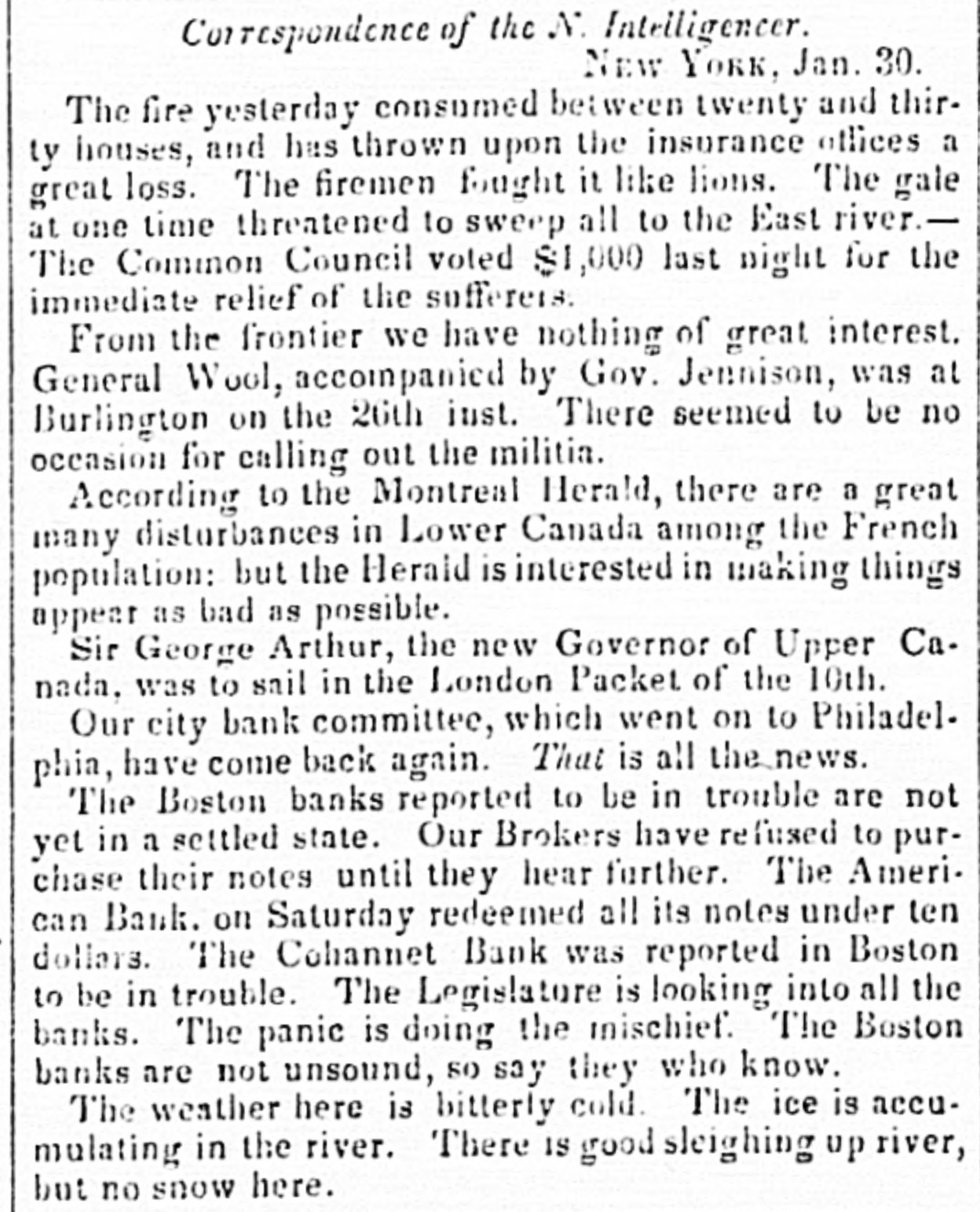 Correspondence of the N Intelligencer. New YORK, Jan. 30. The fire yesterday consumed between twenty and thirty houses, and has thrown upon the insurance offices a great loss. The firemen fought it like lions. The gale at one time threatened to sweep all to the East river.The Common Council voted $1,000 last night for the immediate relief of the sufferers. From the frontier we have nothing of great interest. General Wool, accompanied by Gov. Jennison, was at Burlington on the 26th inst. There seemed to be no occasion for calling out the militia. According to the Montreal Herald, there are a great many disturbances in Lower Canada among the French population: but the Herald is interested in making things appear as bad as possible. Sir George Arthur, the new Governor of Upper Ca. nada, was to sail in the London Packet of the 10th. Our city bank committee, which went on to Philadelphia, have come back again. That is all the news. The Boston banks reported to be in trouble are not yet in a settled state. Our Brokers have refused to purchase their notes until they hear further. The Ameri. can Bank. on Saturday redeemed all its notes under ten dollars. The Cohannet Bank was reported in Boston to be in trouble. The Legislature is looking into all the banks. The panic is doing the mischief. The Boston banks are not unsound, so say they who know. The weather here is bitterly cold. The ice is accumulating in the river. There IS good sleighing up river, but no snow here.