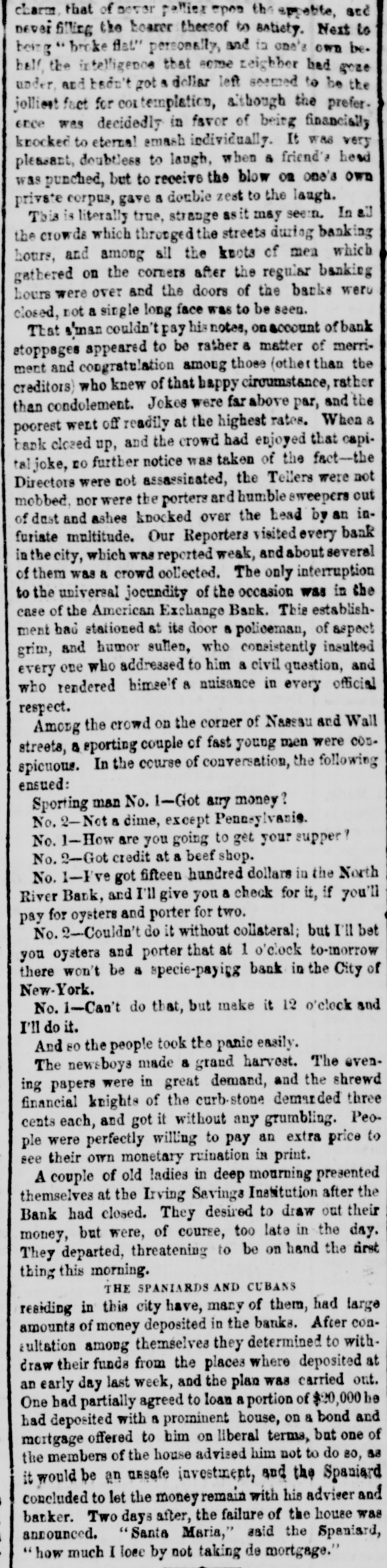 charm, that of never pallier upon the spretite, and never filling the hearer thereof to satiety. Next to being broke flat" personally, and in one's own be. half, the intelligence that come zeighber had gone under, and badn't got a dollar left seemed to be the jolliest fact for templation, although the prefer. once was decidedly in favor of being financially knocked to eternal emash individually. It was very pleasant, doubtless to laugh, when & friend's head was punched, but to receive the blow on one's own private corpus, gave a double zest to the laugh. This is literally true, strange asit may seem. In all the crowds which througed the streets during banking hours, and among all the knots of men which gathered on the corners after the regular banking hours were over and the doors of the banks were closed, not a single long face was to be seen. That a'man couldn't pay snotes, on account of bank stoppages appeared to be rather & matter of merriment and congratulation among those (other than the creditors) who knew of that happy circumstance, rather than condolement. Jokes were far above par, and the poorest went off readily at the highest rates. When & bank closed up, and the crowd had enjoyed that capital joke, no further notice was taken of the fact-the Directors were not assassinated, the Tellers were not mobbed, nor were the porters and humble sweepers out of dust and ashes knocked over the head by an infuriate multitude. Our Reporters visited every bank in the city, which was reported weak, and about several of them was a crowd collected. The only interruption to the universal jocundity of the occasion was in the case of the American Exchange Bank. This establishment had stationed at its door 8 policeman, of aspect grim, and humor sullen, who consistently insulted every one who addressed to him a civil question, and who rendered himself & nuisance in every official respect. Among the crowd on the corner of Nassau and Wall streets, a sporting couple of fast young men were conspicuous. In the course of conversation, the following ensued: Sporting man No. 1-Got any money? No. 2-Not a dime, except Pennsylvania. No. 1-How are you going to get your supper? No. 2-Got credit at a beef shop. No. 1-Pve got fifteen hundred dollars in the North River Bank, and I'll give you a check for it, if you'll pay for oysters and porter for two. No. 2-Couldn't do it without collateral; but I'll bet you oysters and porter that at 1 o'clock to-morrow there won't be & specie-paying bank in the City of New-York. No. 1-Can't do that, but make it 12 o'clock and I'll do it. And 80 the people took the panic easily. The newsboys made a grand harvest. The evening papers were in great demand, and the shrewd financial knights of the curb-stone demarded three cents each, and got it without any grumbling. People were perfectly willing to pay an extra price to see their own monetary ruination in print. A couple of old ladies in deep mourning presented themselves at the Irving Savings Institution after the Bank had closed. They desired to draw out their money, but were, of course, too late in the day. They departed, threatening to be on hand the first thing this morning. THE SPANIARDS AND CUBANS residing in this city have, many of them, had large amounts of money deposited in the banks. After consultation among themselves they determined to withdraw their funds from the places where deposited at an early day last week, and the plan was carried out. One had partially agreed to loan a portion of $20,000 he had deposited with a prominent house, on a bond and mortgage offered to him on liberal terms, but one of the members of the house advised him not to do so, as it would be an ussafe investment, and the Spaniard concluded to let the money remain with his adviser and banker. Two days after, the failure of the house was announced. "Santa Maria," said the Spaniard, how much I lose by not taking de mortgage."