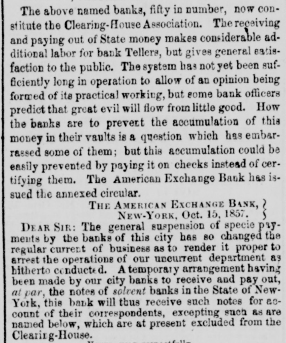 The above named banks, fifty in number, now constitute the Clearing- House Association. The receiving and paying out of State money makes considerable additional labor for bank Tellers, but gives general satisfaction to the public. The system has not yet been sufficiently long in operation to allow of an opinion being formed of its practical working, but some bank officers predict that great evil will flow from little good. How the banks are to prevent the accumulation of this money in their vaults is a question which has embarrassed some of them; but this accumulation could be easily prevented by paying it on checks instead of certifying them. The American Exchange Bank has issued the annexed circular. THE AMERICAN EXCHANGE BANK, NEW-YORK, Oct. 15, 1857. DEAR SIR: The general suspension of specie payments by the banks of this city has 80 changed the regular current of business as to render it proper to arrest the operations of our uncurrent department as hitherto conducted. A temporary arrangement having been made by our city banks to receive and pay out, at par, the notes of solvent banks in the State of NewYork, this bank will thus receive such notes for &Ccount of their correspondents, excepting such &S are named below, which are at present excluded from the Clearing-House.