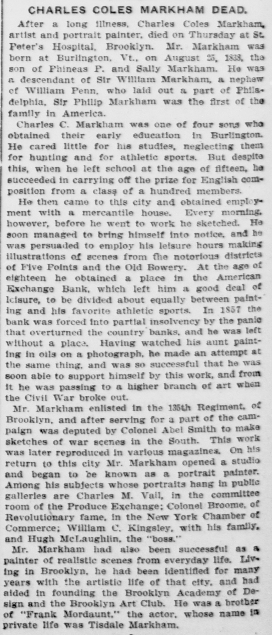 CHARLES COLES MARKHAM DEAD. After a long illness, Charles Coles Markham, artist and portrait painter, died on Thursday at St. Peter's Hospital, Brooklyn. Mr. Markham was born at Burlington, Vt., on August 25, 1838, the son of Phineas P. and Sally Markham. He was a descendant of Sir William Markham, a nephew of William Penn, who laid out & part of Philadelphia, Sir Philip Markham was the first of the family in America. Charles C. Markham was one of four sons who obtained their early education in Burlington. He cared little for his studies, neglecting them for hunting and for athletic sports. But despite this, when he left school at the age of fifteen, he succeeded in carrying off the prize for English composition from a class of a hundred members. He then came to this city and obtained employ= ment with a mercantile house. Every morning, however, before he went to work he sketched. He soon managed to bring himself into notice, and he was persuaded to employ his leisure hours making illustrations of scenes from the notorious districts of Five Points and the Old Bowery. At the age of eighteen he obtained a place in the American Exchange Bank, which left him a good deal of lcisure, to be divided about equally between painting and his favorite athletic sports. In 1857 the bank was forced into partial insolvency by the panic that overturned the country banks, and he was left without a place. Having watched his aunt painting in oils on a photograph, he made an attempt at the same thing. and was so successful that he was soon able to support himself by this work, and from it he was passing to a higher branch of art when the Civil War broke out. Mr. Markham enlisted in the 135th Regiment, of Brooklyn, and after serving for a part of the campaign was deputed by Colonel Abel Smith to make sketches of war scenes in the South. This work was later reproduced in various magazines. On his return to this city Mr. Markham opened a studio and began to be known as a portrait painter. Among his subjects whose portraits hang in public galleries are Charles M. Vail, in the committee room of the Produce Exchange: Colonel Broome, of Revolutionary fame, in the New York Chamber of Commerce; William C. Kingsley, with his family. and Hugh McLaughlin, the "boss." Mr. Markham had also been successful as & painter of realistic scenes from everyday life. Live ing in Brooklyn, he had been identified for many years with the artistic life of that city, and had aided in founding the Brooklyn Academy of Design and the Brooklyn Art Club. He was a brother of "Frank Mordaunt," the actor, whose name to private life was Tisdale Markham.