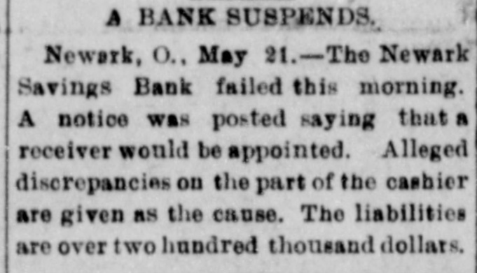 OHIO BANK FAILS Savings Bank at Newark, Ohio, Fails to Open Its Doors and Excitement Pre. vails-Working People Were Depositors. Newark, Ohio, May 21.-After a slight run yesterday the Newark Savings Bank did not open its doors today. The court appointed a receiver. The bank has thousands of deposits from working people here and there is great excitement. According to the receiver, discrepancies have been discovered in the books of the treasurer, James F. Lingafelter, but he has not been arrested.