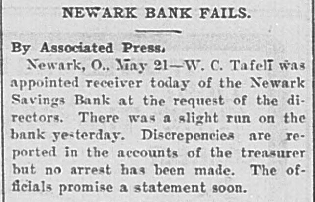 NEWARK BANK FAILS. By Associated Press, Newark, O. May 21-W. C. Tafelt was appointed receiver today of the Newark Savings Bank at the request of the directors. There was a slight run on the bank yesterday. Discrepencies are reported in the accounts of the treasurer but no arrest has been made. The officials promise a statement soon.