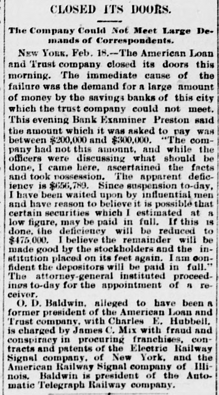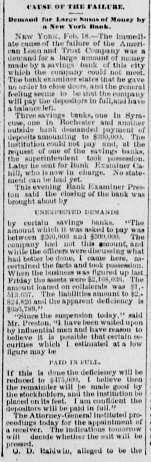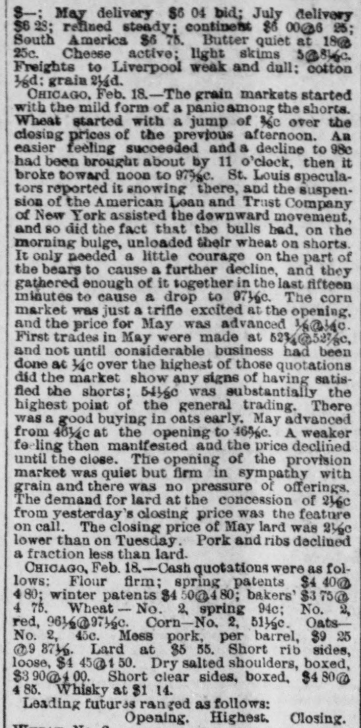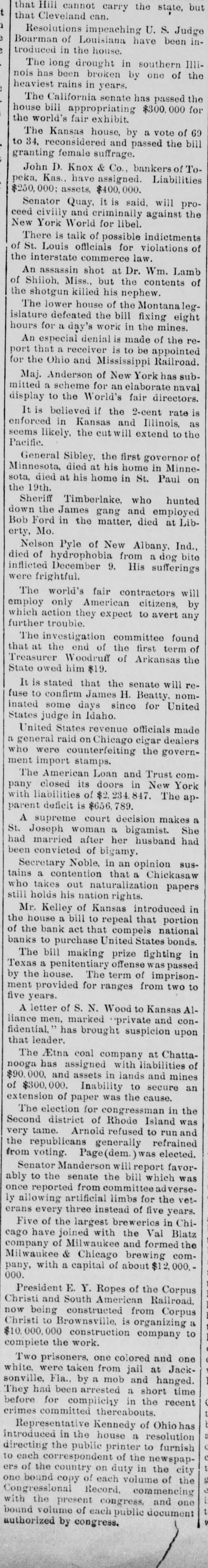 General. Feb. 17.-A Columbus, Hocking Valley & Toledo passenger train crashed into a Scioto Valley freight train at a crossing near Columbus, O., by a dense fog obscuring the target lights, and Engineer Charles Botwell of Portsmouth and two brothers named Johnson of Columbus were probably fatally injured, and Mr. Robert McClure of Reynoldsville, O., was less seriously hurt. Near Pittsburg, Pa., Monday morning a bowlder rolled from Du Quesne Heights and crashed into a Panhandle express train, breaking one car any killing Miss Clara Fleming aged 19 years, and seriously injuring several others. The drought in central and southern California has been broken by a heavy rainfall. S. W. Cowles, a banker of Clarks, Neb., was arrested Monday for the murder of his wife a short time ago. The visible supply Saturday as compiled by the New York Produce Exchange was of wheat, 23, 167,953 bushsls, a decrease of 190,873 bushels and of corn, 2,400,807 bushels, a decrease of 191,144 bushels. Butter was in brisk demand on the Elgin board of trade Monday, and 21,420 pounds sold at prices ranging from 29 to 291 cents against 261 and 271 cents one year ago. Women in Ohio have begun a crusade against obscene theatrical posters. In Springfield O., Monday. white paper was pasted over pictures of burlesquers. Charges of bribery when in office have been made against Ignatius Donnelly of cryptogram fame, a suit of damages resulting. The world's fair directors have asked Mayor Cregier of Chicago, for police protection for the Italian laborers at work at Jackson Park. Secretary Gibson of the whiskv trust has been indicted by the state of Illinois for his connection with the alleged dynamite conspiracy. The trust has issued a statement disclaiming all knowledge of the plot. Feb. 18.-Floods have done great damage in Pennsylvania towns, residents in many places being compelled to abandon their homes. Wrecked bridges and washouts have entirely stopped or retarded railway travel, and in West Virginia and parts of Ohio losses by the deluge will be heavy. The will of the late J. N. McCullough, vice president of the Pennsylvania Railway company. was filed for probate at Pittsburg Monday. His estate is valued at from $3,000,000 to $10,000,000. Tuesday at Philadelphia Miss Ava Lawle Willing was married to John Jacob Astor, of New York, and the jewels worn by the bride, many of which were gifts from the Astor family, are said to be almost priceless. The remains of admiral Porter, who died last Friday, were interred at Arlington Tuesday with imposing ceremonies. Judge Berkshire, of the Indiana supreme court was reported to be dying Tuesday. The St. Joseph Ballot has suspended publication. At Springfield. III., the republicans have split badly on the senatorial question. Maj. Anderson of New York has submitted a scheme for an elaborate naval display to the World's Fair directors. J. W. Saeter, a passenger on an Iron Mountain train, became suddenly insane at Bald Knob, Ark., and shot and killed Pullman Conductor Leech and Isadore Meyers, a drummer. The steamboat Thomas Sherlock struck the pier of a railroad bridge just after leaving Cincinnatti for New Orleans and sank. Three lives were lost. The Union Investment Company, of Kansas City, filed an assignment on Wednesday at Boston. Gen. H. H. Sibley, the first Governor af Minnesota, died Wednesday morning in his home at St. Paul. The Illinois senate, on Wednesday passed the bill making the contract rate of interest 7 per cent, and the legal rate 5 per cent. John D. Knox & Co., bankers of Topeke, Kas., have assigned. Liabilities, $250,000; assets, $400,000. The American Loan and Trust Company closed its doors in New York with liabilities of $2,234,874The apparent deficit is $656,789. The