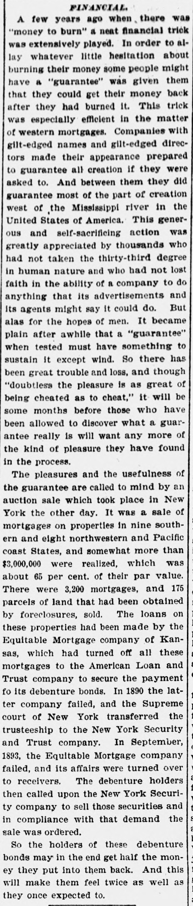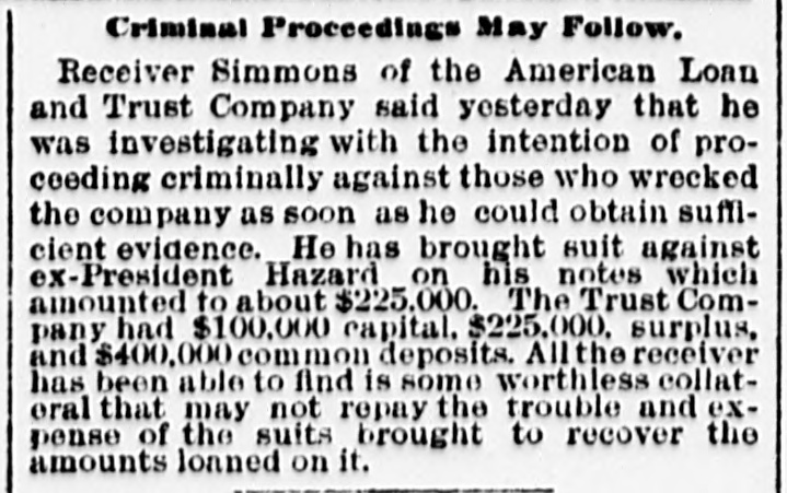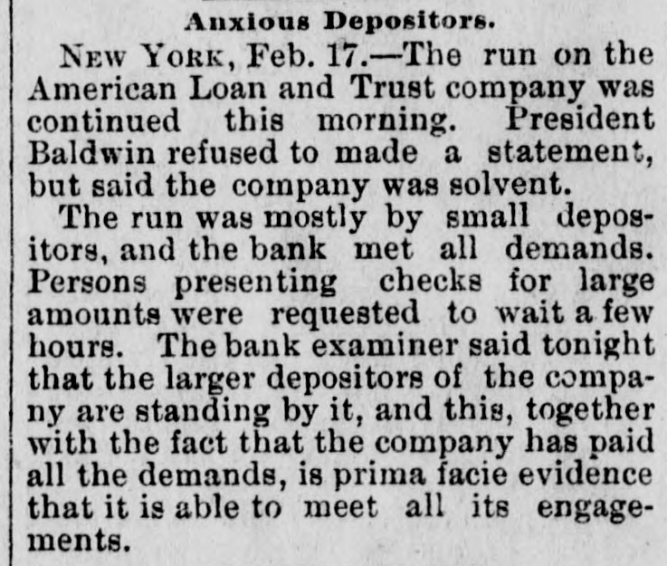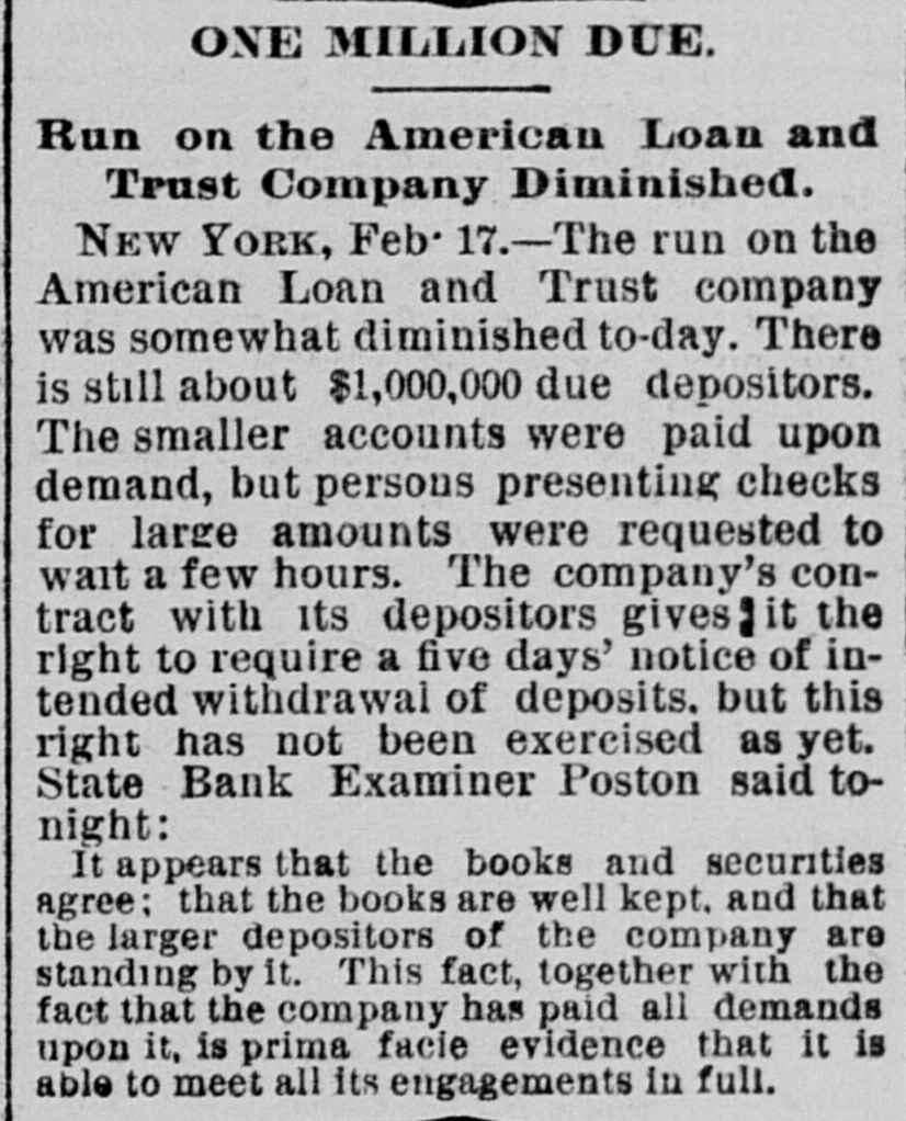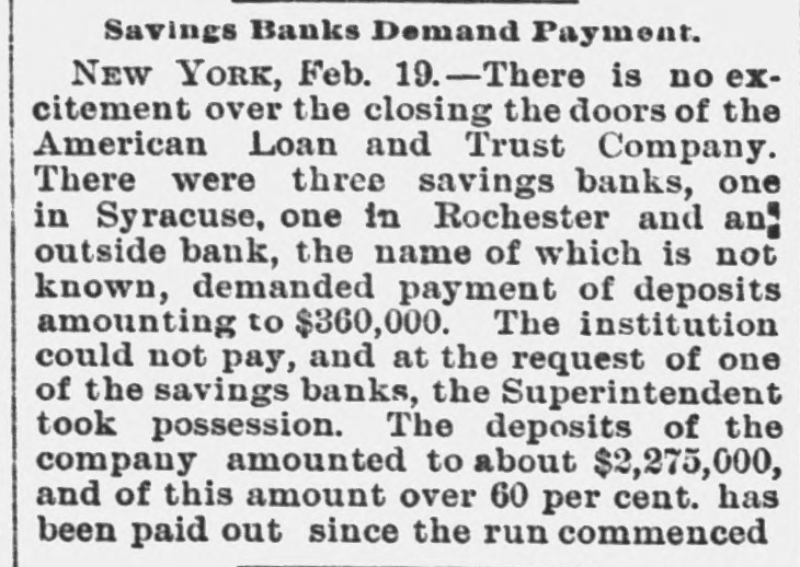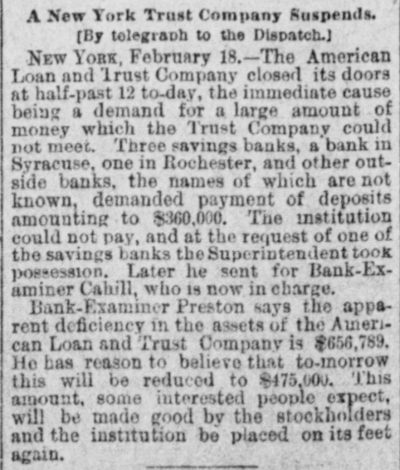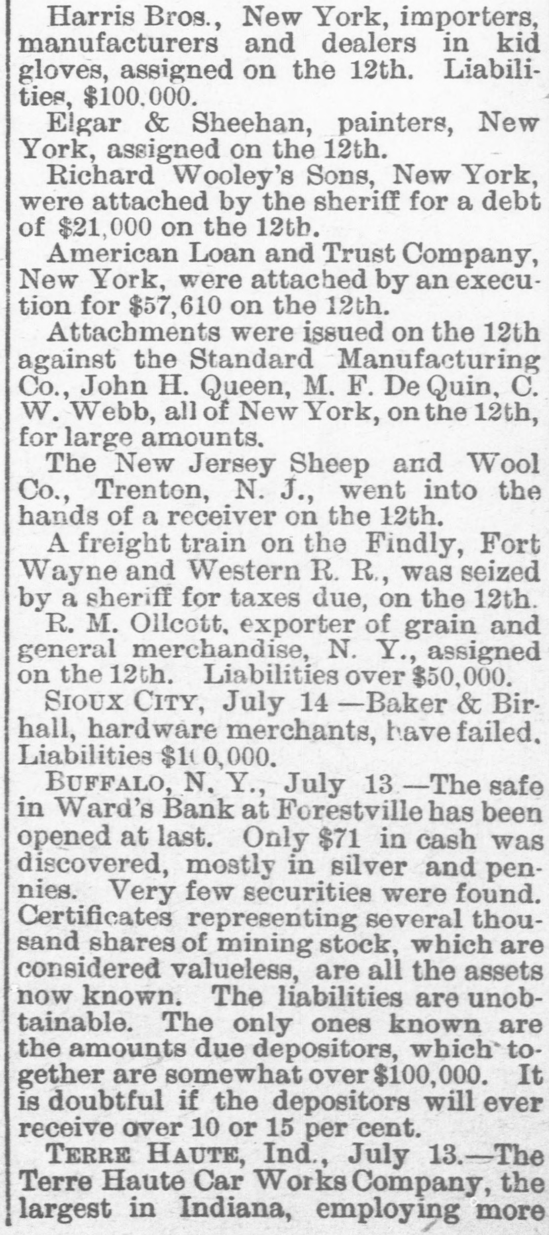General. Feb. 17.-A Columbus, Hocking Valley & Toledo passenger train crashed into a Scioto Valley freight train at a crossing near Columbus, O., by a dense fog obscuring the target lights, and Engineer Charles Botwell of Portsmouth and two brothers named Johnson of Columbus were probably fatally injured, and Mr. Robert McClure of Reynoldsville, O., was less seriously hurt. Near Pittsburg, Pa., Monday morning a bowlder rolled from Du Quesne Heights and crashed into a Panhandle express train, breaking one car any killing Miss Clara Fleming aged 19 years, and seriously injuring several others. The drought in central and southern California has been broken by a heavy rainfall. S. W. Cowles, a banker of Clarks, Neb., was arrested Monday for the murder of his wife a short time ago. The visible supply Saturday as compiled by the New York Produce Exchange was of wheat, 23, 167,953 bushsls, a decrease of 190,873 bushels and of corn, 2,400,807 bushels, a decrease of 191,144 bushels. Butter was in brisk demand on the Elgin board of trade Monday, and 21,420 pounds sold at prices ranging from 29 to 291 cents against 261 and 271 cents one year ago. Women in Ohio have begun a crusade against obscene theatrical posters. In Springfield O., Monday. white paper was pasted over pictures of burlesquers. Charges of bribery when in office have been made against Ignatius Donnelly of cryptogram fame, a suit of damages resulting. The world's fair directors have asked Mayor Cregier of Chicago, for police protection for the Italian laborers at work at Jackson Park. Secretary Gibson of the whiskv trust has been indicted by the state of Illinois for his connection with the alleged dynamite conspiracy. The trust has issued a statement disclaiming all knowledge of the plot. Feb. 18.-Floods have done great damage in Pennsylvania towns, residents in many places being compelled to abandon their homes. Wrecked bridges and washouts have entirely stopped or retarded railway travel, and in West Virginia and parts of Ohio losses by the deluge will be heavy. The will of the late J. N. McCullough, vice president of the Pennsylvania Railway company. was filed for probate at Pittsburg Monday. His estate is valued at from $3,000,000 to $10,000,000. Tuesday at Philadelphia Miss Ava Lawle Willing was married to John Jacob Astor, of New York, and the jewels worn by the bride, many of which were gifts from the Astor family, are said to be almost priceless. The remains of admiral Porter, who died last Friday, were interred at Arlington Tuesday with imposing ceremonies. Judge Berkshire, of the Indiana supreme court was reported to be dying Tuesday. The St. Joseph Ballot has suspended publication. At Springfield. III., the republicans have split badly on the senatorial question. Maj. Anderson of New York has submitted a scheme for an elaborate naval display to the World's Fair directors. J. W. Saeter, a passenger on an Iron Mountain train, became suddenly insane at Bald Knob, Ark., and shot and killed Pullman Conductor Leech and Isadore Meyers, a drummer. The steamboat Thomas Sherlock struck the pier of a railroad bridge just after leaving Cincinnatti for New Orleans and sank. Three lives were lost. The Union Investment Company, of Kansas City, filed an assignment on Wednesday at Boston. Gen. H. H. Sibley, the first Governor af Minnesota, died Wednesday morning in his home at St. Paul. The Illinois senate, on Wednesday passed the bill making the contract rate of interest 7 per cent, and the legal rate 5 per cent. John D. Knox & Co., bankers of Topeke, Kas., have assigned. Liabilities, $250,000; assets, $400,000. The American Loan and Trust Company closed its doors in New York with liabilities of $2,234,874The apparent deficit is $656,789. The