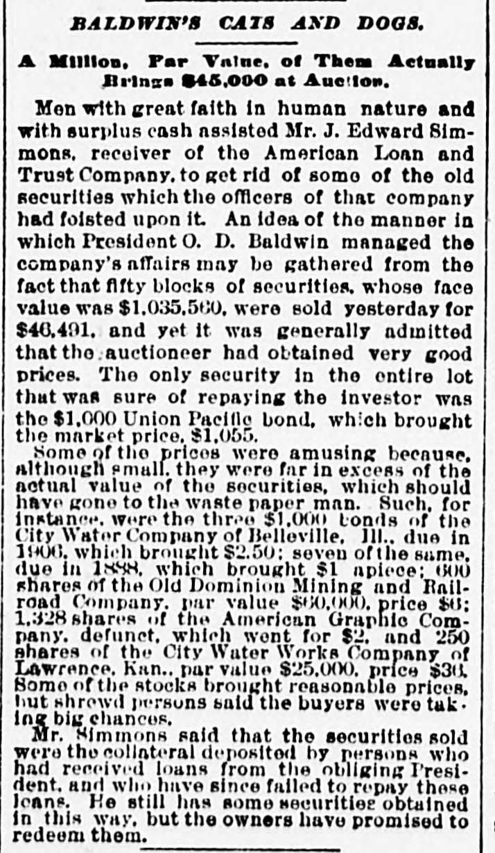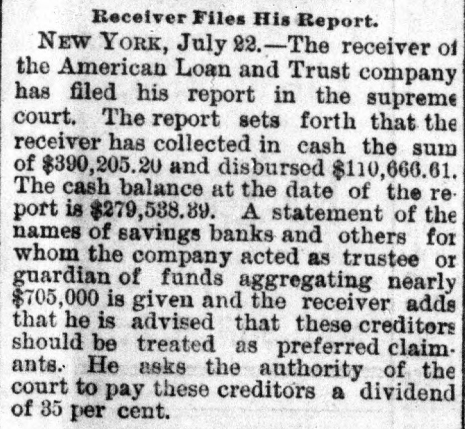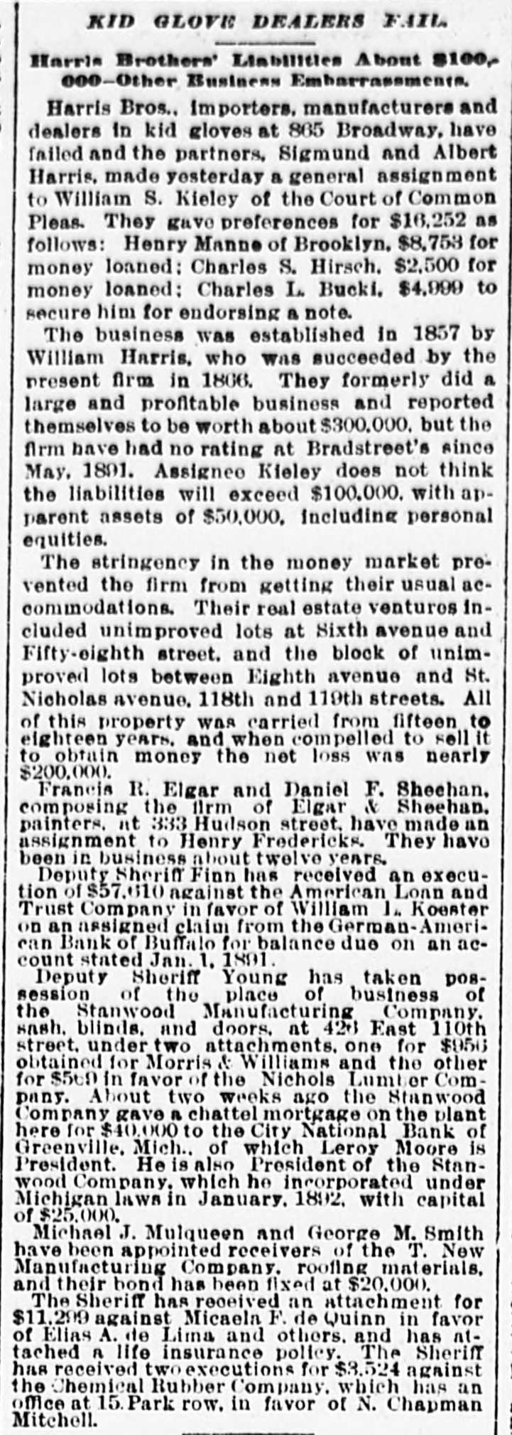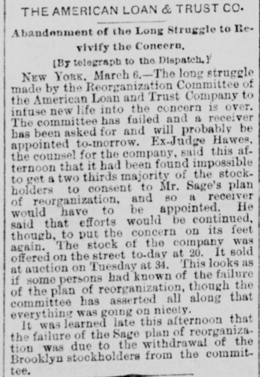 General. Feb. 17.-A Columbus, Hocking Valley & Toledo passenger train crashed into a Scioto Valley freight train at a crossing near Columbus, O., by a dense fog obscuring the target lights, and Engineer Charles Botwell of Portsmouth and two brothers named Johnson of Columbus were probably fatally injured, and Mr. Robert McClure of Reynoldsville, O., was less seriously hurt. Near Pittsburg, Pa., Monday morning a bowlder rolled from Du Quesne Heights and crashed into a Panhandle express train, breaking one car any killing Miss Clara Fleming aged 19 years, and seriously injuring several others. The drought in central and southern California has been broken by a heavy rainfall. S. W. Cowles, a banker of Clarks, Neb., was arrested Monday for the murder of his wife a short time ago. The visible supply Saturday as compiled by the New York Produce Exchange was of wheat, 23, 167,953 bushsls, a decrease of 190,873 bushels and of corn, 2,400,807 bushels, a decrease of 191,144 bushels. Butter was in brisk demand on the Elgin board of trade Monday, and 21,420 pounds sold at prices ranging from 29 to 291 cents against 261 and 271 cents one year ago. Women in Ohio have begun a crusade against obscene theatrical posters. In Springfield O., Monday. white paper was pasted over pictures of burlesquers. Charges of bribery when in office have been made against Ignatius Donnelly of cryptogram fame, a suit of damages resulting. The world's fair directors have asked Mayor Cregier of Chicago, for police protection for the Italian laborers at work at Jackson Park. Secretary Gibson of the whiskv trust has been indicted by the state of Illinois for his connection with the alleged dynamite conspiracy. The trust has issued a statement disclaiming all knowledge of the plot. Feb. 18.-Floods have done great damage in Pennsylvania towns, residents in many places being compelled to abandon their homes. Wrecked bridges and washouts have entirely stopped or retarded railway travel, and in West Virginia and parts of Ohio losses by the deluge will be heavy. The will of the late J. N. McCullough, vice president of the Pennsylvania Railway company. was filed for probate at Pittsburg Monday. His estate is valued at from $3,000,000 to $10,000,000. Tuesday at Philadelphia Miss Ava Lawle Willing was married to John Jacob Astor, of New York, and the jewels worn by the bride, many of which were gifts from the Astor family, are said to be almost priceless. The remains of admiral Porter, who died last Friday, were interred at Arlington Tuesday with imposing ceremonies. Judge Berkshire, of the Indiana supreme court was reported to be dying Tuesday. The St. Joseph Ballot has suspended publication. At Springfield. III., the republicans have split badly on the senatorial question. Maj. Anderson of New York has submitted a scheme for an elaborate naval display to the World's Fair directors. J. W. Saeter, a passenger on an Iron Mountain train, became suddenly insane at Bald Knob, Ark., and shot and killed Pullman Conductor Leech and Isadore Meyers, a drummer. The steamboat Thomas Sherlock struck the pier of a railroad bridge just after leaving Cincinnatti for New Orleans and sank. Three lives were lost. The Union Investment Company, of Kansas City, filed an assignment on Wednesday at Boston. Gen. H. H. Sibley, the first Governor af Minnesota, died Wednesday morning in his home at St. Paul. The Illinois senate, on Wednesday passed the bill making the contract rate of interest 7 per cent, and the legal rate 5 per cent. John D. Knox & Co., bankers of Topeke, Kas., have assigned. Liabilities, $250,000; assets, $400,000. The American Loan and Trust Company closed its doors in New York with liabilities of $2,234,874The apparent deficit is $656,789. The
