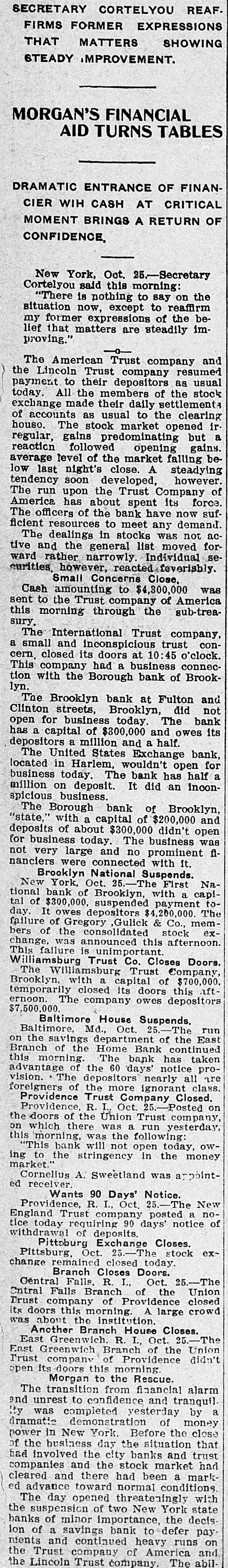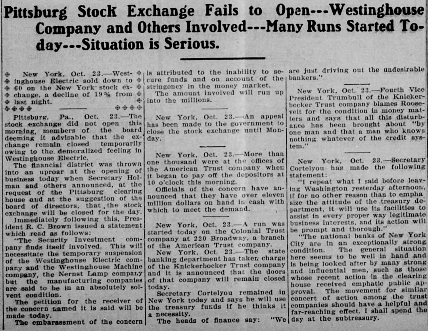 Pittsburg Stock Exchange Fails to Open Westinghouse Company and Others Involved Many Runs Started ToSituation is Serious. day is attributed to the inability to se- are just driving out the undesirable New York, Oct. 23. -Westbankers." cure funds and on account of the inghouse Electric sold down to stringency in the money market. 60 on the New York stock exNew York, Oct. 23.-Fourth Vice The amount involved will run up change, a decline of 19% from President Trumbull of the Knickerinto the millions. last night. bocker Trust company blames Roosevelt for the condition in money matNew York, Oct. 23. An appeal Pittsburg, Pa., Oct. 23.-The ters and says that all this disturbhas been made to the government to stock exchange did not open this ance has been brought about "by close the stock exchange until Monmorning, members of the board one man and that a man who knows deeming it advisable that the exday. nothing whatever of the credit syschange remain closed temporarily tem. owing to the. demoralized feeling in New York, Oct. 23.-More than Westinghouse Electric. New York, Oct. 3.-Secretary one thousand were at the offices of The financial district was thrown Cortelyou has made the following the American Trust company when into an uproar at the opening of statement: it began to pay off the depositors at business today when Secretary Hol"I repeat what I said before leav10 o'clock this morning. man and others announced, at the Officials of the concern have aning Washington yesterday afternoon, request of the Pittsburg clearing if for no other reason than to empha nounced that they have over eleven house and at the suggestion of the size the attitude of the treasury demillion dollars on hand in cash with board of directors, that the stock which to meet the demand. partment, it will use its facilities to exchange will be closed for the day. assist in every proper way legitimate Immediately following this, Presbusiness interests, and its action will New York, Oct. 23.- run was ident R. C. Brown issued a statement be prompt and thorough." started today on the Colonial Trust which read as follows: "The national banks of New York company at 220 Broadway, a branch "The Security Investment comCity are in an exceptionally strong of the American Trust company. pany finds itself involved. This will condition. The general situation New York, Oct 3.-The state necessitate the temporary suspension here seems to be well in hand and banking department has taken charge of the Westinghouse Electric comis being looked after by many strong of the Knickerbocker Trust company pany and the Westinghouse Machine and influential men, such as those and it is announced that the doors company, the Nernst Lamp company whose recent action in the clearing of that company will remain closed but the manufacturing companies house received emphatic public aptoday. are said to be in an absolutely solproval. The movement for similar Secretary Cortelyou remained in vent condition. concert of action among the trust New York today and says he will use The petition for the receiver of companies should have a helpful and the treasury funds if he thinks it the concern Lamed it is said will be far-reaching effect. I shall spend the a necessity. made today. day at the subtreasury. The heads of finance say: "We The embarassment of the concern