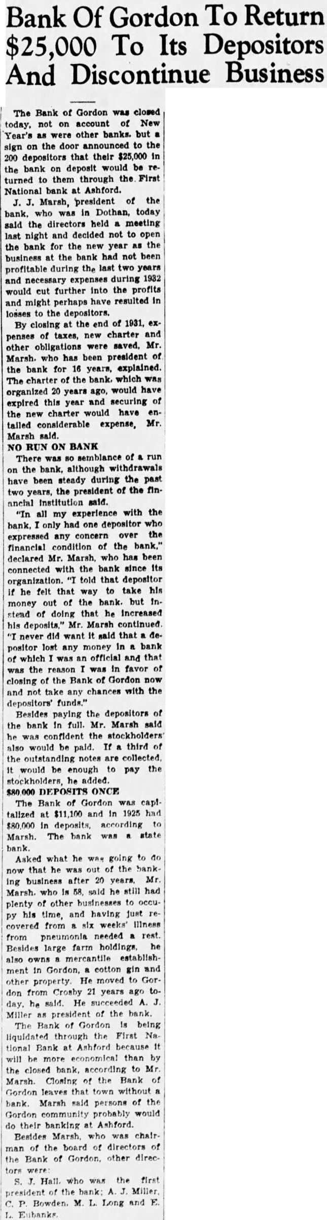 Of Gordon To Return Bank To Its Depositors And Discontinue Business The Bank of Gordon was closed not account of New today, Year's other banks. but sign on the door announced to the 200 depositors that their $25,000 the bank on deposit would be turned to them through the First National bank at Ashford. president of the Marsh, bank. who was in Dothan, today said the directors held meeting last night and decided not to open the bank for the new year the the bank had not been business during the last two years profitable and necessary expenses during 1932 would cut further into the profits have resulted and might perhaps losses the depositors. By closing at the end of 1931, penses of taxes, new charter and were saved. Mr. other obligations Marsh. who has been president bank for 16 years, explained. the The charter of the bank. which was 20 ago, would have organized years expired this year and securing the charter would have considerable Mr. tailed expense, Marsh said. NO RUN ON BANK There was semblance of run the bank. although withdrawals been steady during the past have the president of the fintwo years, Institution said. "In all experience with the bank. only had one depositor who expressed any concern over the financial condition of the bank." declared Mr. who has been connected with the bank since Its organization. told that depositor he felt that take his way out of the bank. but Inmoney stead of doing that he increased his deposits." Mr. Marsh continued never did want said that lost money bank positor any which official and that was the reason in favor closing of the Bank of Gordon now and not take any chances with the depositors' funds." Besides paying the depositors the bank full. Mr. Marsh said he confident the also would be paid. third the outstanding notes are collected. would be enough to pay the stockholders, he added. DEPOSITS ONCE The Bank of Gordon was capitalized $11,100 and 1925 had $80,000 deposits, The bank state Marsh. bank. Asked what he going now that he was out business after 20 Mr. Marsh. who is said he still had plenty other businesses to occuhis time, and having just covered from weeks' Illness from pneumonia needed rest. Besides large farm holdings. mercantile establishalso cotton gin and ment He moved to property. don from Crosby years ago he He succeeded president of the bank. The Bank Gordon being liquidated through the First tional Bank Ashford because will be more economical than the closed bank, according to Marsh. Closing the Bank of Gordon leaves that town without bank. Marsh said the persons Gordon probably would their banking Ashford. Besides who of the board directors of man the Bank of other direcHall. who the first president the bank: Bowden. Long and