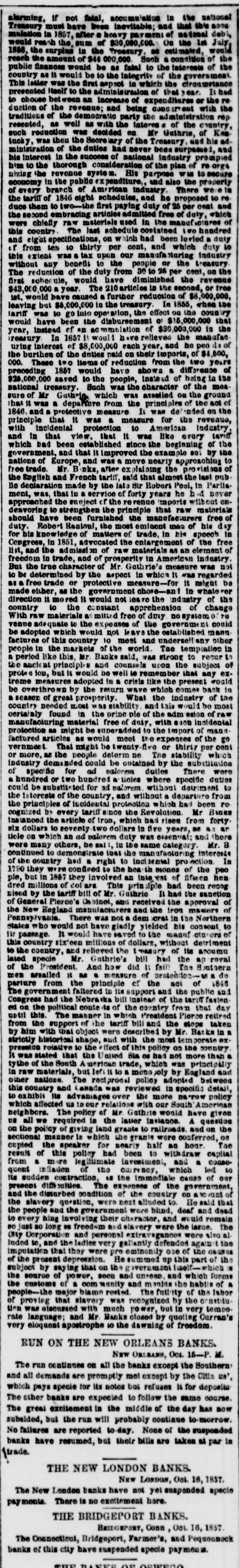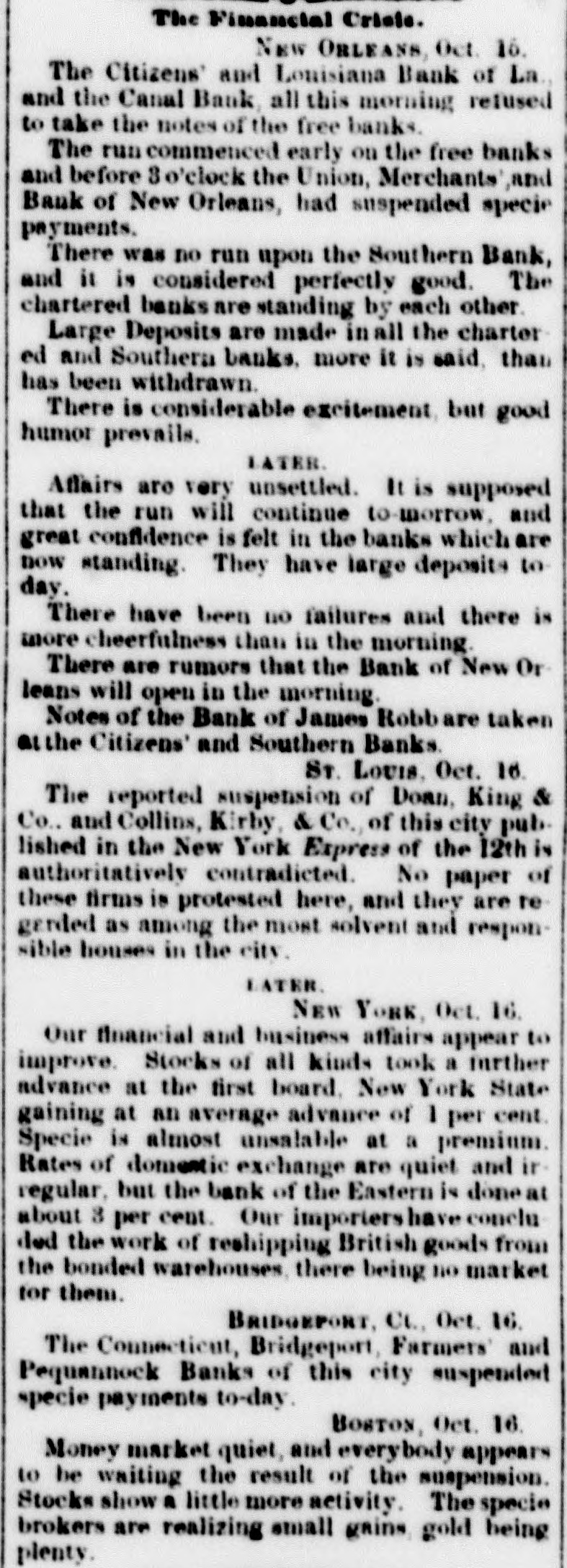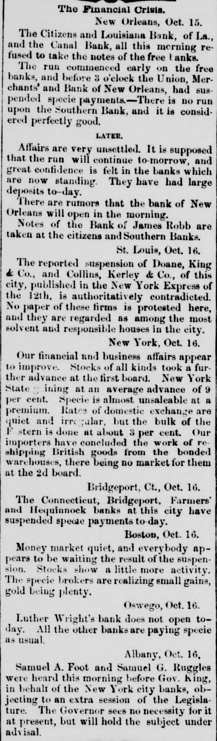 The Financial Crisis. New Orleans, Oct. 15. The Citizens and Louisiana Bank, of La., and the Canal Bank, all this morning refused to take the notes of the free tanks. The run commenced early on the free banks, and before 3 o'clock the Union, Merchants' and Bank of New Orleans, had suspended specie payments.There is no run upon the Southern Bank, and it is considered perfectly good. LATER. Affairs are very unsettled. It is supposed that the run will continue to-morrow, and great confidence is felt in the banks which are now standing. They have had large deposits to-day. There are rumors that the bank of New Orleans will open in the morning. Notes of the Bank of James Robb are taken at the citizens and Southern Banks. St. Louis, Oct. 16. The reported suspension of Doane, King & Co., and Collins, Kerley & Co., of this city, published in the New York Express of the 12th, is authoritatively contradicted. No paper of these firms is protested here, and they are regarded as among the most solvent and responsible houses in the city. New York, Oct. 16. Our financial and business affairs appear to improve. Stocks of all kinds took a further advance at the first board. New York State S ining at an average advance of 9 per cent. Specie is almost unsaleable at a are premium. quiet and irregular, Rates of domestic but the exchange bulk of the F stern is done at about 3 per cent. Our importers have concluded the work of reshipping British goods from the bonded warehouses, there being no market for them at the 2d board. Bridgeport, Ct., Oct. 16. The Connecticut, Bridgeport, Farmers' and Hequinnock banks at this city have suspended specie payments to day. Boston, Oct. 16. Money market quiet, and everybody appears to be waiting the result of the suspension. Stocks show a little more activity. The specie brokers are realizing small gains, gold being plenty. Oswego, Oct. 16. Luther Wright's bank does not open today. All the other banks are paying specie as usual. Albany, Oct. 16. Samuel A. Foot and Samuel G. Ruggles were heard this morning before Gov. King, in behalf of the New York city banks, objecting to an extra session of the Legislature. The Governor sees no necessity for it at present, but will hold the subject under advisal.