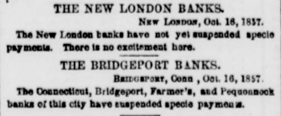 THE NEW LONDON BANKS. New LONDON, Oct. 16, 1837. The New London banks have not yet suspended specie payments. There is no excitement here. THE BRIDGEPORT BANKS. BRIDGEPORT, Conn, Oct. 16, 1857. The Connecticut, Bridgeport, Farmer's, and Pequonmock banks of this city have suspended specie payments.
