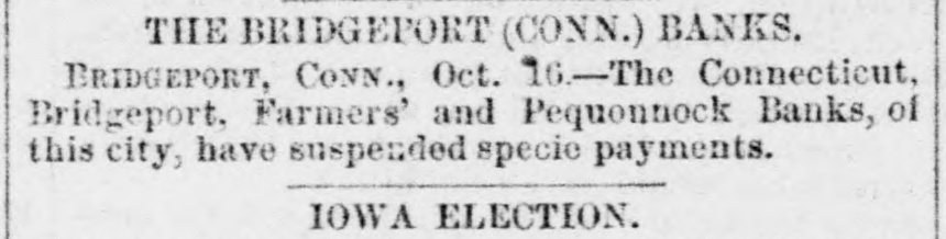 THE bridgeport (CONN.) BANKS. BRIDGEPORT, CONN., Oct. 16-The Connecticut, Bridgeport, Farmers' and Pequonnock Banks, of this city, have suspended specie payments. IOWA ELECTION.