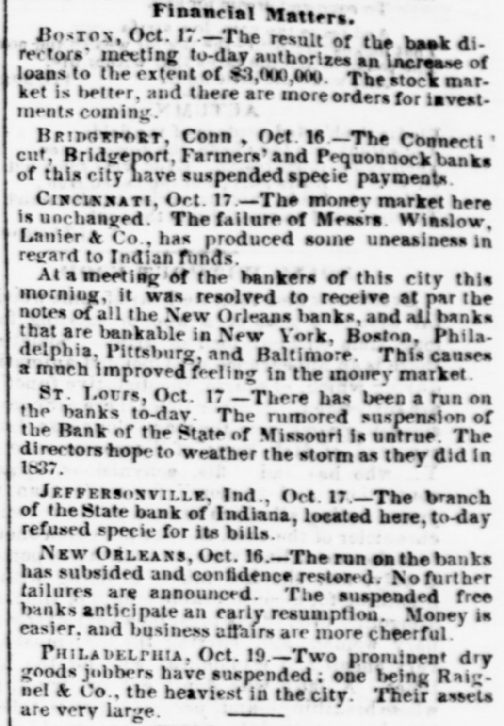 Financial Matters. BOSTON, Oct. 17.-The result of the bank directors' meeting to-day authorizes an increase of loans to the extent of $3,000,000. The stock market is better, and there are more orders for investments coming. BRIDGEPORT, Conn, Oct. 16-The Connecti cut, Bridgeport, Farmers' and Pequonnock banks of this city have suspended specie payments. CINCINNATI, Oct. 17.-The money market here is unchanged. The failure of Messrs. Winslow, Lanier & Co., has produced some uneasiness in regard to Indian funds. At a meeting of the bankers of this city this morning, it was resolved to receive at par the notes of all the New Orleans banks, and all banks that are bankable in New York, Boston, Philadelphia, Pittsburg, and Baltimore. This causes a much improved feeling in the money market. Sr. Lours, Oct. 17 -There has been a run on the banks to-day. The rumored suspension of the Bank of the State of Missouri is untrue. The directors 1837. hope to weather the storm as they did In JEFFERSONVILLE, Ind., Oct. 17-The branch of the State bank of Indiana, located here, to-day refused specie for its bills. NEW ORLEANS, Oct. 16.-The run on the banks has subsided and confidence restored. No further tailures are announced. The suspended free banks anticipate an early resumption. Money is easier. and business affairs are more cheerful. Philadelphia, Oct. 19.-Two prominent dry goods jobbers have suspended: one being Raignel & Co., the heaviest in the city. Their assets are very large.