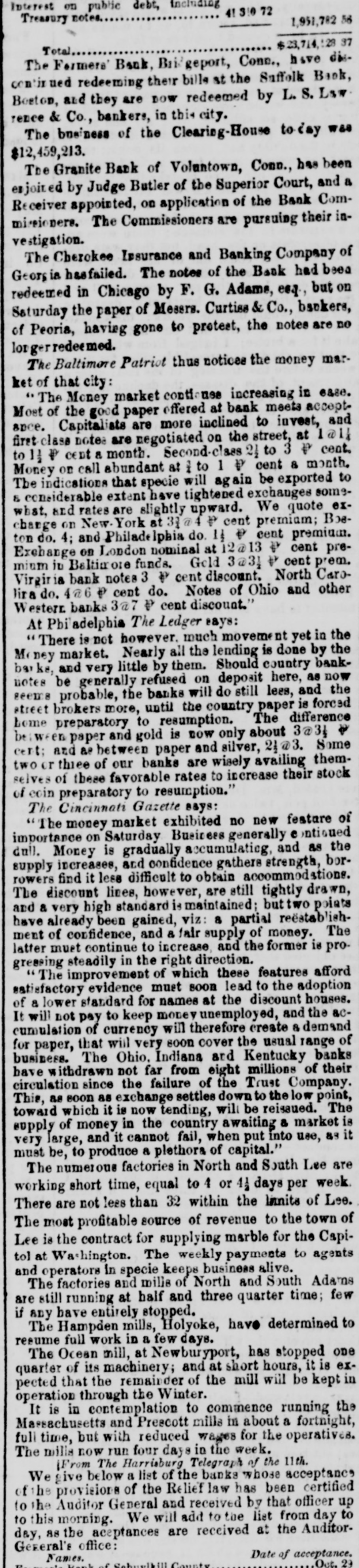 Interest on public debt, including 413072 Treasury notes. 1,951,782 56 $23,714,128 37 The Total Fermers' Bank, Bridgeport, Conn., have didcontir ued redeeming their bills at the Suffolk Bank, Boston, and they are now redeemed by L. S. Law rence & Co., bankers, in this city. The business of the Clearing-House to day was $12,459,213. The Granite Bank of Voluntown, Conn., has been enjoined by Judge Butler of the Superior Court, and a Receiver appointed, on application of the Bank Commissioners. The Commissioners are pursuing their investigation. The Cherokee Issurance and Banking Company of Georg is hasfailed. The notes of the Bank had been redeemed in Chicago by F. G. Adams, esq., but on Saturday the paper of Messrs. Curtise & Co., bankers, of Peoria, having gone to protest, the notes are no longerredeemed. The Baltimore Patriot thus notices the money market of that city: The Money market continues increasing in ease. Most of the good paper offered at bank meets acceptance. Capitalists are more inclined to invest, and first class notes are negotiated on the street, at 1@1k to P cent a month. Second-class 21 to 3 P cent. Money on call abundant at I to 1 P cent & month. The indications that specie will again be exported to & considerable extent have tightened exchanges somewhat, and rates are slightly upward. We quote exchange on New. York at 31 P cent premium; Boston do. 4; and Philadelphia do. 11 P cent premium. Exchange on London nominal at 12@13 P cent premium in Baltimor funds. Gold 3@31 P cent prem. Virgiria bank notes 3 P cent discount. North Carolira do. 4@6 P cent do. Notes of Ohio and other Western banks 3@7 P cent discount." At Philadelphia The Ledger says: There is not however. much movement yet in the Mc ney market. Nearly all the lending is done by the bar ke, and very little by them. Should country banknotes be generally refused on deposit here, as now seems probable, the banks will do still less, and the street brokers more, until the country paper is forced home preparatory to resumption. The difference paper and gold is now only about 3@3| * cert; and as between paper and silver, 21@3. Some two or three of our banks are wisely availing themselves of these favorable rates to increase their stock of coin preparatory to resumption." The Cincinnati Gazette says: The money market exhibited no new feature of importance on Saturday Business generally e ontioned dull. Money is gradually accumulating, and as the supply increases, and confidence gathers strength, borrowers find it less difficult to obtain accommodations. The discount lines, however, are still tightly drawn, and & very high standard is maintained; but two points have already been gained, viz: 8 partial reestablishment of confidence, and a fair supply of money. The latter muet continue to increase, and the former is progressing steadily in the right direction. The improvement of which these features afford satisfactory evidence must soon lead to the adoption of a lower standard for names at the discount houses. It will not pay to keep money unemployed, and the accumulation of currency will therefore create & demand for paper, that will very soon cover the usual range of business. The Ohio, Indiana and Kentucky banks have withdrawn not far from eight millions of their circulation since the failure of the Trust Company. This, as soon as exchange settles down to the low point, toward which it is now tending, will be reissued. The supply of money in the country awaiting a market is very large, and it cannot fail, when put into use, as it must be, to produce a plethora of capital." The numerous factories in North and South Lee are working short time, equal to 4 or 41 days per week. There are not less than 32 within the Innits of Lee. The most profitable source of revenue to the town of Lee is the contract for supplying marble for the Capitol at Washington. The weekly payments to agents and operators In specie keeps business alive. The factories and mills of North and South Adams are still running at half and three quarter time; few if any have entirely stopped. The Hampden mills, Holyoke, have determined to resume full work in a few days. The Ocean mill, at Newburyport, has stopped one quarter of its machinery; and at short hours, it is expected that the remainder of the mill will be kept in operation through the Winter. It is in contemplation to commence running the Massachusetts and Prescott mills in about a fortnight, full time, but with reduced wages for the operatives. The mills now run four days in the week. ¡From The Harrisburg Telegraph of the 11th. We give below a list of the banks whose acceptance of the provisions of the Relief law has been certified to the Auditor General and received by that officer up to this morning. We will add to the list from day to day, as the aceptances are received at the AuditorGeneral's office: Date of acceptance. Oct. 29 Names. of Schulkill County