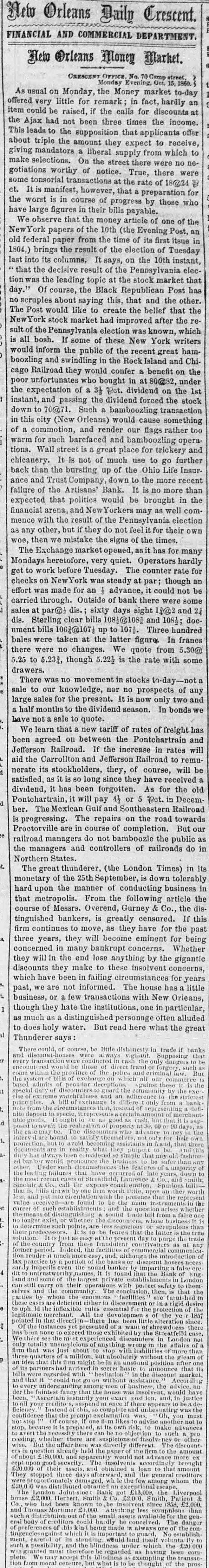 New Orleans Daily Crescent. FINANCIAL AND COMMERCIAL DEPARTMENT. # New Orleans Money Market. CRESCENT OFFICE, No. 70 Camp street, Monday Evening, Oct. 15, 1860. As usual on Monday, the Money market to-day offered very little for remark; in fact, hardly an item could be raised, if the calls for discounts at the Ajax had not been three times the income. This leads to the supposition that applicants offer about triple the amount they expect to receive, giving mandators a liberal supply from which to make selections. On the street there were no negotiations worthy of notice. True, there were some tonsorial transactions at the rate of 18@24 ct. It is manifest, however, that a preparation for the worst is in course of progress by those who have large figures in their bills payable. We observe that the money article of one of the NewYork papers of the 10th (the Evening Post, an old federal paper from the time of its first itsue in 1804,) brings the result of the election of Tuesday last into its columns. It says, on the 10th instant, "that the decisive result of the Pennsylvania election was the leading topic at the stock market that day." Of course, the Black Republican Post has no scruples about saying this, that and the other. The Post would like to create the belief that the NewYork stock market had improved after the result of the Pennsylvania election was known, which is all bosh. If some of these New York writers would inform the public of the recent great bamboozling and swindling in the Rock Island and Chicago Railroad they would confer a benefit on the poor unfortunates who bought in at 80@82, under the expectation of a 34 ct. dividend on the 1st instant, and passing the dividend forced the stock down to 70@71. Such a bamboozling transaction in this city (New Orleans) would cause something of a commotion, and render our flags rather too warm for such barefaced and bamboozling operations. Wall street is a great place for trickery and chicanery. It is not of much use to go further back than the bursting up of the Ohio Life Insurance and Trust Company, down to the more recent failure of the Artisans' Bank. It is no more than expected that politics would be brought in the financial arena, and New Yorkers may as well commence with the result of the Pennsylvania election as any other, but if they do not feel it for their own woe, then we mistake the signs of the times. The Exchange market opened, as it has for many Mondays heretofore, very quiet. Operators hardly get to work before Tuesday. The counter rate for checks on NewYork was steady at par; though an effort was made for an advance, it could not be carried through. Outside of bank there were some sales at par@dis.; sixty days sight 1@2 and 2½ dis. Sterling clear bills 108@108½ and 108¾; document bills 106¾@107 up to 107½. Three hundred bales were taken at the latter figure. In francs there were no changes. We quote from 5.30@ 5.25 to 5.23¾, though 5.22½ is the rate with some drawers. There was no movement in stocks to-day-not a sale to our knowledge, nor no prospects of any large sales for the present. It is now only two and a half months to the dividend season. In bonds we have not a sale to quote. We learn that a new tariff of rates of freight has been agreed on between the Pontchartrain and Jefferson Railroad. If the increase in rates will aid the Carrollton and Jefferson Railroad to remunerate its stockholders, they, of course, will be satisfied, as it is so long since they have received a dividend, it has been forgotten. As for the old Pontchartrain, it will pay 4½ or 5 pct. in December. The Mexican Gulf and Southeastern Railroad is progressing. The repairs on the road towards Proctorville are in course of completion. But our railroad managers do not bamboozle the public as the managers and controllers of railroads do in Northern States. The great thunderer, (the London Times) in its monetary of the 25th September, is down tolerably hard upon the manner of conducting business in that metropolis. From the following article the course of Messrs. Overend, Gurney & Co., the distinguished bankers, is greatly censured. If this firm continues to move, as they have for the past three years, they will become eminent for being concerned in many bankrupt concerns. Whether they will in the end lose anything by the gigantic discounts they make to these insolvent concerns, which have been in failing circumstances for years past, we are not informed. The house has a little business, or a few transactions with New Orleans, though they hate the institutions, one in particular, as much as a distinguished personage often alluded to does holy water. But read here what the great Thunderer says: There could, of course, be little dishonesty in trade if banks and discount-houses were always vigilant. Supposing that every transaction were conducted in cash, the only dangers to be encountered would be those of direct fraud or forgery, such as come within the province of the police and criminal law. But the system of bills of exchange on which all our commerce is based admits of peculiar deceptions. Against these it is the special duty of discounters to guard the community by the exercise of extreme watchfulness and an adherence to the strictest principles. A bill of exchange is different only from a bank-note from the circumstances that, instead of representing a definite deposit in specie, it represents a certain amount of merchantable goods. It ought to be as good as cash, but that it is supposed to await the realization of property at 30, 60 or 90 days, as the case may be. The discounters who advance money in the interval are bound to satisfy themselves, not only for heir own protection, but to avoid becoming assistants in fraud, that these documents are in reality what they purport to be. And this duty has always been considered so simple that any old-fashioned banker would pronounce the business to be safer than any other. Under such circumst