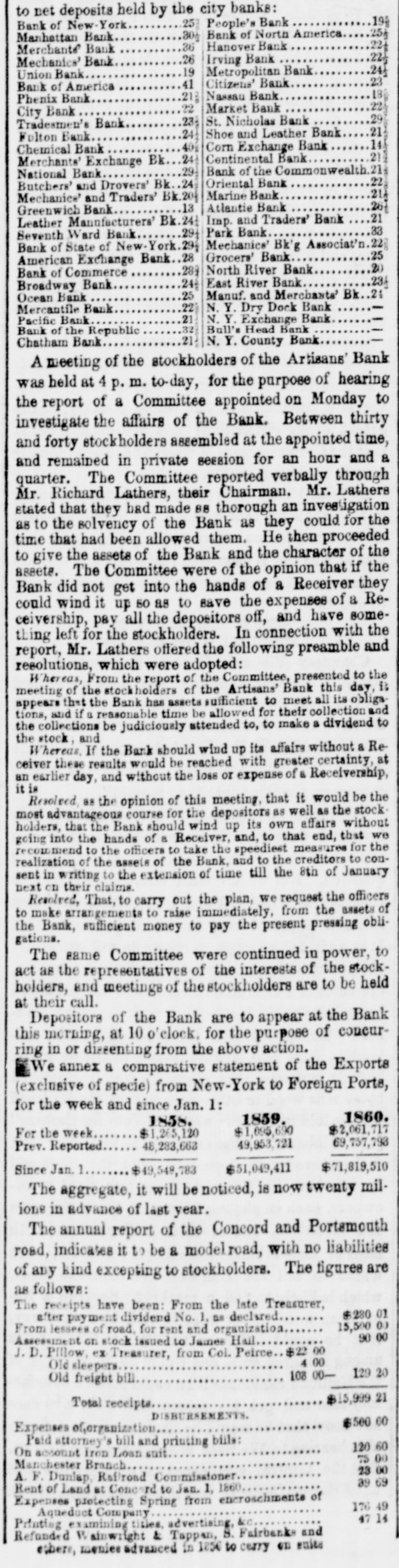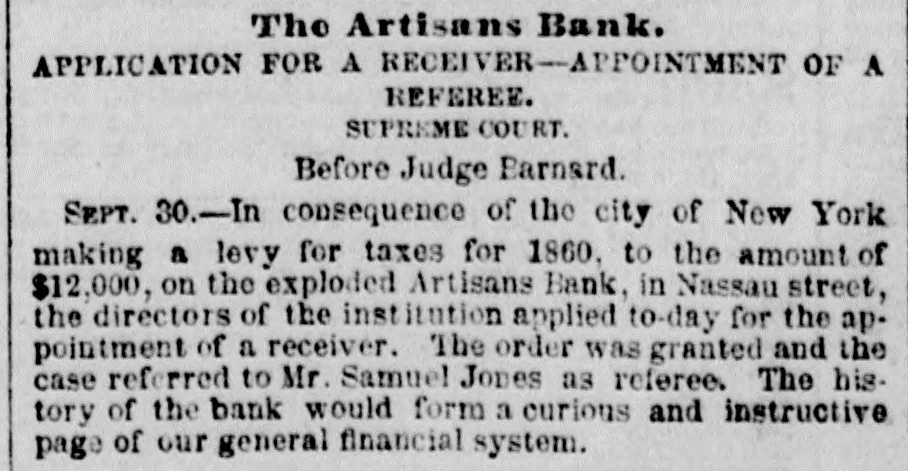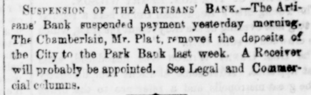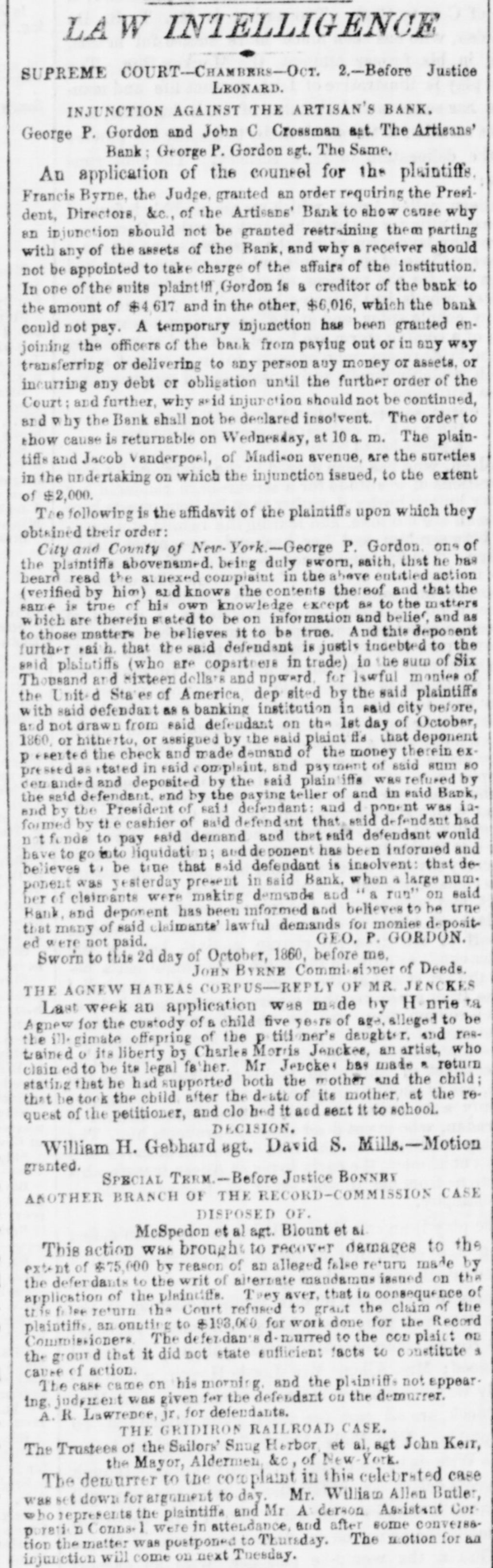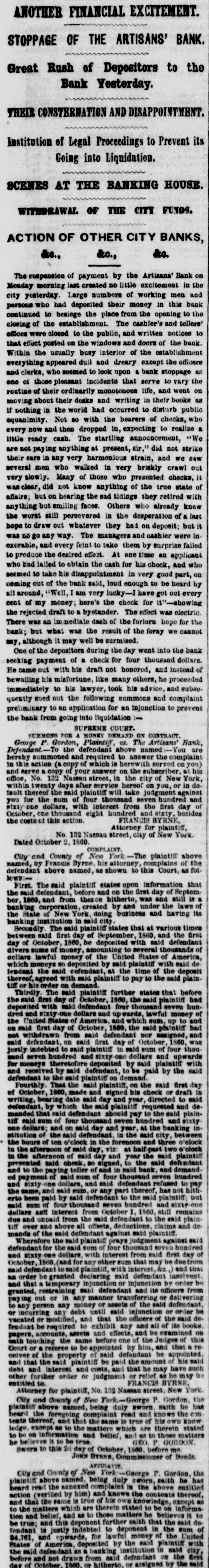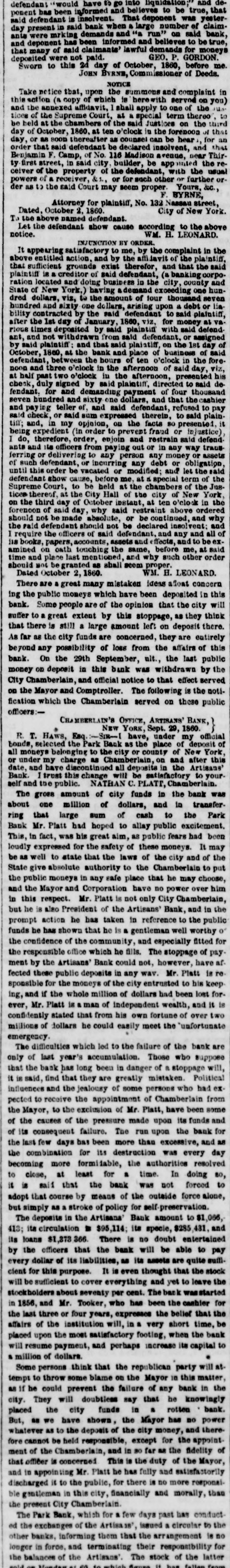 defendant "would have to go into liquidation;" and deponent has been informed and believes to be true, that said defendant is insolvent. That deponent was yesterday present in said bank when a large number of claimants were mrking demands and "a run" on said bank, and deponent has been informed and believes to be true, that many of said claimants' lawful demands for moneys not GEO. P. GORDON deposited were paid. Sworn to this 2d day of October, 1860, before me. JOHN BYRNE, Commissioner of Deeds. NOTICE Take notice tbat, upon the summons and complaint in this action (a copy of which is herewith served on you) and the annexed affidavit, shall apply to one of the Justices of the Supreme Court, at a special term thereo', to be held at the chambers of the said Justices on the third day of October, 1860, at ten o'clock in the forenoon of that day, or as soon thereafter as counsel can be hear for an order that said defendant be declared insolvent, and that Benjamin F. Camp, of No. 116 Madison avenue, near Thirty first street, in said city builder, be app inted the receiver of the property of the defendant, with the usual powers of & receiver, &: or for such other or further order as to the said Court may seem proper. Yours, sc., F. BYRNE, Attorney for plaintiff, No. 132 Nassau street, Dated, October 2, 1860. City of New York. To the above named defendant. Let the defendant show cause according to the above notice. WM. H. LEONARD. INJUNCTION BY ORDER. It appearing satisfactory to me, by the complaint in the above entitled action, and by the affilavit of the plaintiff, that sufficient grounds exist therefor, and that the said plaintiff is creditor of said defendant, (a banking corpo ration located and doing business in the city, county and State of New York,) having a demand exceeding one hundred dollars, viz, to the amount of four thousand seven hundred and sixty one dollars, arising upon a debt or lia to said said defendant the contracted by bility plaintiff, after the 1st day of January, 1860, viz, for money at va. rious times deposited by said plaintin with said defend ant, and not withdrawn from said defendant, or assigned by said plaintiff and that said plaintiff, on the 1st day of October 1860, at the bank and place of business of said of between the ten hours in defendant the o'clock forenoon and three o'clock in the afternoon of said day, viz, at half past two o'clock in the afternoon, presented his 3 said directed desaid duly signed check, by plaintiff, fendant, for and demanding payment of four thousand seven and hundred one and that the cashier dollars, sixty and pay paying teller of, and said defendant, refused to pay said check, or said sum expressed therein, to said plaintill; and, in my opjoion, on the facts 80 presented it being expedient (in order to prevent fraud or injustice) do, therefore, order, enjoin and restrain said defend ants and its officers from paying out or in any way trans ferring or delivering to any person any money or assets of such defendant, or incurring any debt or obligation until this order be vacated or modified; and let the said defendant show cause, before me, at a special term of the Supreme Court, to be held at the chambers of the Jus. tices thereof. at the City Hall of the city of New York on the third day of October instant, at ten o'clock in the forenoon of said day, why said restraint above ordered should not be made absolute, or be continued, and why the Faid defendant should not be declared insolvent: and require the officers of said defendant, and any and all of 118 books, papers, accounts, assets and effects, and to examined on oath touching the same, before me, at said such time other last and and order mentioned, why place should Not be granted as shall seem proper. Dated October 2, 1860. WM. H. LEONARD. There are a great many mistaken ideas afoat concern ing the public moneys which have been deposited in this bank. Some people are of the opinion that the city will suffer to a great extent by this stoppage, as they think that there is still a large amount left on deposit there. As far as the city funds are concerned, they are entirely yond any possibility of loss from the affairs of this bank. On the 29th September, ult., the last public money on deposit in this bank was withdrawn by the City Chamberlain, and official notice to that effect served on the Mayor and Comptroller. The following is the notification which the Chamberlain served on these public officers:CHAMBERLAIN'S OFFICE, ARTISANS' BANK, NEW YORK, Sept. 29, 1860. R. T. HAWS, Esq. :-SIR-1 have, under my official bonds, selected the Park Bank as the place of deposit of all moneys belonging to the city or county of New York, or under my charge as Chamberlain, on and after this all in and have discontinued the Artisans' date, deposits Bank. trust this change will be satisfactory to yourand the NATHAN C. PLATT, Chamberlain. self public. The gross amount of city funds in the bank was about one million of dollars, and in transferring that large sum of cash to the Park Bank Mr. Platt had hoped to allay public excitement. This, in fact, was his great aim, as public fears had been loudly expressed for the safety of these moneys. It may be as well to state that the laws of the city and of the State give absolute authority to the Chamberlain to put the public moneys in any safe place that he may choose, and the Mayor and Corporation have no power over him in this respect. Mr. Platt is not only City Chamberlain, but he is also President of the Artisans' Bank, and in the action reference has taken the he in to prompt public funds he has shown that he is a gentleman well worthy 0' the confidence of the community, and especially fitted for the responsible office which he fills. The stoppage of pay ment by the Artisans' Bank could not, however, have af fected these public deposits in any wav. Mr. Platt is re sponsible for the moneys of the city entrusted to his keep. million the if and been whole