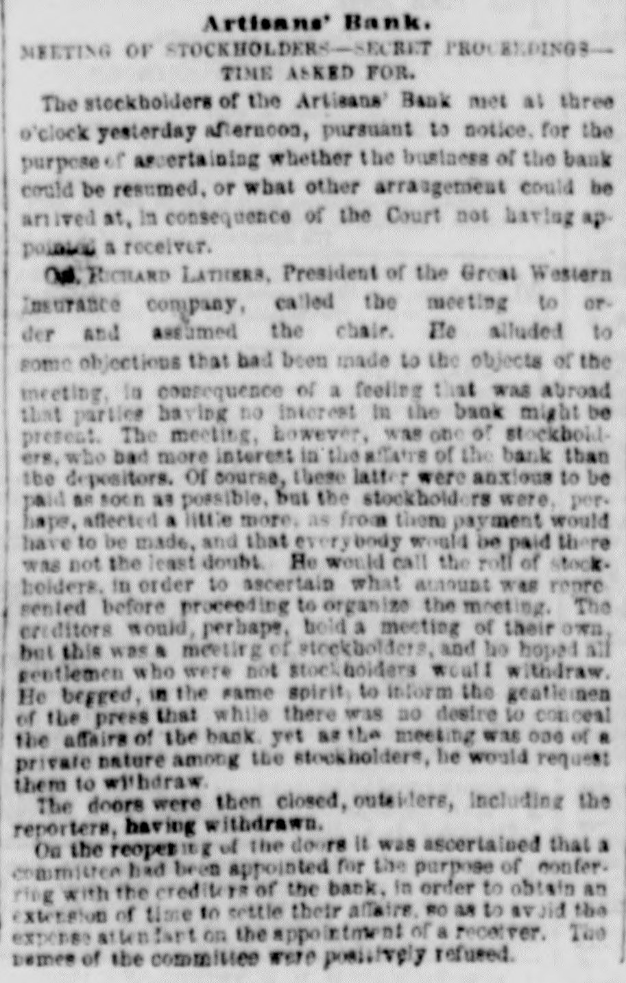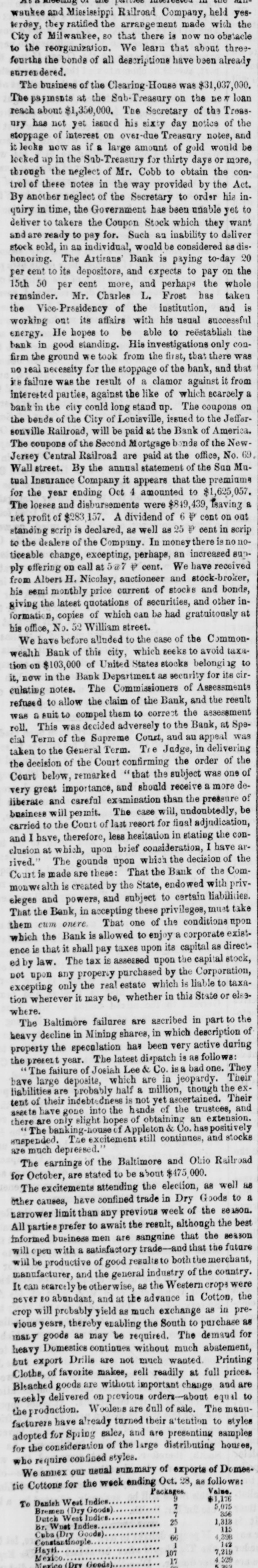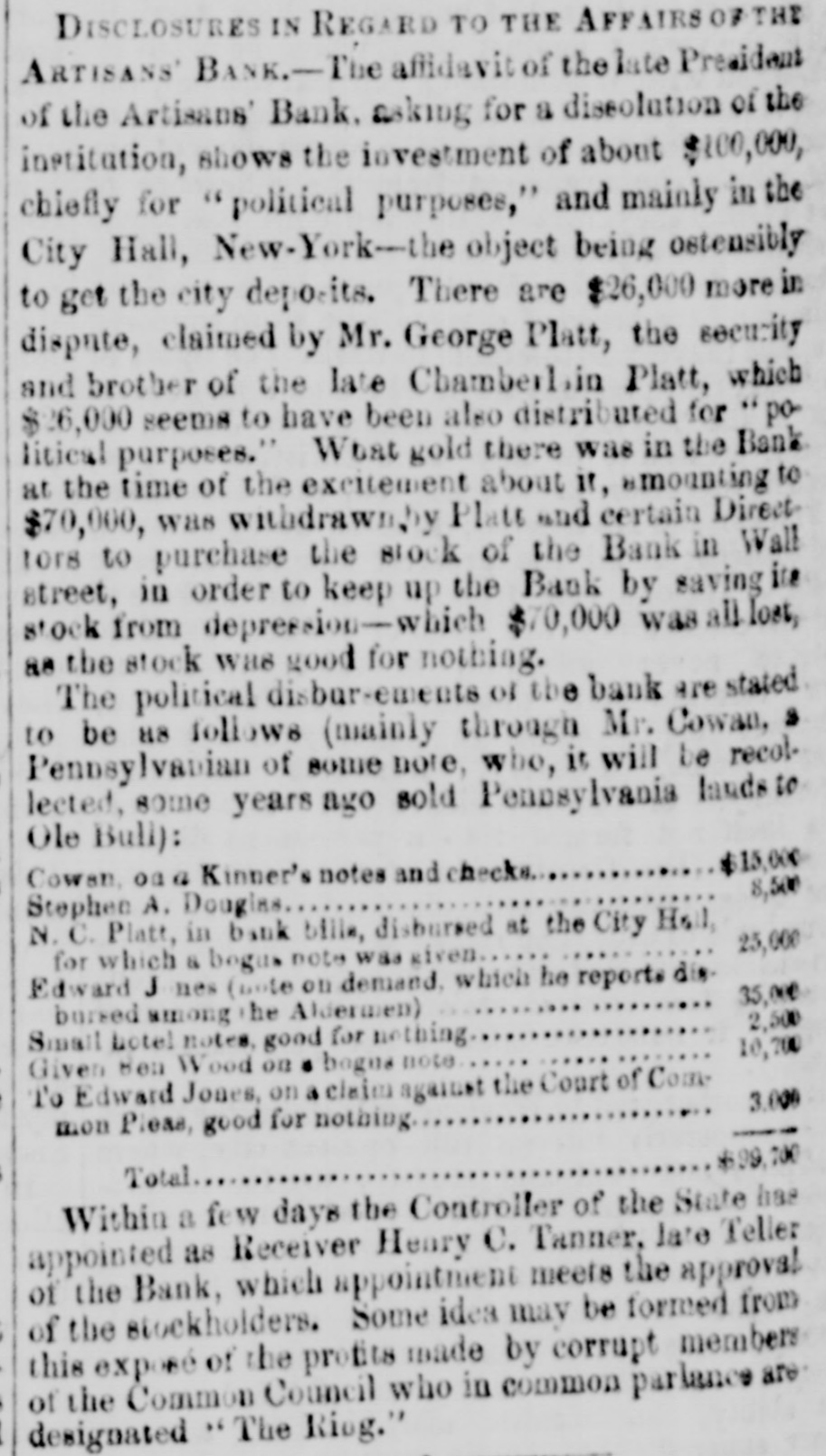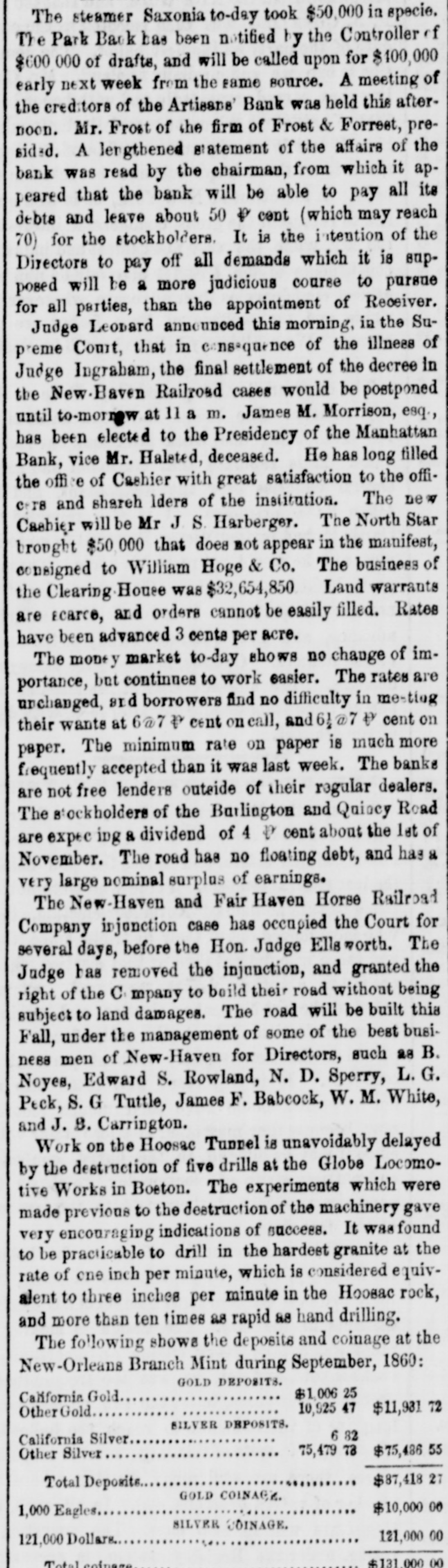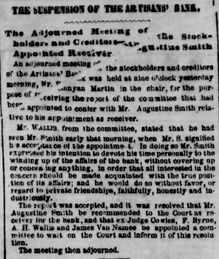 defendant "would have to go into liquidation;" and deponent has been informed and believes to be true, that said defendant is insolvent. That deponent was yesterday present in said bank when a large number of claimants were mrking demands and "a run" on said bank, and deponent has been informed and believes to be true, that many of said claimants' lawful demands for moneys not GEO. P. GORDON deposited were paid. Sworn to this 2d day of October, 1860, before me. JOHN BYRNE, Commissioner of Deeds. NOTICE Take notice tbat, upon the summons and complaint in this action (a copy of which is herewith served on you) and the annexed affidavit, shall apply to one of the Justices of the Supreme Court, at a special term thereo', to be held at the chambers of the said Justices on the third day of October, 1860, at ten o'clock in the forenoon of that day, or as soon thereafter as counsel can be hear for an order that said defendant be declared insolvent, and that Benjamin F. Camp, of No. 116 Madison avenue, near Thirty first street, in said city builder, be app inted the receiver of the property of the defendant, with the usual powers of & receiver, &: or for such other or further order as to the said Court may seem proper. Yours, sc., F. BYRNE, Attorney for plaintiff, No. 132 Nassau street, Dated, October 2, 1860. City of New York. To the above named defendant. Let the defendant show cause according to the above notice. WM. H. LEONARD. INJUNCTION BY ORDER. It appearing satisfactory to me, by the complaint in the above entitled action, and by the affilavit of the plaintiff, that sufficient grounds exist therefor, and that the said plaintiff is creditor of said defendant, (a banking corpo ration located and doing business in the city, county and State of New York,) having a demand exceeding one hundred dollars, viz, to the amount of four thousand seven hundred and sixty one dollars, arising upon a debt or lia to said said defendant the contracted by bility plaintiff, after the 1st day of January, 1860, viz, for money at va. rious times deposited by said plaintin with said defend ant, and not withdrawn from said defendant, or assigned by said plaintiff and that said plaintiff, on the 1st day of October 1860, at the bank and place of business of said of between the ten hours in defendant the o'clock forenoon and three o'clock in the afternoon of said day, viz, at half past two o'clock in the afternoon, presented his 3 said directed desaid duly signed check, by plaintiff, fendant, for and demanding payment of four thousand seven and hundred one and that the cashier dollars, sixty and pay paying teller of, and said defendant, refused to pay said check, or said sum expressed therein, to said plaintill; and, in my opjoion, on the facts 80 presented it being expedient (in order to prevent fraud or injustice) do, therefore, order, enjoin and restrain said defend ants and its officers from paying out or in any way trans ferring or delivering to any person any money or assets of such defendant, or incurring any debt or obligation until this order be vacated or modified; and let the said defendant show cause, before me, at a special term of the Supreme Court, to be held at the chambers of the Jus. tices thereof. at the City Hall of the city of New York on the third day of October instant, at ten o'clock in the forenoon of said day, why said restraint above ordered should not be made absolute, or be continued, and why the Faid defendant should not be declared insolvent: and require the officers of said defendant, and any and all of 118 books, papers, accounts, assets and effects, and to examined on oath touching the same, before me, at said such time other last and and order mentioned, why place should Not be granted as shall seem proper. Dated October 2, 1860. WM. H. LEONARD. There are a great many mistaken ideas afoat concern ing the public moneys which have been deposited in this bank. Some people are of the opinion that the city will suffer to a great extent by this stoppage, as they think that there is still a large amount left on deposit there. As far as the city funds are concerned, they are entirely yond any possibility of loss from the affairs of this bank. On the 29th September, ult., the last public money on deposit in this bank was withdrawn by the City Chamberlain, and official notice to that effect served on the Mayor and Comptroller. The following is the notification which the Chamberlain served on these public officers:CHAMBERLAIN'S OFFICE, ARTISANS' BANK, NEW YORK, Sept. 29, 1860. R. T. HAWS, Esq. :-SIR-1 have, under my official bonds, selected the Park Bank as the place of deposit of all moneys belonging to the city or county of New York, or under my charge as Chamberlain, on and after this all in and have discontinued the Artisans' date, deposits Bank. trust this change will be satisfactory to yourand the NATHAN C. PLATT, Chamberlain. self public. The gross amount of city funds in the bank was about one million of dollars, and in transferring that large sum of cash to the Park Bank Mr. Platt had hoped to allay public excitement. This, in fact, was his great aim, as public fears had been loudly expressed for the safety of these moneys. It may be as well to state that the laws of the city and of the State give absolute authority to the Chamberlain to put the public moneys in any safe place that he may choose, and the Mayor and Corporation have no power over him in this respect. Mr. Platt is not only City Chamberlain, but he is also President of the Artisans' Bank, and in the action reference has taken the he in to prompt public funds he has shown that he is a gentleman well worthy 0' the confidence of the community, and especially fitted for the responsible office which he fills. The stoppage of pay ment by the Artisans' Bank could not, however, have af fected these public deposits in any wav. Mr. Platt is re sponsible for the moneys of the city entrusted to his keep. million the if and been whole