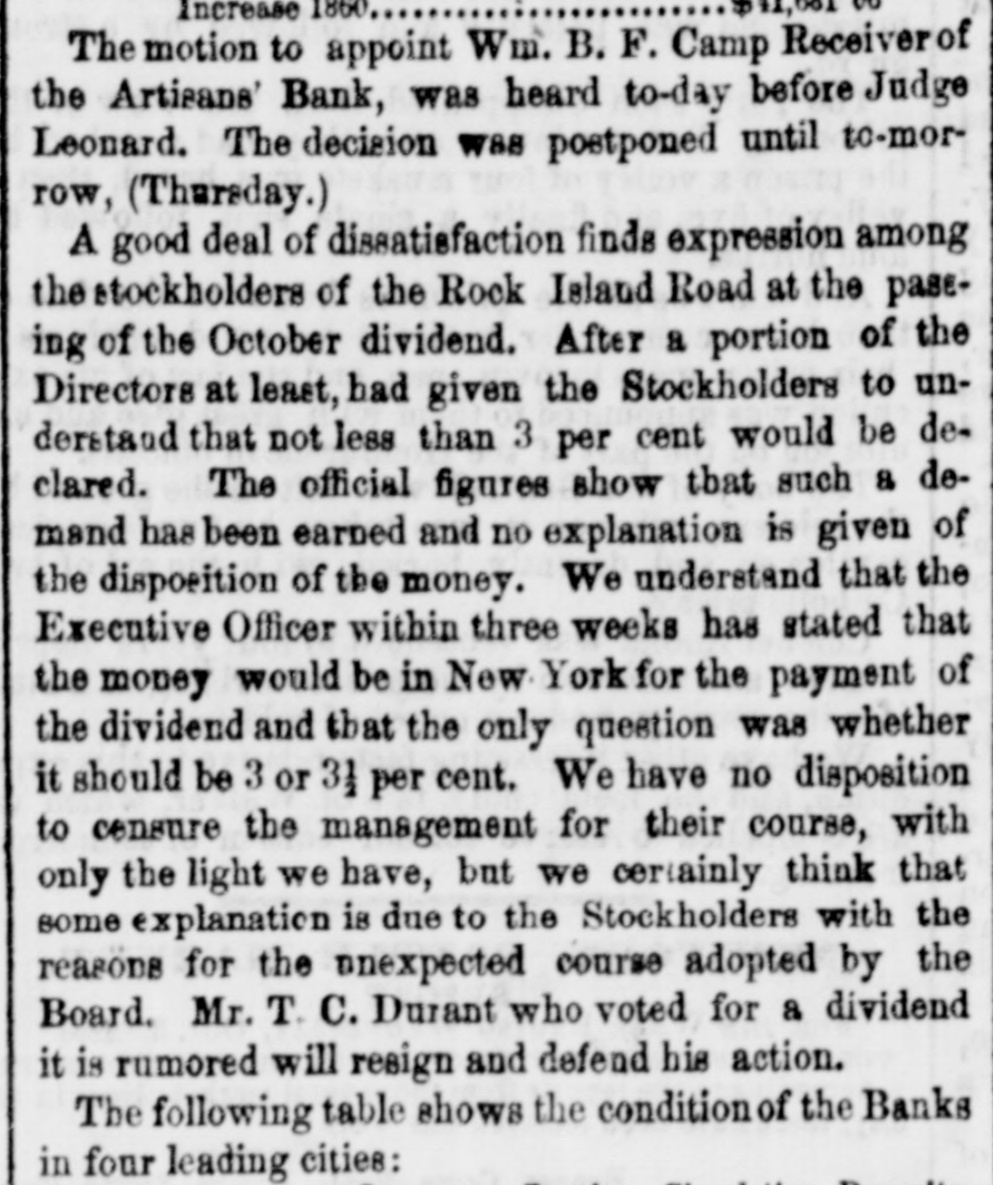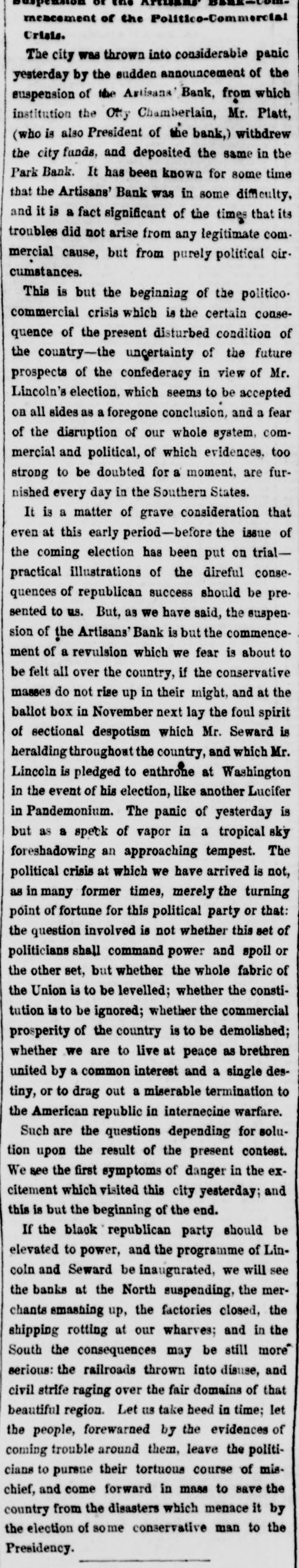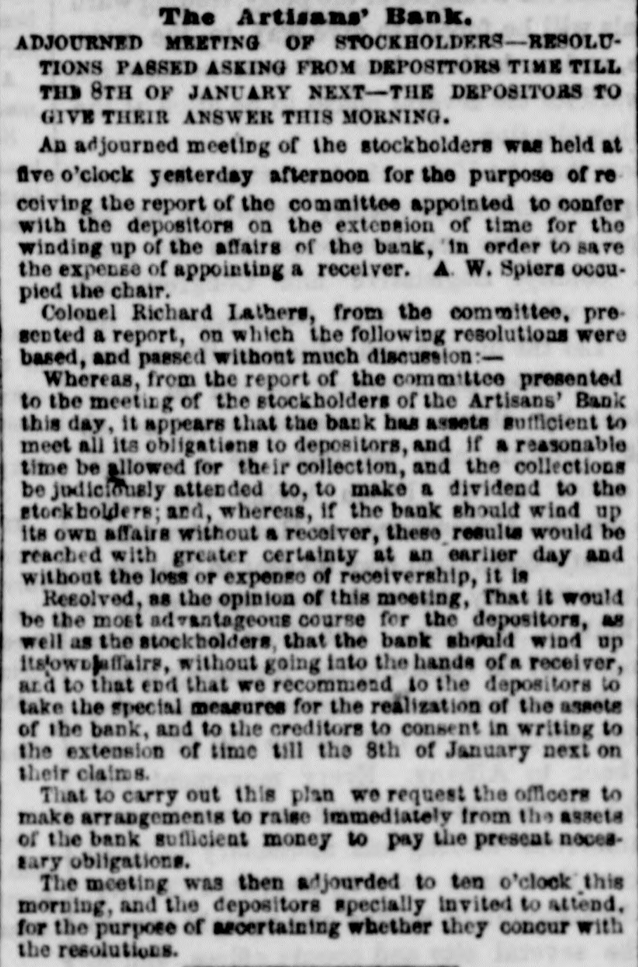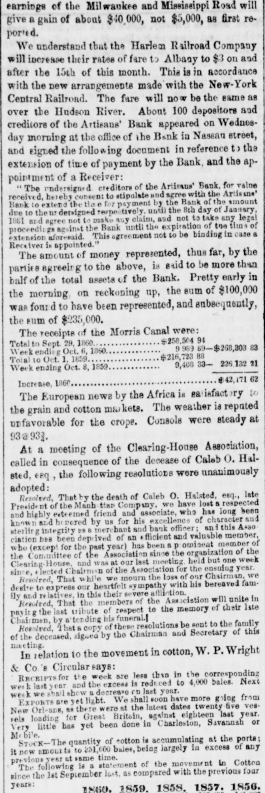 defendant "would have to go into liquidation;" and deponent has been informed and believes to be true, that said defendant is insolvent. That deponent was yesterday present in said bank when a large number of claimants were mrking demands and "a run" on said bank, and deponent has been informed and believes to be true, that many of said claimants' lawful demands for moneys not GEO. P. GORDON deposited were paid. Sworn to this 2d day of October, 1860, before me. JOHN BYRNE, Commissioner of Deeds. NOTICE Take notice tbat, upon the summons and complaint in this action (a copy of which is herewith served on you) and the annexed affidavit, shall apply to one of the Justices of the Supreme Court, at a special term thereo', to be held at the chambers of the said Justices on the third day of October, 1860, at ten o'clock in the forenoon of that day, or as soon thereafter as counsel can be hear for an order that said defendant be declared insolvent, and that Benjamin F. Camp, of No. 116 Madison avenue, near Thirty first street, in said city builder, be app inted the receiver of the property of the defendant, with the usual powers of & receiver, &: or for such other or further order as to the said Court may seem proper. Yours, sc., F. BYRNE, Attorney for plaintiff, No. 132 Nassau street, Dated, October 2, 1860. City of New York. To the above named defendant. Let the defendant show cause according to the above notice. WM. H. LEONARD. INJUNCTION BY ORDER. It appearing satisfactory to me, by the complaint in the above entitled action, and by the affilavit of the plaintiff, that sufficient grounds exist therefor, and that the said plaintiff is creditor of said defendant, (a banking corpo ration located and doing business in the city, county and State of New York,) having a demand exceeding one hundred dollars, viz, to the amount of four thousand seven hundred and sixty one dollars, arising upon a debt or lia to said said defendant the contracted by bility plaintiff, after the 1st day of January, 1860, viz, for money at va. rious times deposited by said plaintin with said defend ant, and not withdrawn from said defendant, or assigned by said plaintiff and that said plaintiff, on the 1st day of October 1860, at the bank and place of business of said of between the ten hours in defendant the o'clock forenoon and three o'clock in the afternoon of said day, viz, at half past two o'clock in the afternoon, presented his 3 said directed desaid duly signed check, by plaintiff, fendant, for and demanding payment of four thousand seven and hundred one and that the cashier dollars, sixty and pay paying teller of, and said defendant, refused to pay said check, or said sum expressed therein, to said plaintill; and, in my opjoion, on the facts 80 presented it being expedient (in order to prevent fraud or injustice) do, therefore, order, enjoin and restrain said defend ants and its officers from paying out or in any way trans ferring or delivering to any person any money or assets of such defendant, or incurring any debt or obligation until this order be vacated or modified; and let the said defendant show cause, before me, at a special term of the Supreme Court, to be held at the chambers of the Jus. tices thereof. at the City Hall of the city of New York on the third day of October instant, at ten o'clock in the forenoon of said day, why said restraint above ordered should not be made absolute, or be continued, and why the Faid defendant should not be declared insolvent: and require the officers of said defendant, and any and all of 118 books, papers, accounts, assets and effects, and to examined on oath touching the same, before me, at said such time other last and and order mentioned, why place should Not be granted as shall seem proper. Dated October 2, 1860. WM. H. LEONARD. There are a great many mistaken ideas afoat concern ing the public moneys which have been deposited in this bank. Some people are of the opinion that the city will suffer to a great extent by this stoppage, as they think that there is still a large amount left on deposit there. As far as the city funds are concerned, they are entirely yond any possibility of loss from the affairs of this bank. On the 29th September, ult., the last public money on deposit in this bank was withdrawn by the City Chamberlain, and official notice to that effect served on the Mayor and Comptroller. The following is the notification which the Chamberlain served on these public officers:CHAMBERLAIN'S OFFICE, ARTISANS' BANK, NEW YORK, Sept. 29, 1860. R. T. HAWS, Esq. :-SIR-1 have, under my official bonds, selected the Park Bank as the place of deposit of all moneys belonging to the city or county of New York, or under my charge as Chamberlain, on and after this all in and have discontinued the Artisans' date, deposits Bank. trust this change will be satisfactory to yourand the NATHAN C. PLATT, Chamberlain. self public. The gross amount of city funds in the bank was about one million of dollars, and in transferring that large sum of cash to the Park Bank Mr. Platt had hoped to allay public excitement. This, in fact, was his great aim, as public fears had been loudly expressed for the safety of these moneys. It may be as well to state that the laws of the city and of the State give absolute authority to the Chamberlain to put the public moneys in any safe place that he may choose, and the Mayor and Corporation have no power over him in this respect. Mr. Platt is not only City Chamberlain, but he is also President of the Artisans' Bank, and in the action reference has taken the he in to prompt public funds he has shown that he is a gentleman well worthy 0' the confidence of the community, and especially fitted for the responsible office which he fills. The stoppage of pay ment by the Artisans' Bank could not, however, have af fected these public deposits in any wav. Mr. Platt is re sponsible for the moneys of the city entrusted to his keep. million the if and been whole