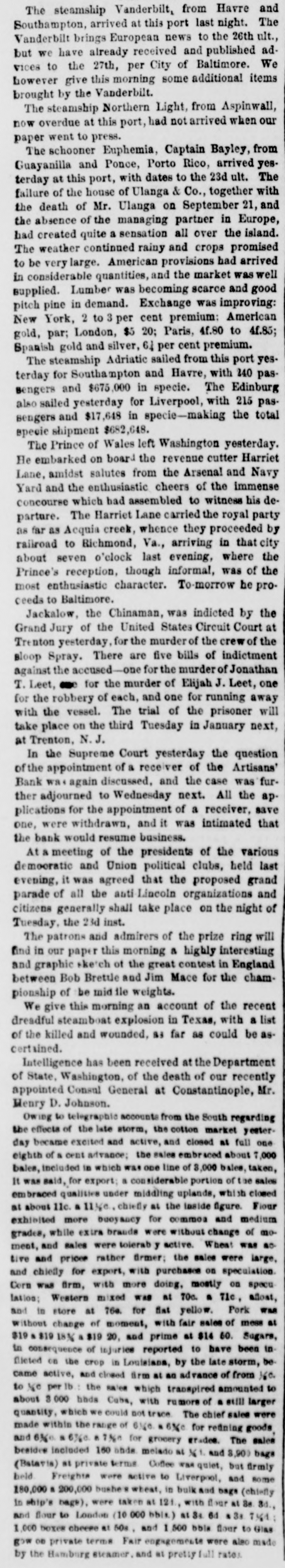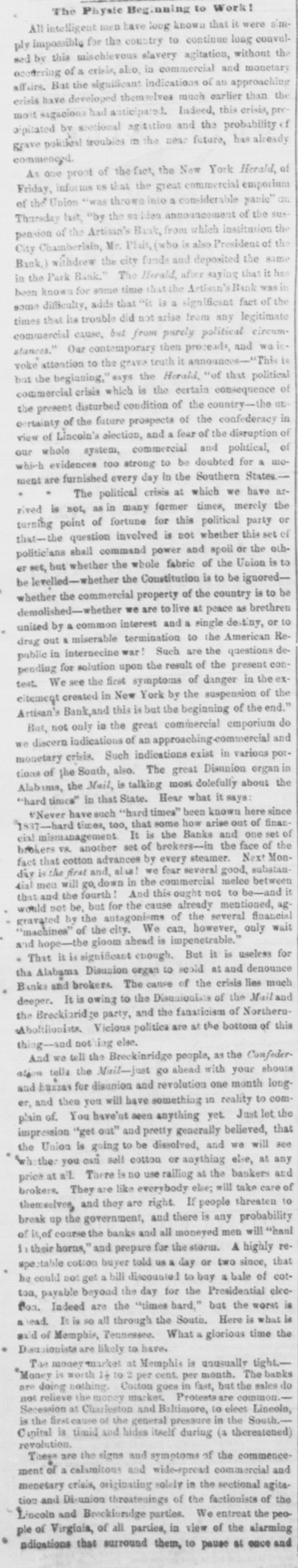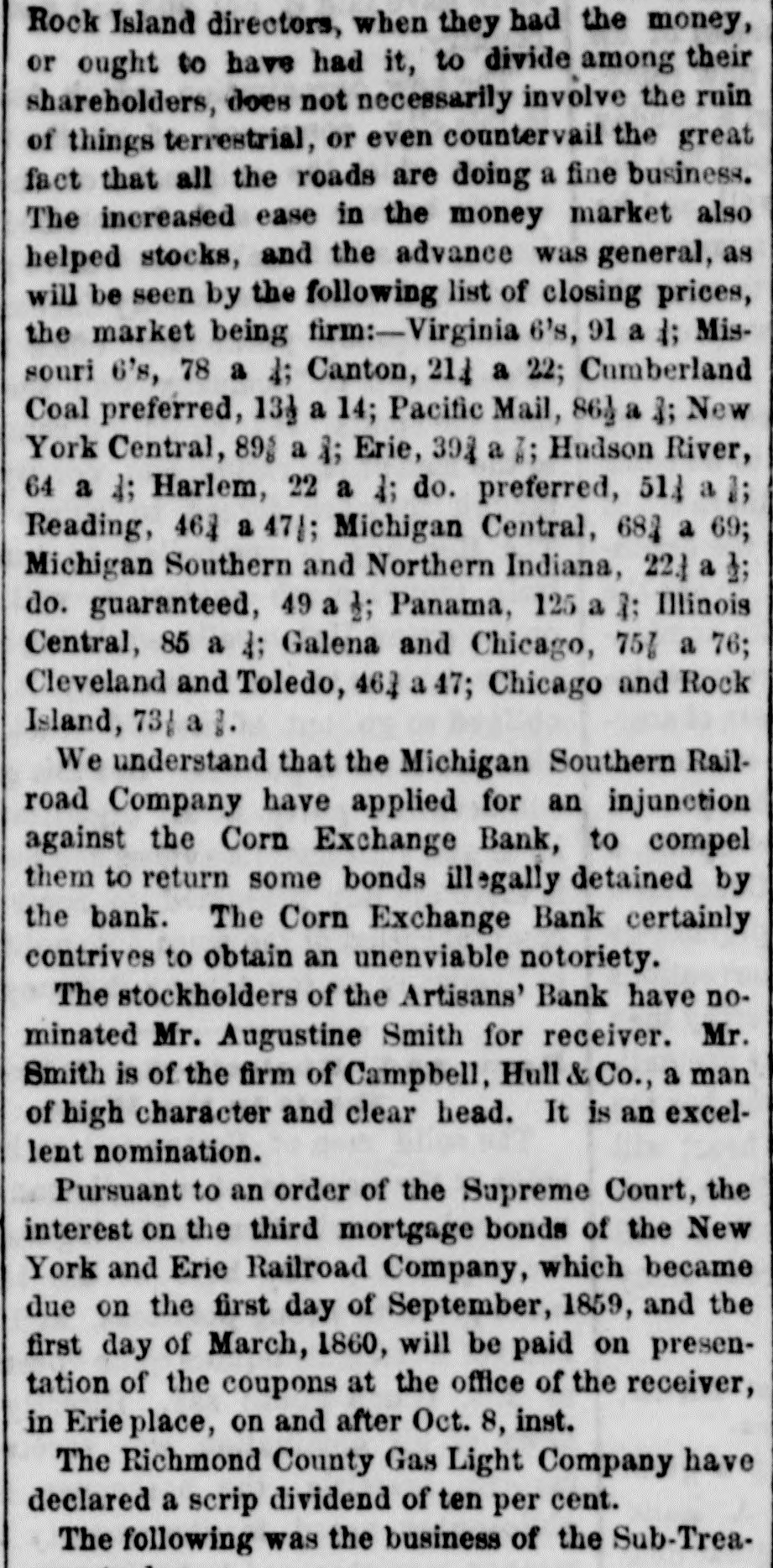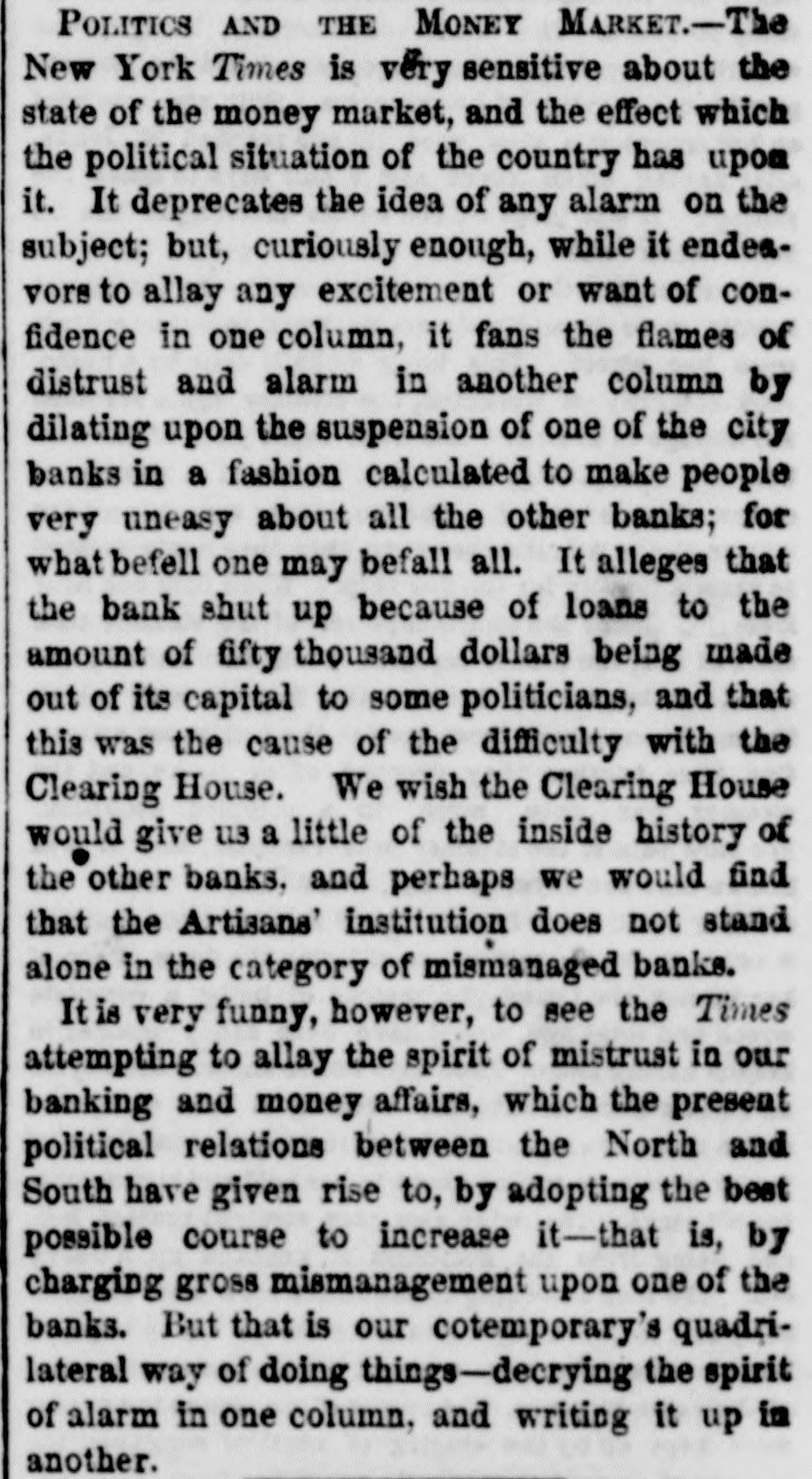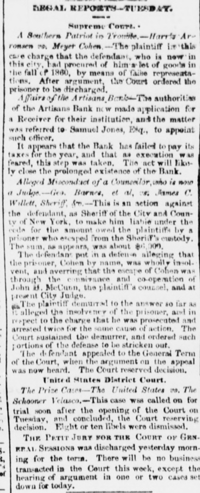 defendant "would have to go into liquidation;" and deponent has been informed and believes to be true, that said defendant is insolvent. That deponent was yesterday present in said bank when a large number of claimants were mrking demands and "a run" on said bank, and deponent has been informed and believes to be true, that many of said claimants' lawful demands for moneys not GEO. P. GORDON deposited were paid. Sworn to this 2d day of October, 1860, before me. JOHN BYRNE, Commissioner of Deeds. NOTICE Take notice tbat, upon the summons and complaint in this action (a copy of which is herewith served on you) and the annexed affidavit, shall apply to one of the Justices of the Supreme Court, at a special term thereo', to be held at the chambers of the said Justices on the third day of October, 1860, at ten o'clock in the forenoon of that day, or as soon thereafter as counsel can be hear for an order that said defendant be declared insolvent, and that Benjamin F. Camp, of No. 116 Madison avenue, near Thirty first street, in said city builder, be app inted the receiver of the property of the defendant, with the usual powers of & receiver, &: or for such other or further order as to the said Court may seem proper. Yours, sc., F. BYRNE, Attorney for plaintiff, No. 132 Nassau street, Dated, October 2, 1860. City of New York. To the above named defendant. Let the defendant show cause according to the above notice. WM. H. LEONARD. INJUNCTION BY ORDER. It appearing satisfactory to me, by the complaint in the above entitled action, and by the affilavit of the plaintiff, that sufficient grounds exist therefor, and that the said plaintiff is creditor of said defendant, (a banking corpo ration located and doing business in the city, county and State of New York,) having a demand exceeding one hundred dollars, viz, to the amount of four thousand seven hundred and sixty one dollars, arising upon a debt or lia to said said defendant the contracted by bility plaintiff, after the 1st day of January, 1860, viz, for money at va. rious times deposited by said plaintin with said defend ant, and not withdrawn from said defendant, or assigned by said plaintiff and that said plaintiff, on the 1st day of October 1860, at the bank and place of business of said of between the ten hours in defendant the o'clock forenoon and three o'clock in the afternoon of said day, viz, at half past two o'clock in the afternoon, presented his 3 said directed desaid duly signed check, by plaintiff, fendant, for and demanding payment of four thousand seven and hundred one and that the cashier dollars, sixty and pay paying teller of, and said defendant, refused to pay said check, or said sum expressed therein, to said plaintill; and, in my opjoion, on the facts 80 presented it being expedient (in order to prevent fraud or injustice) do, therefore, order, enjoin and restrain said defend ants and its officers from paying out or in any way trans ferring or delivering to any person any money or assets of such defendant, or incurring any debt or obligation until this order be vacated or modified; and let the said defendant show cause, before me, at a special term of the Supreme Court, to be held at the chambers of the Jus. tices thereof. at the City Hall of the city of New York on the third day of October instant, at ten o'clock in the forenoon of said day, why said restraint above ordered should not be made absolute, or be continued, and why the Faid defendant should not be declared insolvent: and require the officers of said defendant, and any and all of 118 books, papers, accounts, assets and effects, and to examined on oath touching the same, before me, at said such time other last and and order mentioned, why place should Not be granted as shall seem proper. Dated October 2, 1860. WM. H. LEONARD. There are a great many mistaken ideas afoat concern ing the public moneys which have been deposited in this bank. Some people are of the opinion that the city will suffer to a great extent by this stoppage, as they think that there is still a large amount left on deposit there. As far as the city funds are concerned, they are entirely yond any possibility of loss from the affairs of this bank. On the 29th September, ult., the last public money on deposit in this bank was withdrawn by the City Chamberlain, and official notice to that effect served on the Mayor and Comptroller. The following is the notification which the Chamberlain served on these public officers:CHAMBERLAIN'S OFFICE, ARTISANS' BANK, NEW YORK, Sept. 29, 1860. R. T. HAWS, Esq. :-SIR-1 have, under my official bonds, selected the Park Bank as the place of deposit of all moneys belonging to the city or county of New York, or under my charge as Chamberlain, on and after this all in and have discontinued the Artisans' date, deposits Bank. trust this change will be satisfactory to yourand the NATHAN C. PLATT, Chamberlain. self public. The gross amount of city funds in the bank was about one million of dollars, and in transferring that large sum of cash to the Park Bank Mr. Platt had hoped to allay public excitement. This, in fact, was his great aim, as public fears had been loudly expressed for the safety of these moneys. It may be as well to state that the laws of the city and of the State give absolute authority to the Chamberlain to put the public moneys in any safe place that he may choose, and the Mayor and Corporation have no power over him in this respect. Mr. Platt is not only City Chamberlain, but he is also President of the Artisans' Bank, and in the action reference has taken the he in to prompt public funds he has shown that he is a gentleman well worthy 0' the confidence of the community, and especially fitted for the responsible office which he fills. The stoppage of pay ment by the Artisans' Bank could not, however, have af fected these public deposits in any wav. Mr. Platt is re sponsible for the moneys of the city entrusted to his keep. million the if and been whole