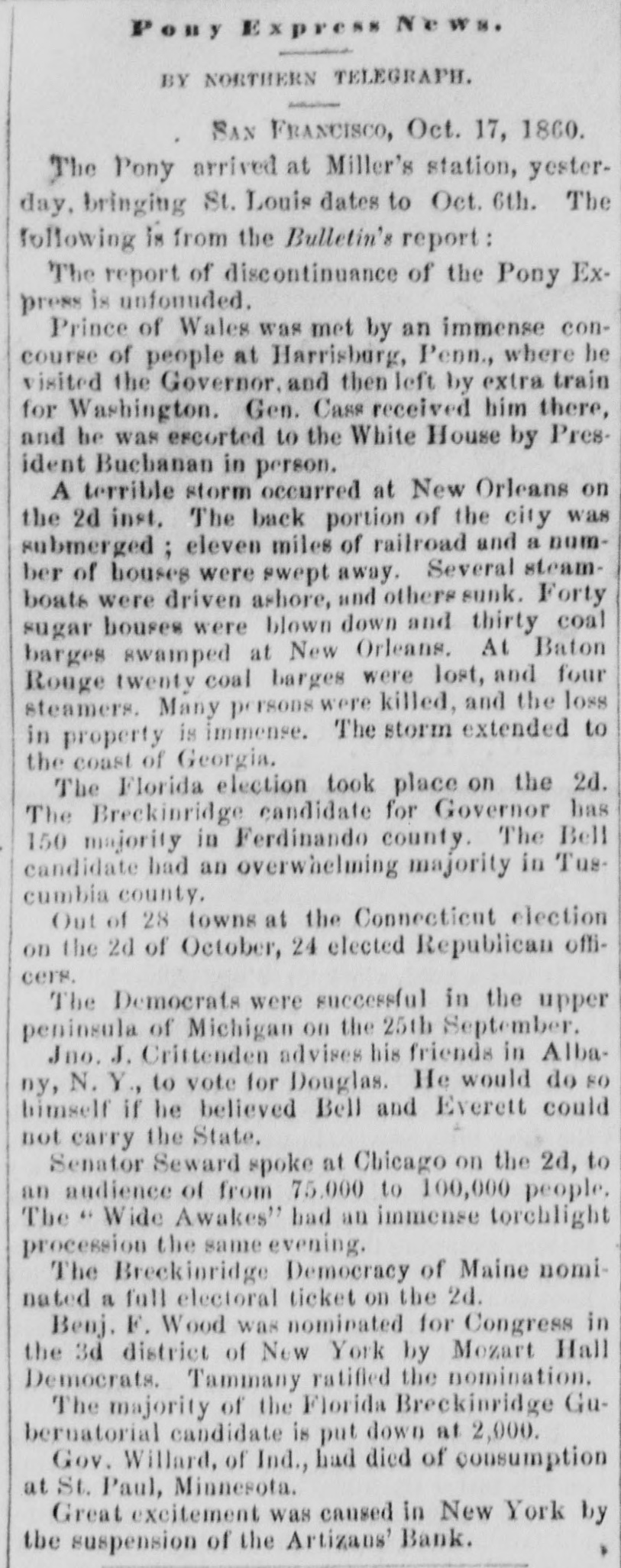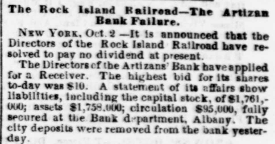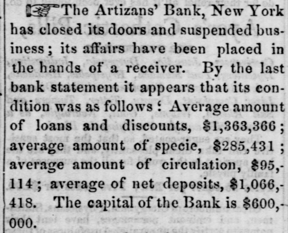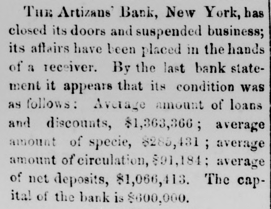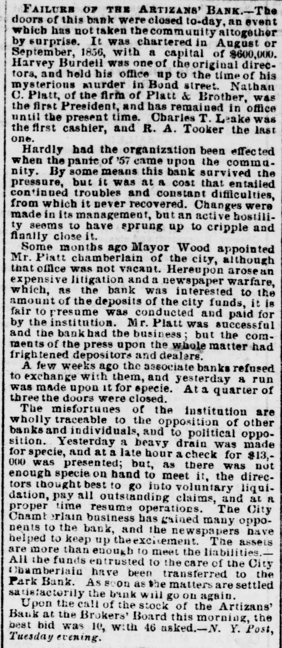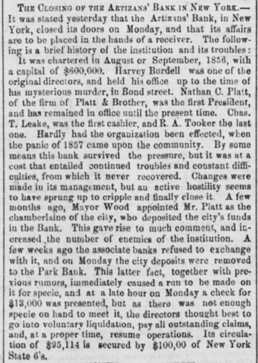 THE CLOSING OF THE Artizans' BANK IN New YORK.It was stated yesterday that the Artizins' Bank, in New York, closed its doors on Monday, and that its affairs are to be placed in the hands of a receiver. The following is a brief history of the institution and its troubles: It was chartered in August or September, 1856, with a capital of $600,000. Harvey Burdell was one of the original directors, and held his office up to the time of his mysterious murder, in Bond street. Nathan C. Platt, of the firm of Platt & Brother, was the first President, and has remained in office until the present time. Chas. T. Leake, was the first cashier, and R. A. Tooker the last one. Hardly had the organization been effected, when the panic of 1857 came upon the community. By some means this bank survived the pressure, but it was at a cost that entailed continued troubles and constant difficulties, from which it never recovered. Changes were made in its management, but au active hostility seems to have sprung up to cripple and finally close it. A few months ago, Mayor Wood appointed Mr. Platt as the chamberlaine of the city, who deposited the city's funds in the Bank. This gave rise to much comment, and increased the number of enemies of the institution. A few weeks ago the associate banks refused to exchange with it, and on Monday the city deposits were removed to the Park Bank. This latter fact, together with previous rumors, immediately caused a run to be made on it for specie, and at a late hour on Monday a check for $13,000 was presented, but as there was not enough specie on hand to meet it, the directors thought best to go into voluntary liquidation, pay all outstanding claims, and, at a proper time, resume operations. Its circulation of $95,114 is secured by $100,00 of New York State 6's.