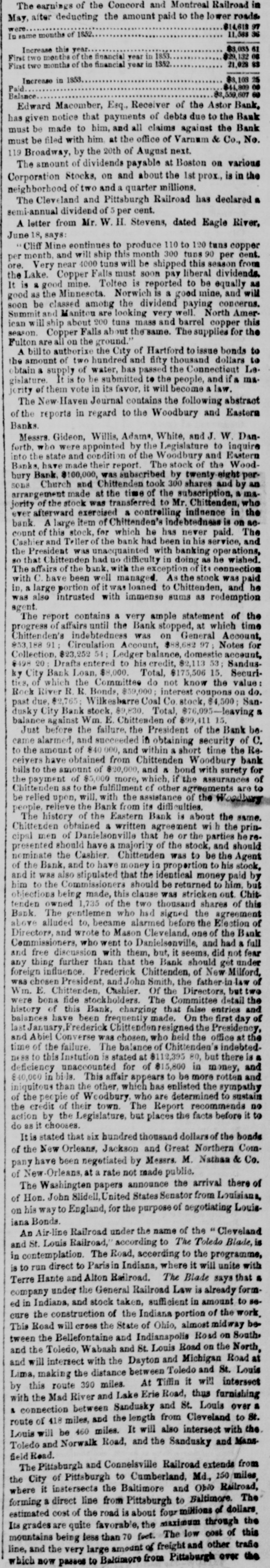 The earnings of the Concord and Montreal Railroad in May, after deducting the amount paid to the lower roads. $14,618 97 were. 11,588 36 In same months of 1852 $3,035 61 Increase this year. $29, 132 08 First two months of the financial year in 1853. 21,028 as First two months of the financial year in 1352. 25 Increase in 1853 $41,809 00 Paid $3,559,607 60 Balance Edward Macomber, Esq., Receiver of the Astor Bank, has given notice that payments of debts due to the Bank must be made to him, and all claims against the Bank must be filed with him at the office of Varnum & Co., No. 119 Broadway, by the 20th of August next. The amount of dividends payable at Boston on various Corporation Stocks, on and about the 1st prox, is in the neighborhood of two and a quarter millions. The Cleveland and Pittsburgh Railroad has declared a semi-annual dividend of 5 per cent. A letter from Mr. W. H. Stevens, dated Eagle River, June 18, says: Cliff Mine eontinues to produce 110 to 120 tuns copper per month, and will ship this month 300 tuns 90 per cent. ore. Very near 4000 tuns will be shipped this season from the Lake. Copper Falls must soon pay liberal dividends. It is a good mine. Toltee is reported to be equally as good as the Minnesota. Norwich is a good mine, and will soon be classed among the dividend paying concerns. Summit and Manitou are looking very well. North American will ship about 200 tuns mass and barrel copper this season. Copper Falls out the same. The supplies for the Fulton are all on the ground." A billto authorixe the City of Hartford to issue bonds to the amount of two hundred and fifty thousand dollars to obtain a supply of water, has passed the Connecticut Le. gislature. It is to be submitted to the people, and if & majority of them vote in its favor, it will become a law. The New Haven Journal contains the following abstract of the reports in regard to the Woodbury and Eastern Banks. Messrs Gideon, Willis, Adams, White, and J. W. Danforth, who were appointed by the Legislature to inquire into the state and condition of the Woodbury and Eastern Banks, have made their report. The stock of the Woodbury Bank, $100,000, was subscribed by twenty eight persons Church and Chittenden took 300 shares and by an arrangement made at the time of the subscription, a majority of the stock was transferred to Mr. Chittenden, who ever afterward exercised & controlling influence in the bank. A large Item of Chittenden's indebtedness is on aecount of this stock, for which he has never paid. The Cashier and Teller of the bank had been in his service, and the President was unacquainted with banking operations, so that Chittenden had no difficulty in doing as he wished. The affairs of the bank, with the exception of its connection with C. have been well managed. As the stock was paid in, a large portion of it was loaned to Chittenden, and he was also intrusted with immense sums as redemption agent. The report contains a very ample statement of the progress of affairs until the Bank stopped, at which time Chittenden's indebtedness was on General Account, 853. 188 91 Circulation Account, $88,682 97 Notes for Collection, $23,252 54; Ledger balance, domestic account, 8498 20 Drafts entered to his credit, $2,113 53; Sandusky City Bank Loan, $8,000. Total, $175,506 15. Securities, of which the Committee do not know the value: Rock River R. R Bonds, $59,000 interest coupons on do. past due, $2,765: Wilkesbarre Coal Co. stock, $4,500; Sandusky City Bank stock, $9,830. Total, $76,095-leaving a balance against Wm. E. Chittenden of $99,411 15. Just before the failure. the President of the Bank became alarmed, and succeeded in obtaining security of C. to the amount of $40 000, and within a short time the Receivers have obtained from Chittenden Woodbury bank bills to the amount of $20,000, and & bond with surety for the payment of $5,000 more, which, if the assurances of Chittenden as to the fulfillment of other agreements are to be relied upon, will, with the assistance of the Koodbury people, relieve the Bank from its difficulties. The history of the Eastern Bank is about the same. Chittenden obtained a written agreement wi h the principal men of Danielsonville that he or the parties he represented should have a majority of the stock, and should nominate the Cashier. Chittenden was to be the Agent of the Bank, and to have money in proportion to his stock, and it was also stipulated that the identical money paid by him to the Commissioners should be returned to him. but objections being made, this clause was stricken out. Chittenden owned 1,735 of the two thousand shares of this Bank. The gentlemen who had signed the agreement above alluded to, became alarmed before the Election of Directors, and wrote to Mason Cleveland, one of the Bank Commissioners, who went to Danielsonville, and had & full and free discussion with them, but, it seems. did not fear any thing further than that the Bank should get under foreign influence. Frederick Chittenden, of New Milford. was chosen President, and John Smith, the father in law of Wm. E. Chittenden, Cashier. Of the Directors, but two were bona fide stockholders. The Committee detail the history of this Bank, charging that false entries and balances have been frequently made. On the first day of last January Frederick Chittendonresigned the Presidency, and Abiel Converse was chosen, who held the office at the time of the failure. The balance of Chittenden's indebtedness to this Instution is stated at $112,395 80, but there is a deficiency unaccounted for of $15,800 in money, and $40,000 in ls. This affair appears to be more rotten and iniquitous than the other, which has enlisted the sympathy of the peopie of Woodbury, who are determined to sustain the credit of their town. The Report recommends no action by the Legislature, but places the facts before it to do as it chooses. Itis stated that six hundred thousand dollars of the bonds of the New Orleans, Jackson and Great Northern