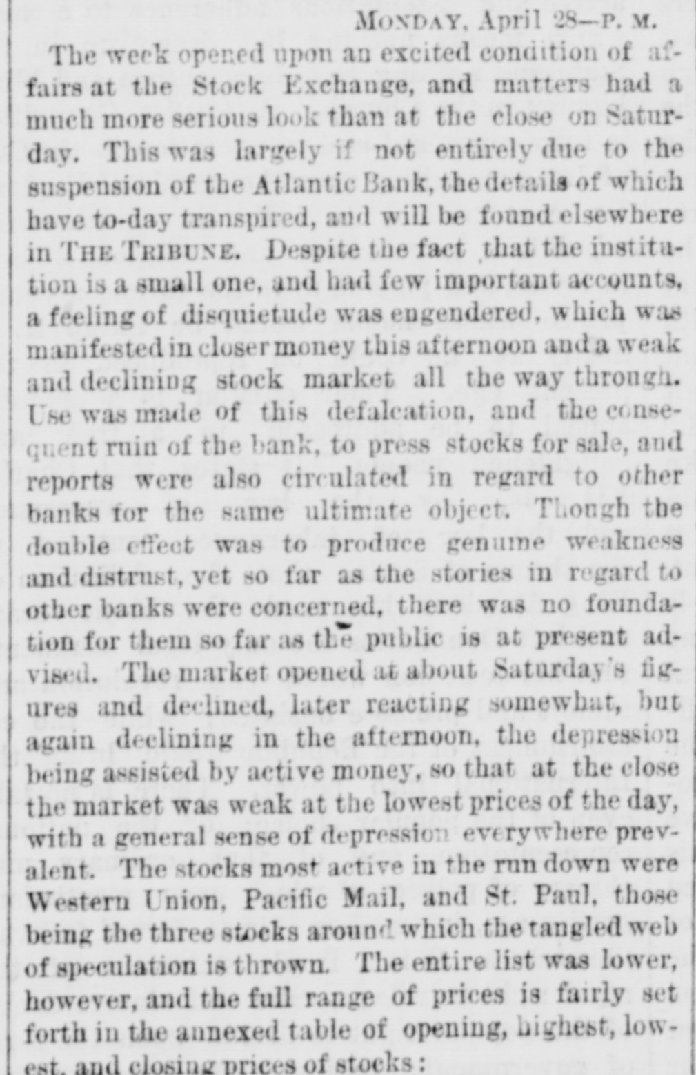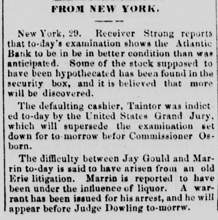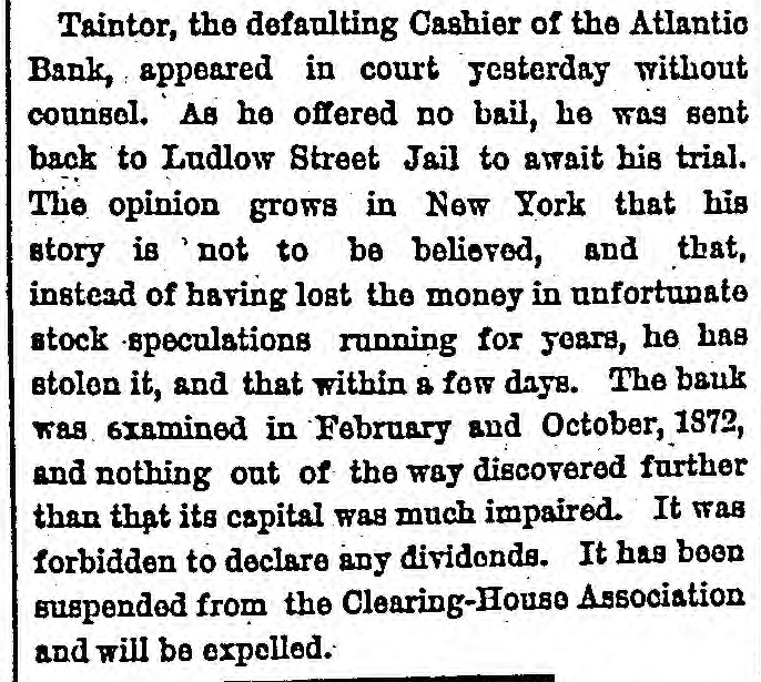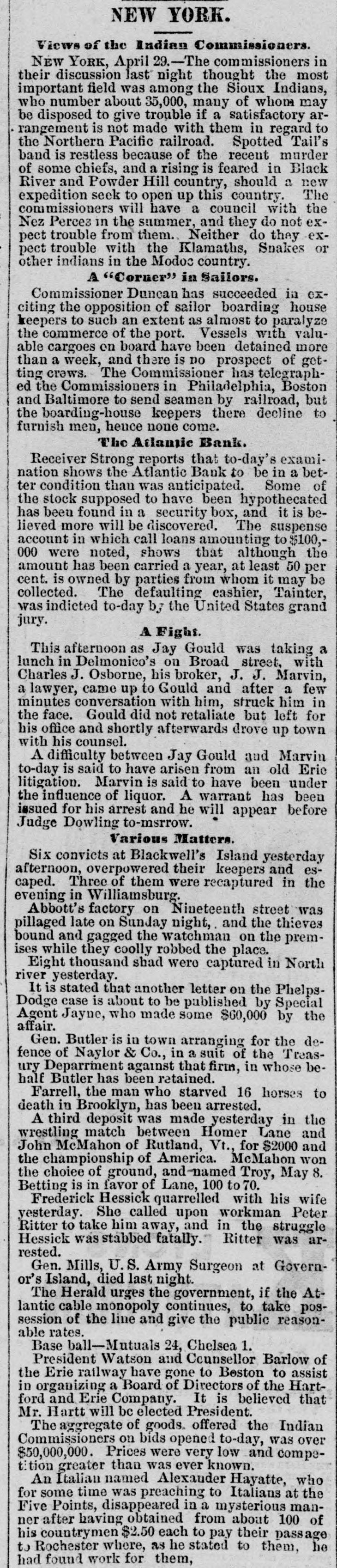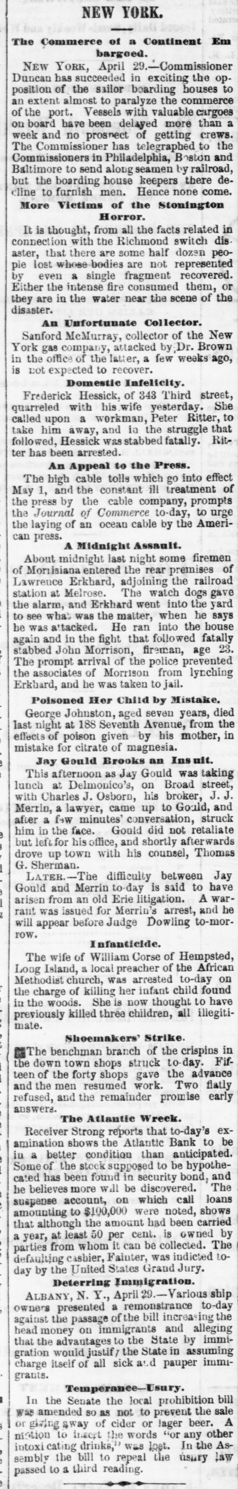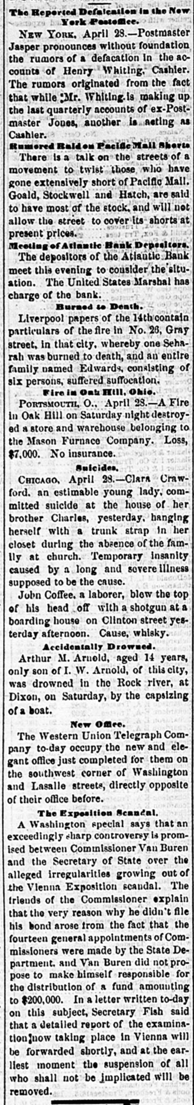 The Reported Defalcation in the New York Postofice. NEW YORK. April 28.-Postmaster Jasper pronounces without foundation the rumors of a defacation In the accounts of Henry Whiting. Cashier. The rumors originated from the fact that while Mr. Whiting is making up the last quarterly accounts of ex-Postmaster Jones, another is acting as Cashier. Rumored Raidon Pacific Mail Shorts There is a talk on the streets of a movement to twist those who have gone extensively short of Pacific Mail. Goald, Stockwell and Hatch, are said to have most of the stock. and will not allow the street to cover its shorts present prices. Meeting of Atlantic Bank Depositors. The depositors of the Atlantic Bank meet this evening to consider the situation. The United States Marshal has charge of the bank. Burned so Death. Liverpool papers of the 14th contain particulars of the fire in No. 26, Gray street, in that city. whereby one Seharah was burned to death, and an entire family named Edwards, consisting of six persons, suffered suffocation. Fire in Oak Hill. Ohio. PORTSMOUTH 0., April 28.-A in Oak Hill on Saturday night destroyed a store and warehouse belonging to the Mason Furnace Company. Loss, $7,000. No insurance. Suicides. CHICAGO. April 28.-Clara Crawford. an estimable young lady. committed suicide at the house of her brother Charles, yesterday. hanging herself with a trunk strap in her closet during the absence of the family at church. Temporary insanity caused by a long and sovere illness supposed to be the cause. John Coffee. a laborer, blew the top of his head off with a shotgun at boarding house on Clinton street yesterday afternoon. Cause, whisky. Accidentally Drowned. Arthur M. Arnold, aged 14 years, only son of I. W. Arnold, of this city, was drowned in the Rock river, at Dixon, on Saturday, by the capsizing of a boat. New Office. The Western Union Telegraph Comoccupy the new eleoffice just gant pany to-day completed for and them on the southwest corner of Washington and Lasalle streets, directly opposite of their office before. The Exposition Scandal. A Washington special says that an exceedingly sharp controversy is promised between Commissioner Van Buren and the Secretary of State over the alleged irregularities growing out of the Vienna Exposition scandal. The friends of the Commissioner explain that the very reason why he didn't file his bond arose from the fact that the fourteen general appointments of Commissioners were made by the State Department. and Van Buren did not propose to make himself responsible for the distribution of a fund amounting to $200,000. In a letter written to-day on this subject, Secretary Fish said that a detailed report of the examinationgnow taking place in Vienna will be forwarded shortly, and at the earliest moment the suspension of all who shall not be implicated will be removed.