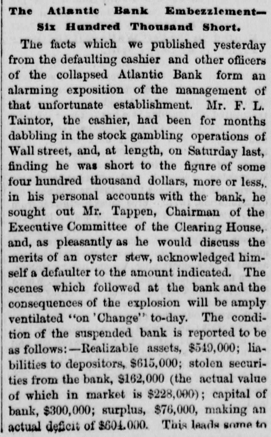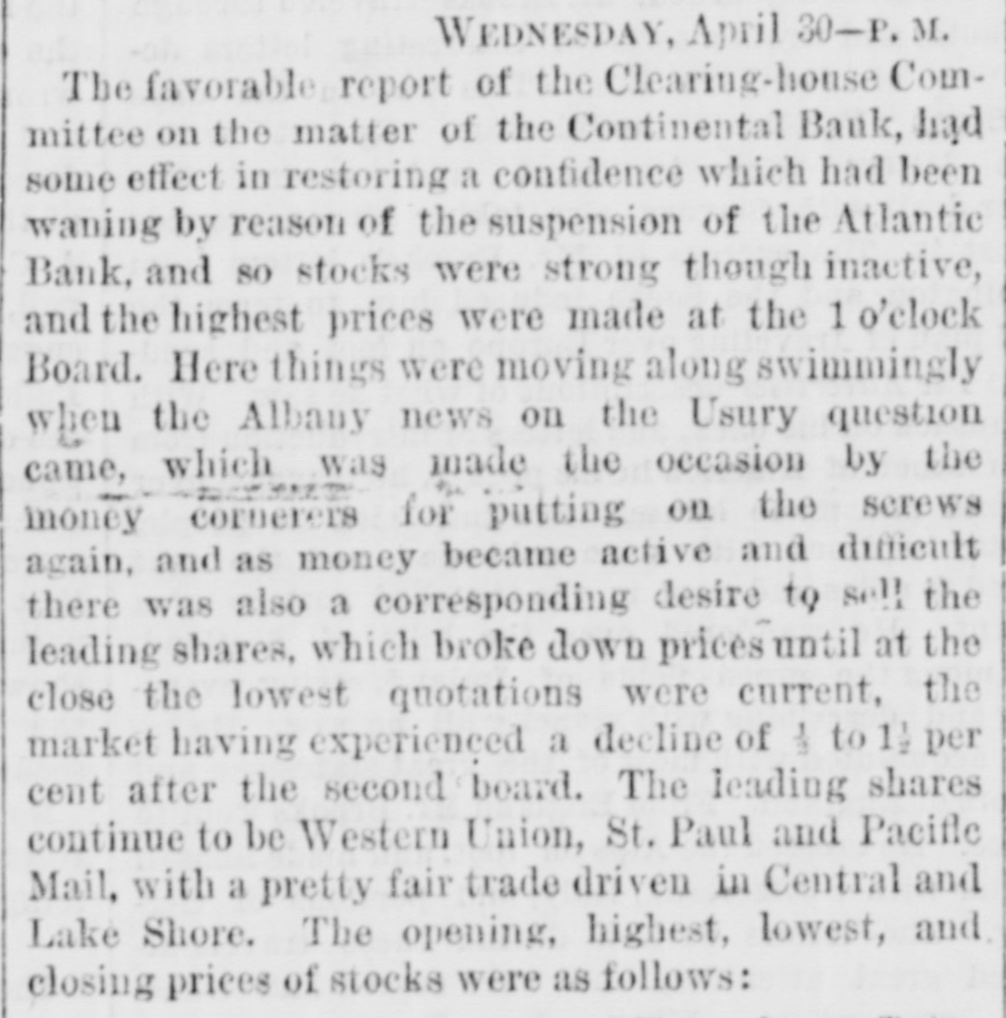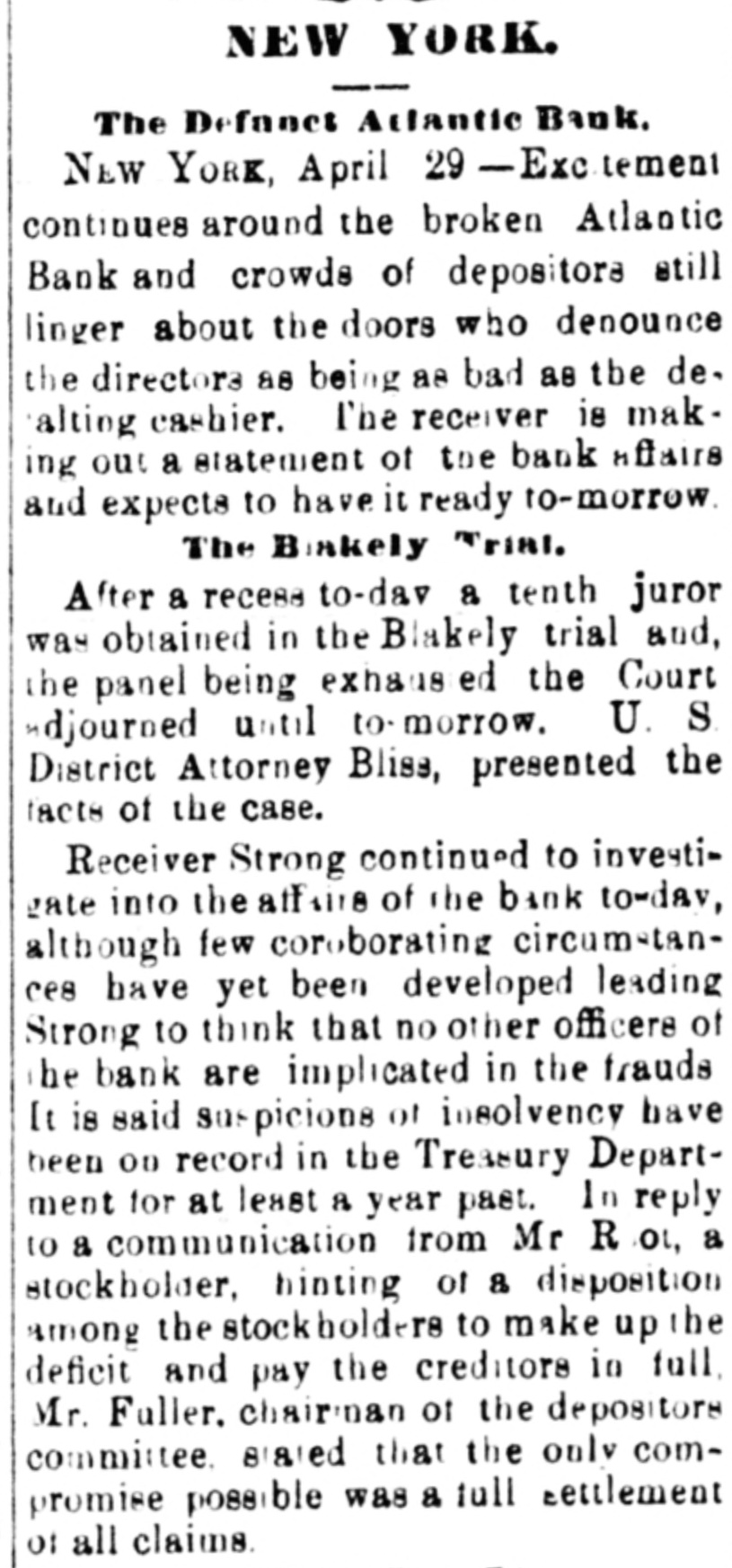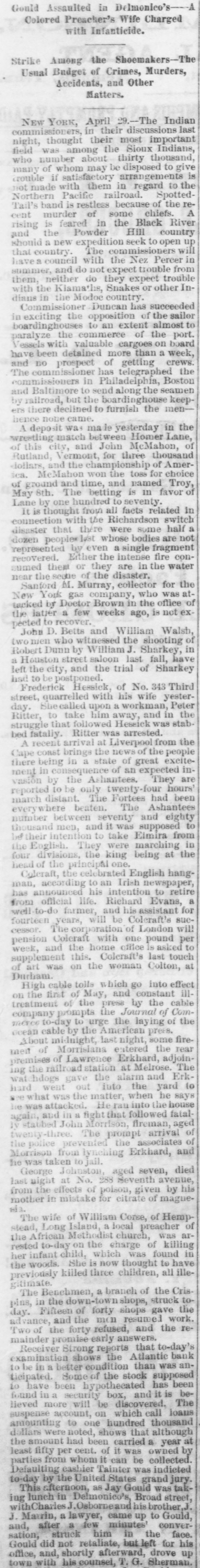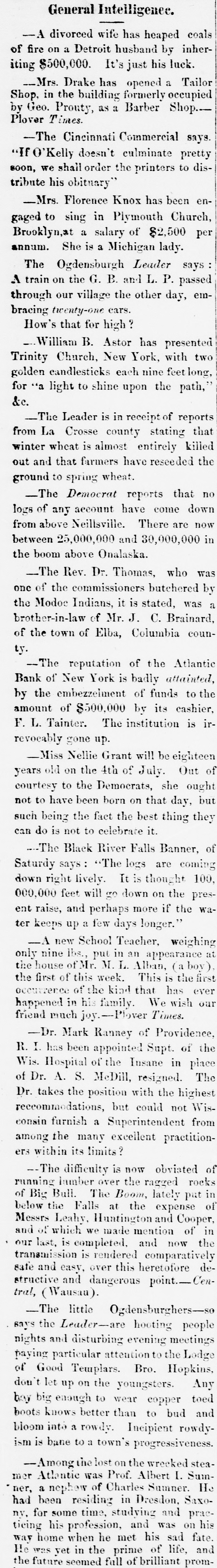 The Reported Defalcation in the New York Postofice. NEW YORK. April 28.-Postmaster Jasper pronounces without foundation the rumors of a defacation In the accounts of Henry Whiting. Cashier. The rumors originated from the fact that while Mr. Whiting is making up the last quarterly accounts of ex-Postmaster Jones, another is acting as Cashier. Rumored Raidon Pacific Mail Shorts There is a talk on the streets of a movement to twist those who have gone extensively short of Pacific Mail. Goald, Stockwell and Hatch, are said to have most of the stock. and will not allow the street to cover its shorts present prices. Meeting of Atlantic Bank Depositors. The depositors of the Atlantic Bank meet this evening to consider the situation. The United States Marshal has charge of the bank. Burned so Death. Liverpool papers of the 14th contain particulars of the fire in No. 26, Gray street, in that city. whereby one Seharah was burned to death, and an entire family named Edwards, consisting of six persons, suffered suffocation. Fire in Oak Hill. Ohio. PORTSMOUTH 0., April 28.-A in Oak Hill on Saturday night destroyed a store and warehouse belonging to the Mason Furnace Company. Loss, $7,000. No insurance. Suicides. CHICAGO. April 28.-Clara Crawford. an estimable young lady. committed suicide at the house of her brother Charles, yesterday. hanging herself with a trunk strap in her closet during the absence of the family at church. Temporary insanity caused by a long and sovere illness supposed to be the cause. John Coffee. a laborer, blew the top of his head off with a shotgun at boarding house on Clinton street yesterday afternoon. Cause, whisky. Accidentally Drowned. Arthur M. Arnold, aged 14 years, only son of I. W. Arnold, of this city, was drowned in the Rock river, at Dixon, on Saturday, by the capsizing of a boat. New Office. The Western Union Telegraph Comoccupy the new eleoffice just gant pany to-day completed for and them on the southwest corner of Washington and Lasalle streets, directly opposite of their office before. The Exposition Scandal. A Washington special says that an exceedingly sharp controversy is promised between Commissioner Van Buren and the Secretary of State over the alleged irregularities growing out of the Vienna Exposition scandal. The friends of the Commissioner explain that the very reason why he didn't file his bond arose from the fact that the fourteen general appointments of Commissioners were made by the State Department. and Van Buren did not propose to make himself responsible for the distribution of a fund amounting to $200,000. In a letter written to-day on this subject, Secretary Fish said that a detailed report of the examinationgnow taking place in Vienna will be forwarded shortly, and at the earliest moment the suspension of all who shall not be implicated will be removed.